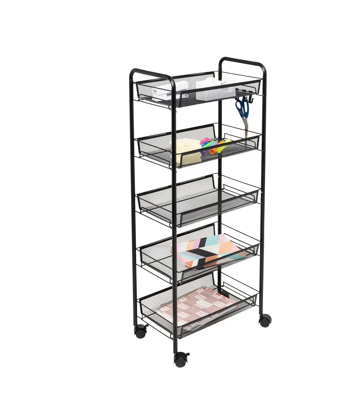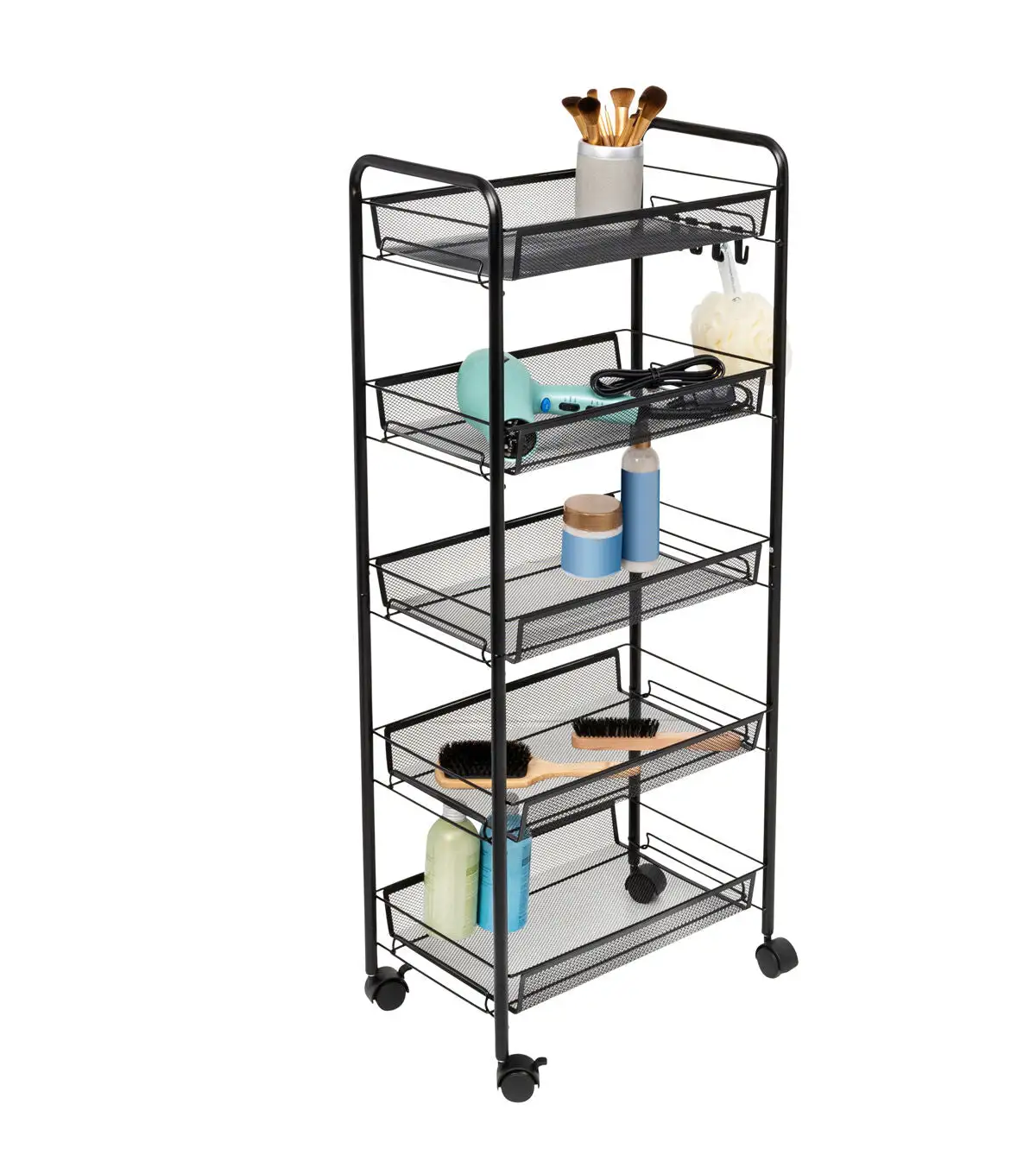 Honey Can Do 17.5 x 41 Black 5 Tier Storage Cart With 4 Hooks & Wheels