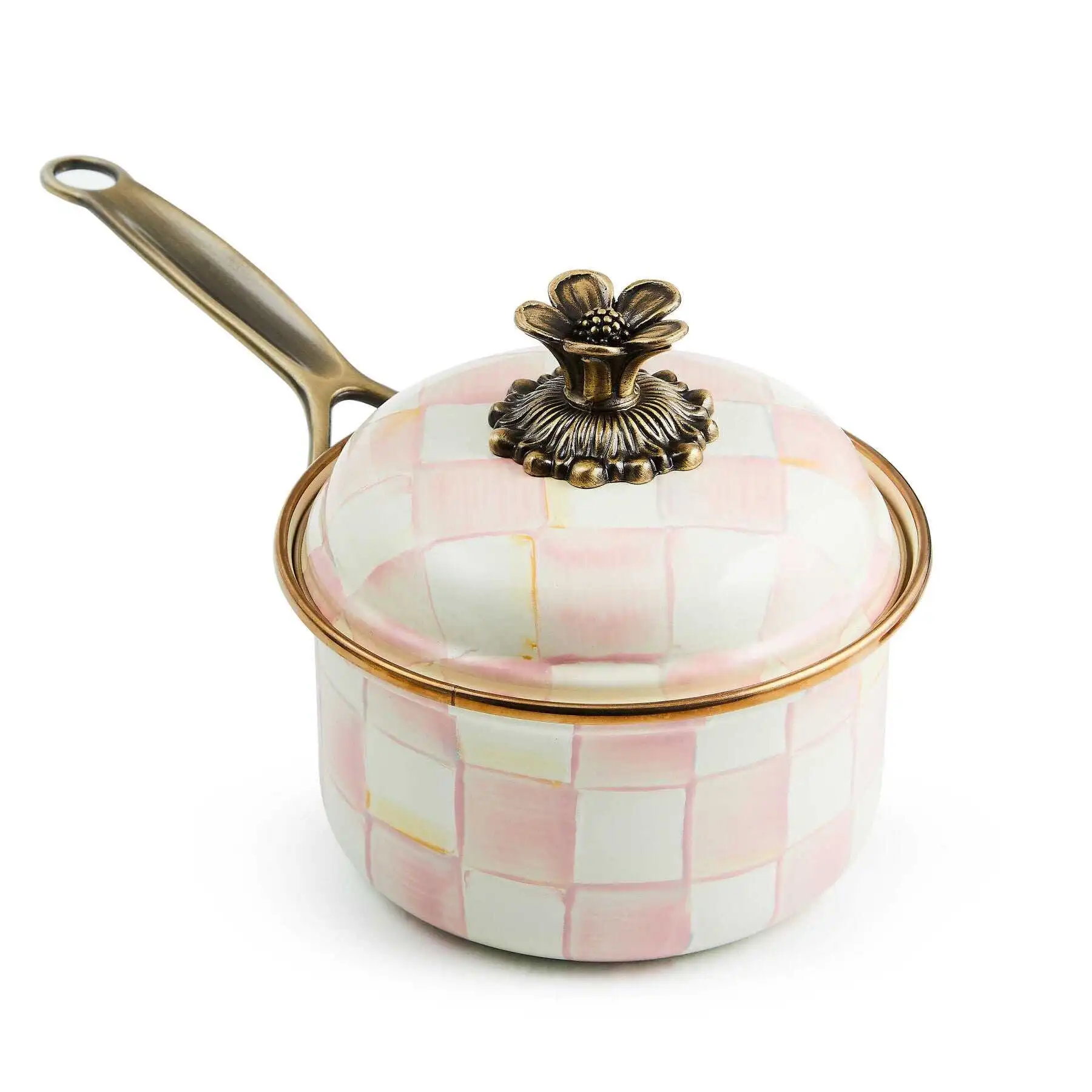 Mackenzie-Childs Rosy Check Enamel 1 Qt. Saucepan