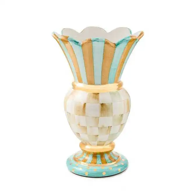 Royal Check: Great lines. Great gift. Our handcrafted ceramic Royal Check Great Vase—mixing color-dragged Royal Checks, vibrant stripes, and gold lustre accents—is hand-painted by our artisans here in Aurora, New York. Turn it over and you’ll see the stamps of each of the artisans who had a hand in its creation. Generously sized for an impressive presentation.