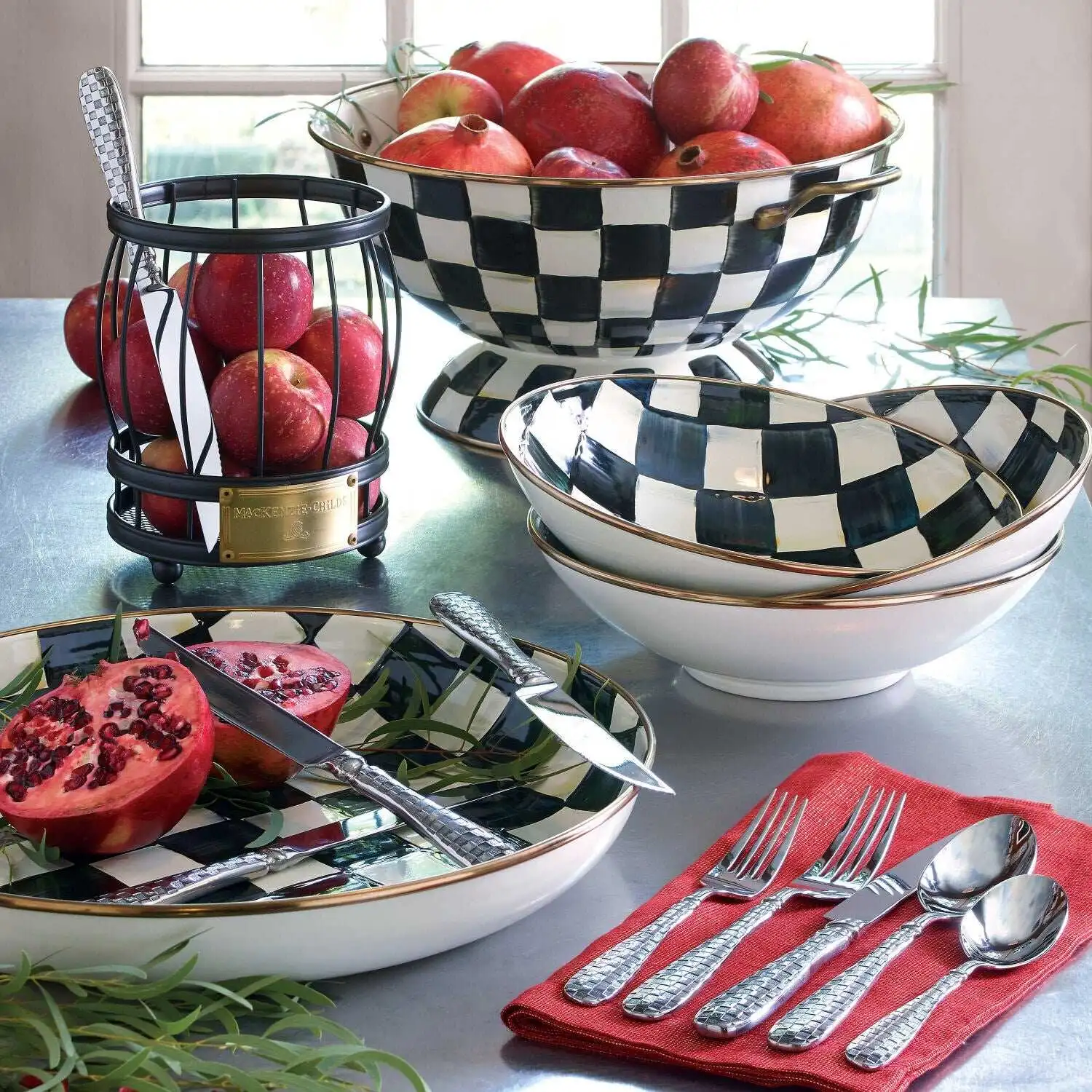 Add a versatile do-it-all piece to your kitchen and table. The Courtly Check? Enamel Abundant Bowl handles serving in style. Its upturned edge is especially handy for presenting main courses that have a bit more sauce, like a heaping bowl of pasta. Heavy-gauge, hand-glazed steel underbody with hand-painted Courtly Checks? and a bronzed stainless-steel rim.