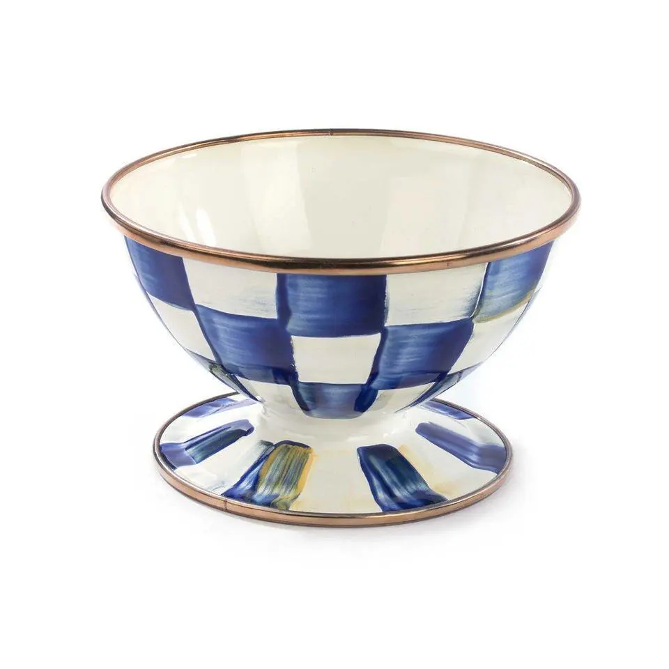 Scoop up signature style with our Royal Check Ice Cream Dish. The deep bowl and pretty pedestal are decked in our hand-painted blue checks and rimmed in bronzed stainless steel. Spectacular in a set for a birthday party treat and equally splendid for satisfying a solo sundae craving
