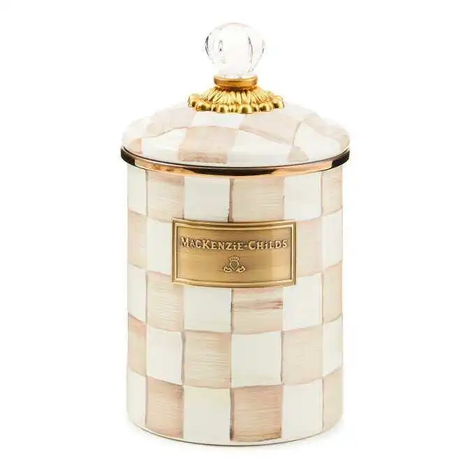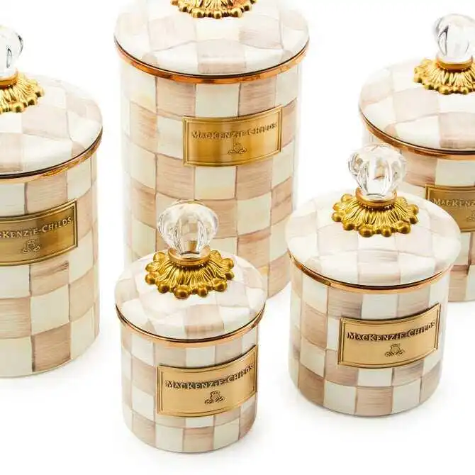 Pantry staples, flour, sugar, and coffee might seem the most obvious of contents with which to fill Courtly Check Enamel Canisters, but the possibilities are endless! Keep them in the kitchen with coffee beans and tea bags, cookies and candies, or dog biscuits and birdseed, or invent new uses around the house. Each enameled steel canister is hand-painted with our signature black and white color-dragged checks and topped with an elegant knob. These canisters stand handsomely alone or harmonize delightfully in a set.