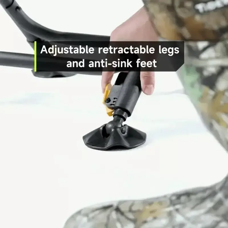 🔍 360° Silent Rotation: Scan your surroundings without spooking your prey. The chair features adjustable height legs from 18" to 20.5", accommodating various users. Its easy setup and storage make it portable, with a Velcro design and adjustable shoulder strap.