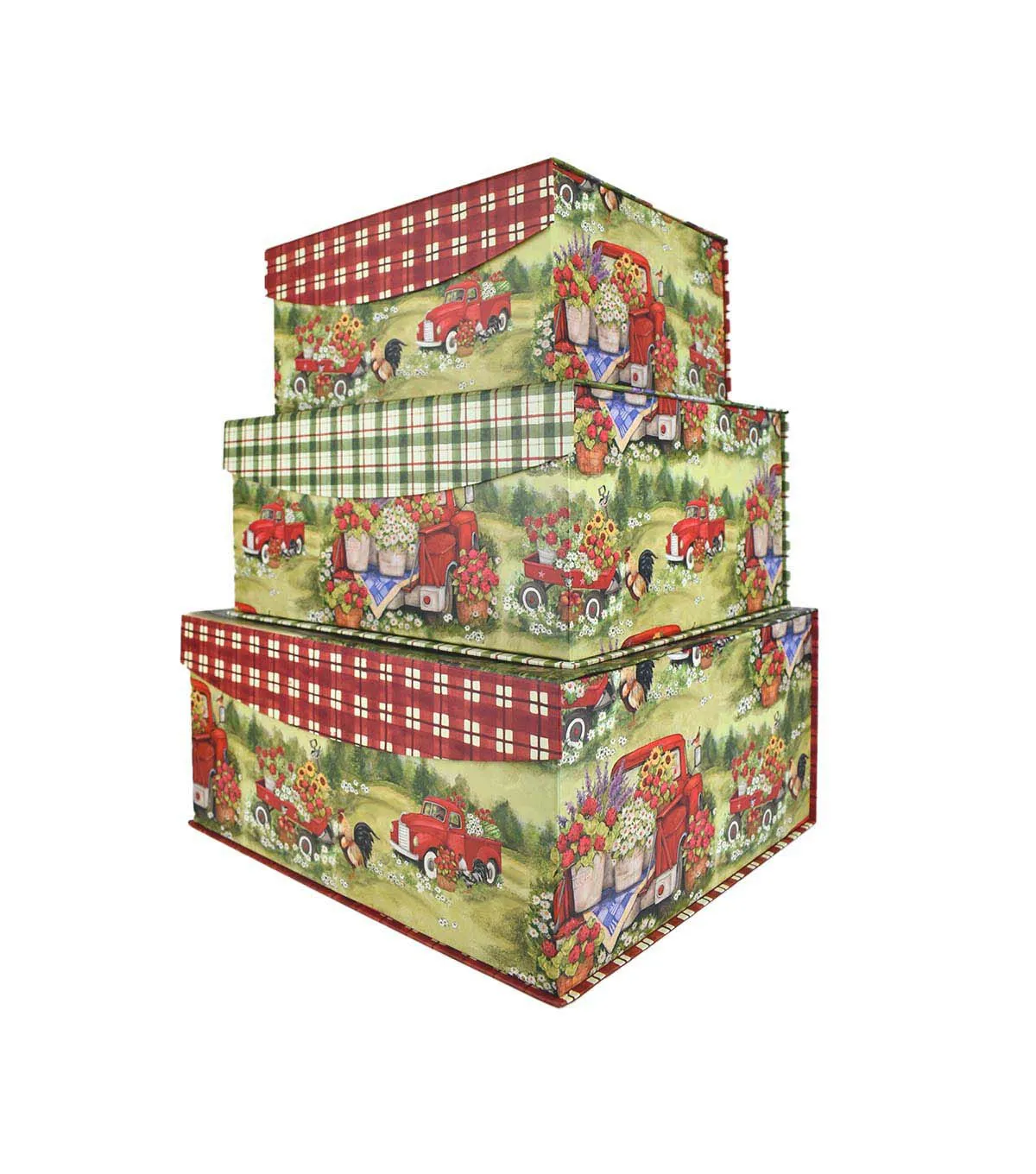 Bring a touch of rustic charm to your home decor with this 12' Red Truck With Flowers Flip Top Box by Place & Time. Perfect for storing your craft supplies, this box features a beautiful red truck with flowers design that will add a pop of color to any room. The flip top lid makes it easy to access your supplies, while the sturdy paperboard construction ensures that it will last for years to come.