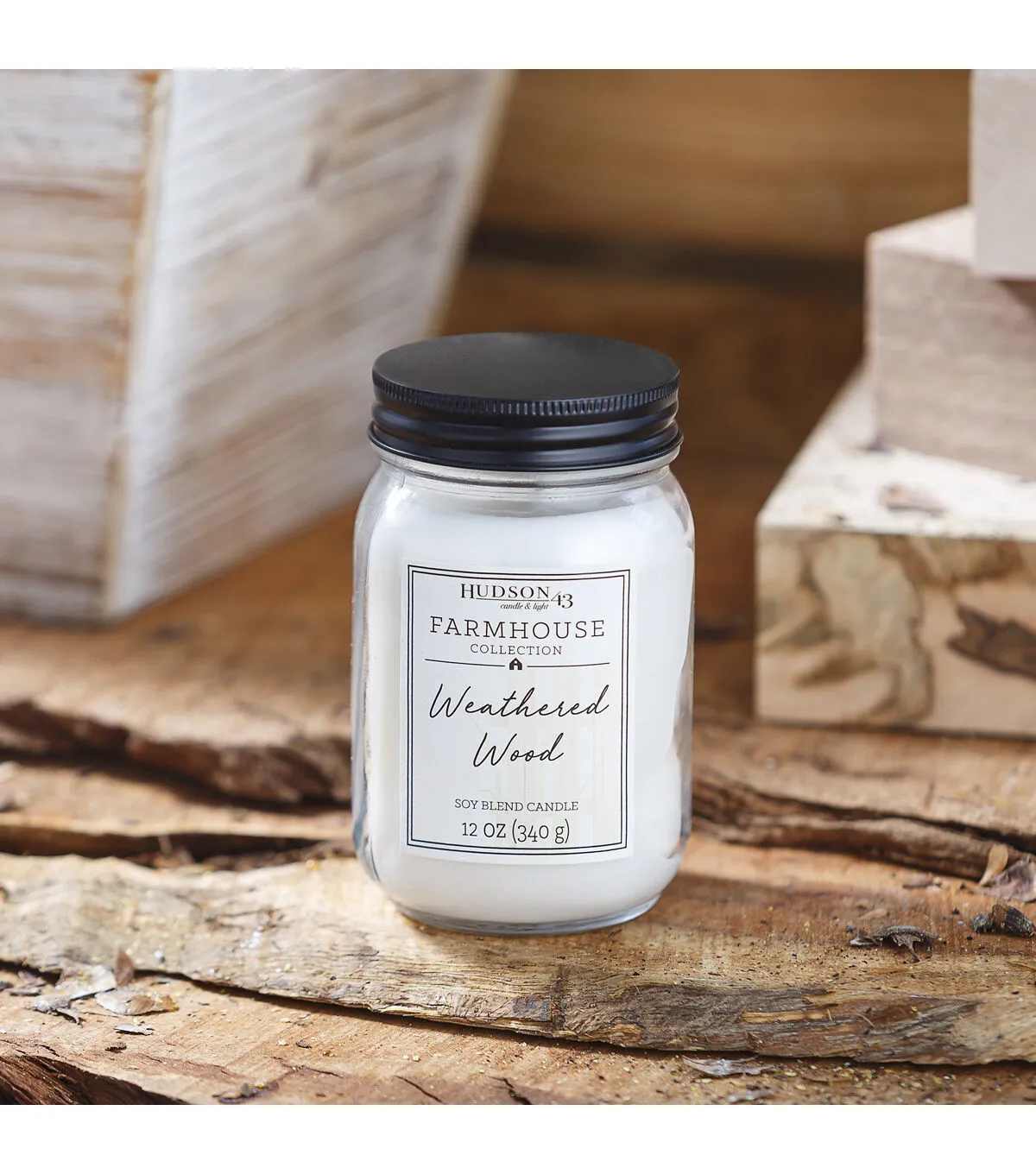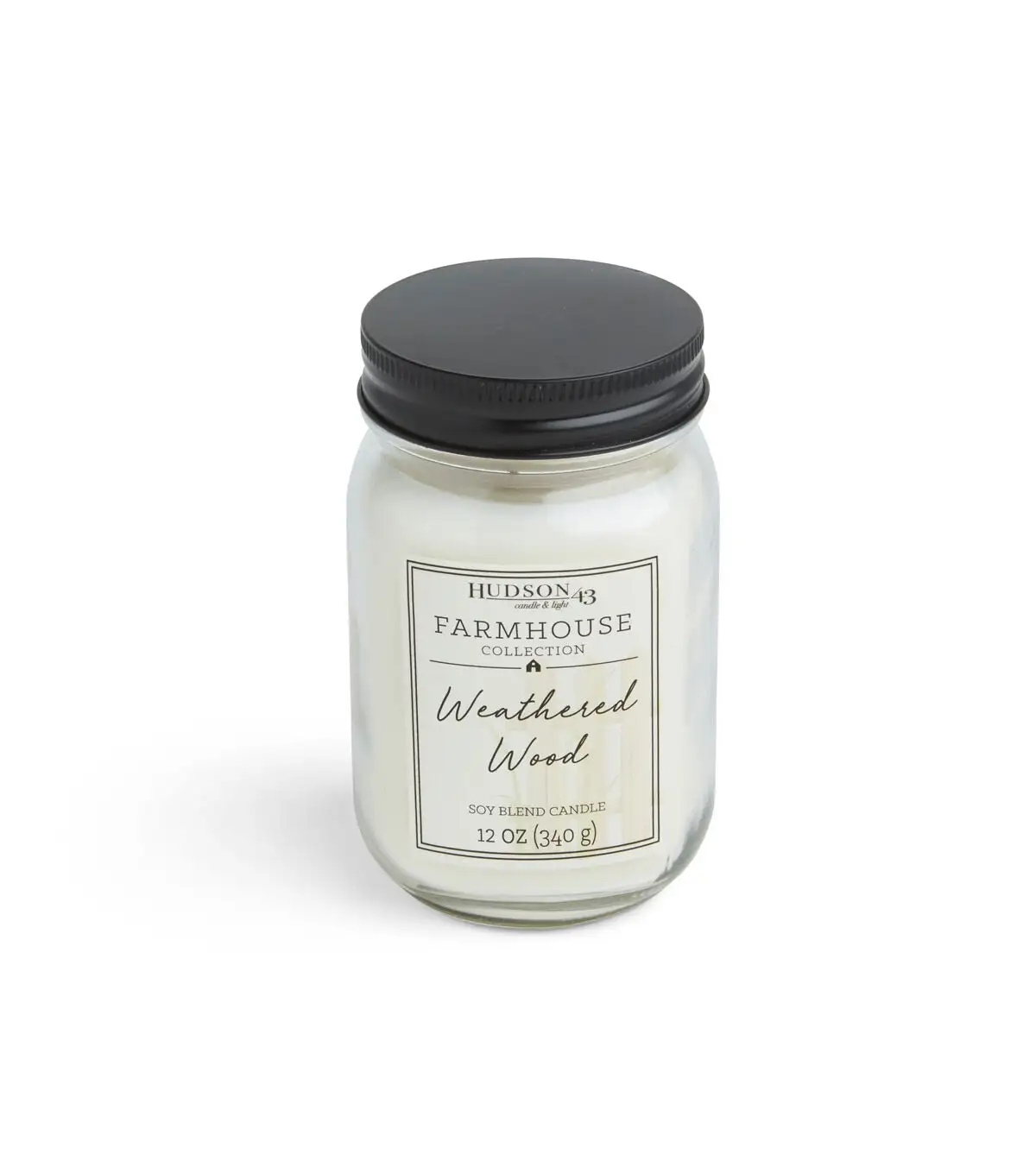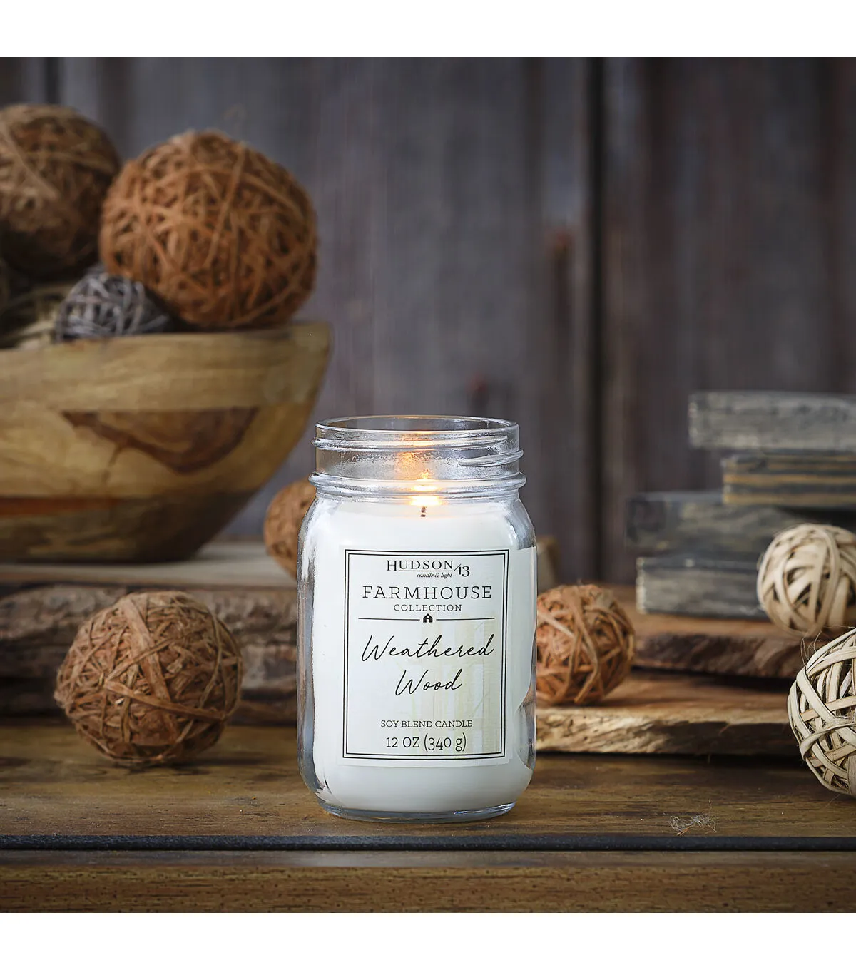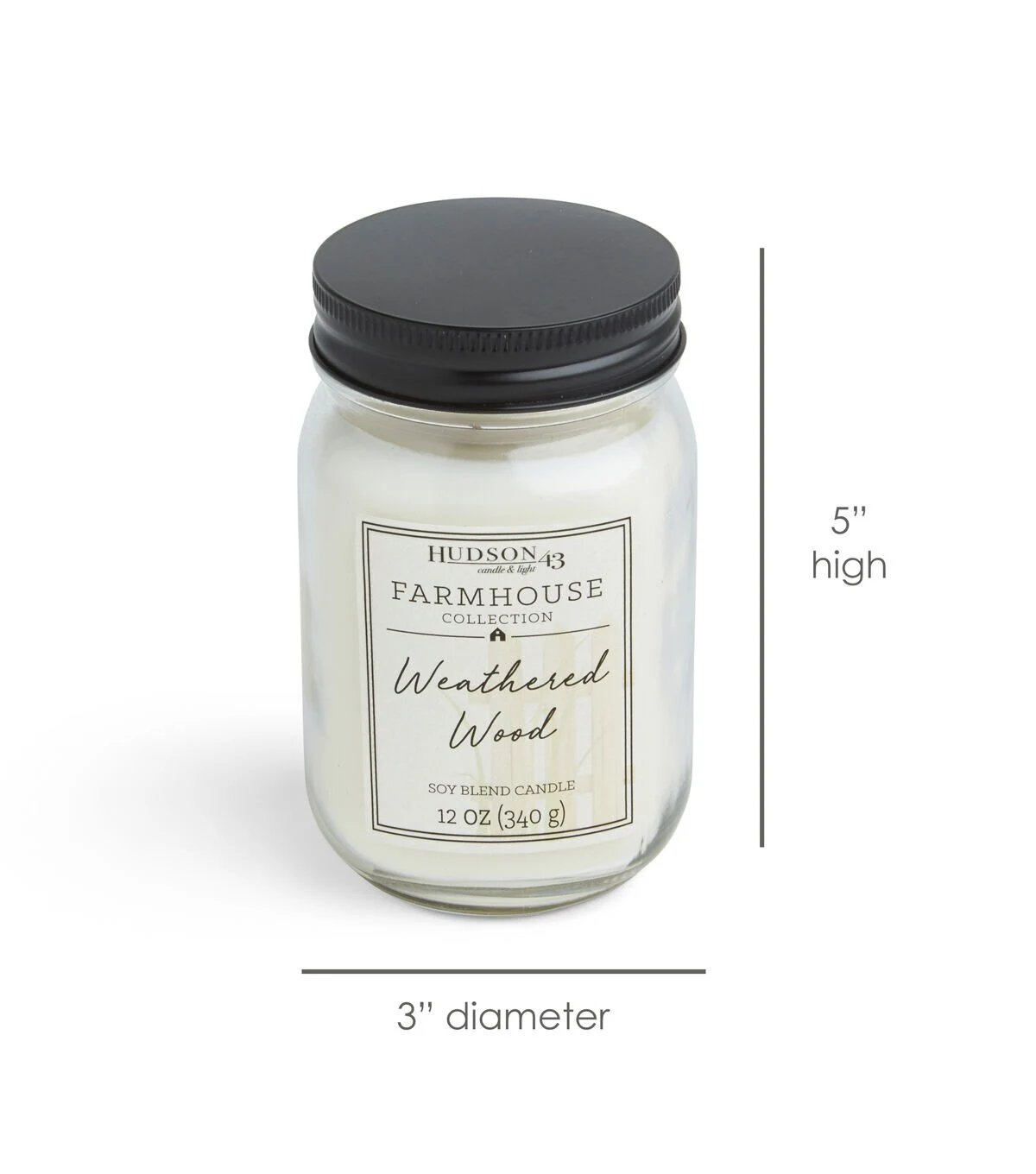 The Hudson 43 Farmhouse Collection Weathered Wood Mason Jar Candle offers a modern yet rustic fragrance in a beautiful package that goes with any decor. This 12-ounce clear mason jar comes with a white wax candle and a matte black lid that screws on. It includes the notes of sun-washed wood and fresh air.