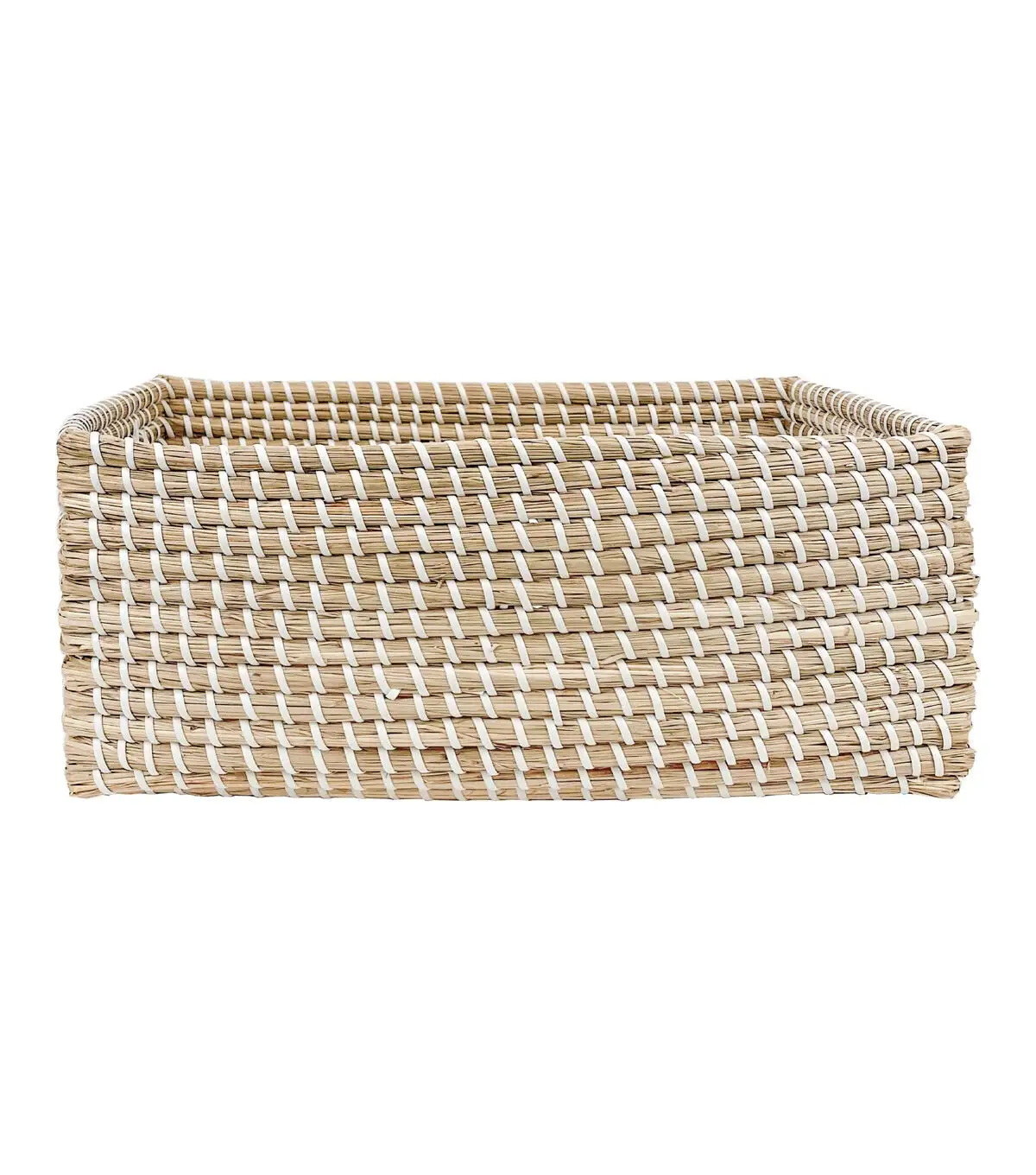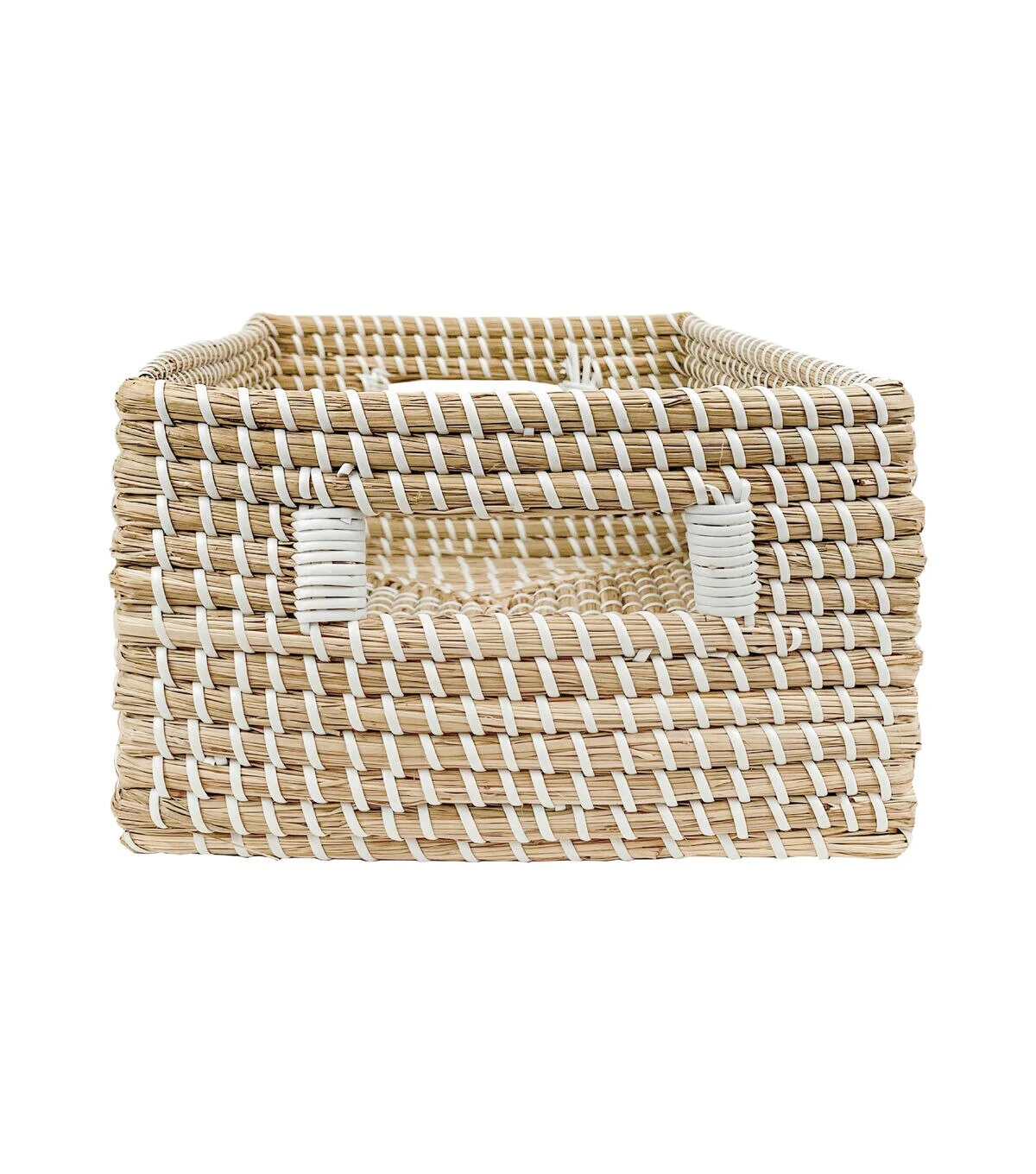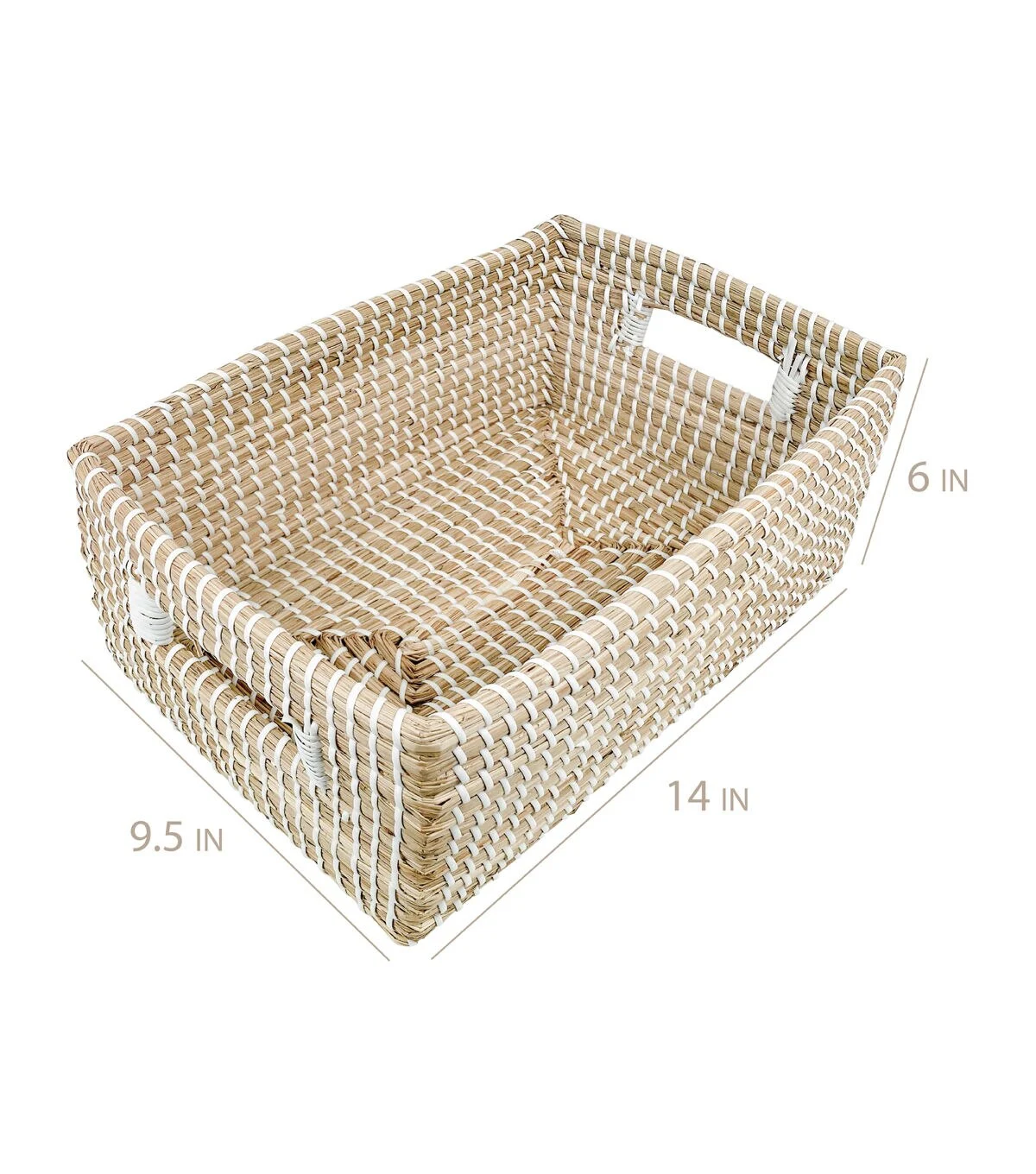 Give your home decor a rustic touch with the Natural & White Stitch Woven Basket by Place & Time. This woven basket flaunts a natural shade with white stitches. It is designed with cutout handles on two sides for ease of carrying. You can use it to store books and LED candles on the coffee table or towels in the kitchen.