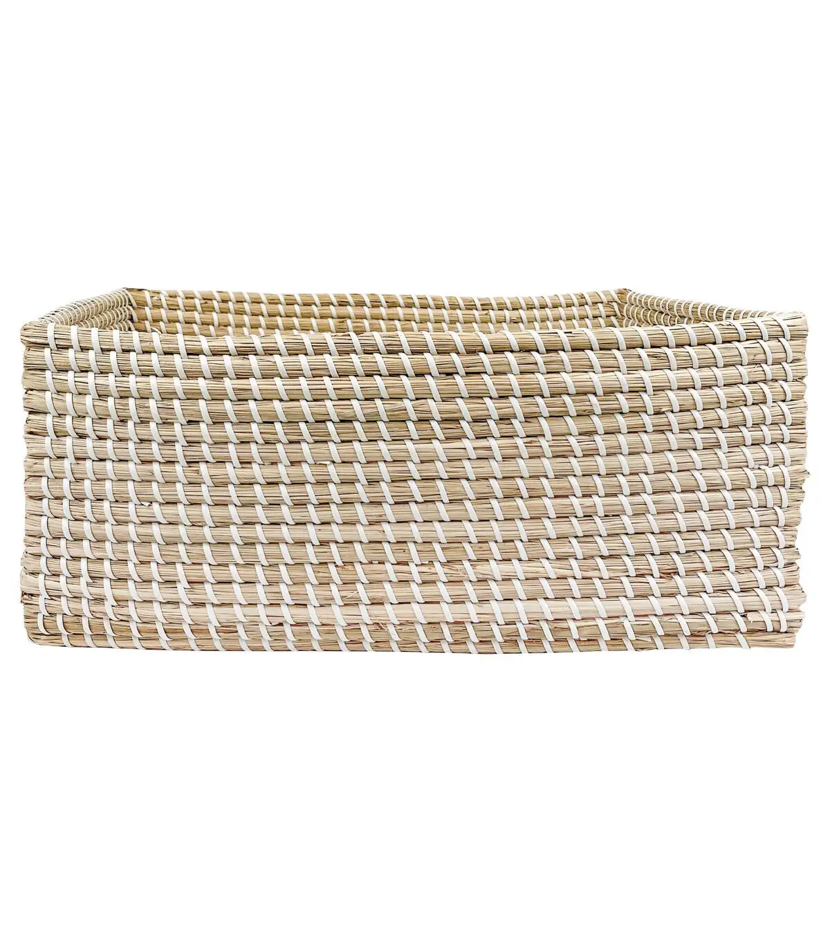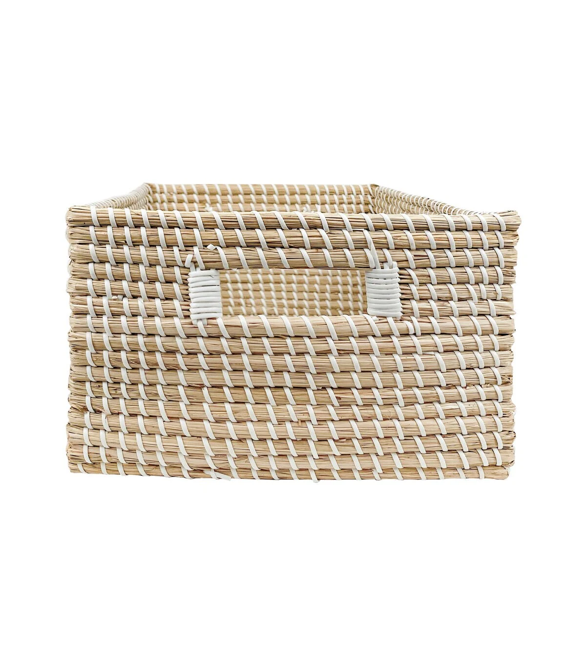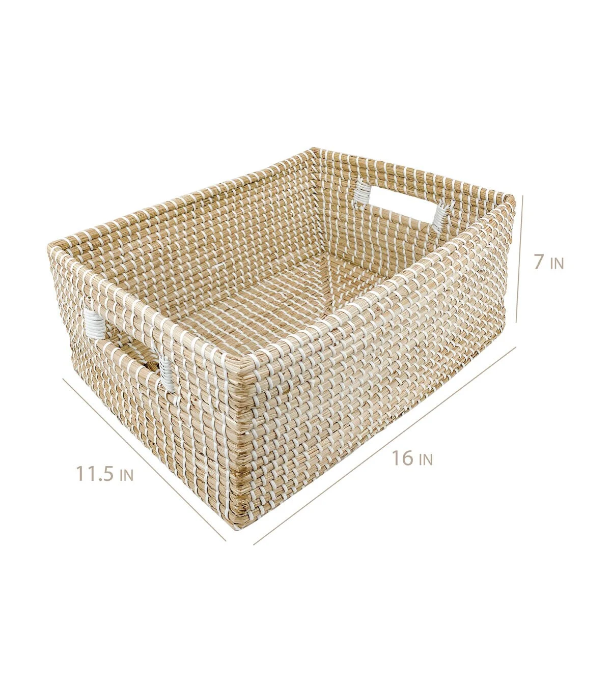 Give your home decor a rustic touch with the Natural & White Stitch Woven Basket by Place & Time. This woven basket flaunts a natural shade with white stitches. It is designed with cutout handles on two sides for ease of carrying. You can use it to store books and LED candles on the coffee table or towels in the kitchen.