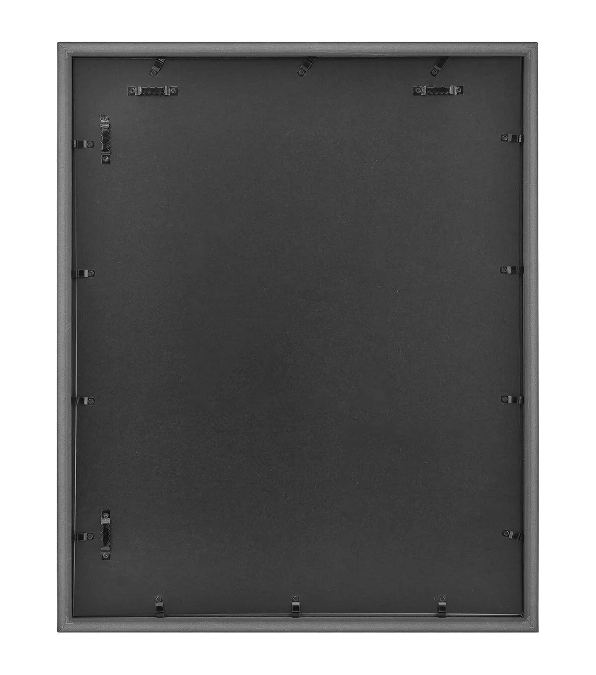 This sleek picture frame is both contemporary and classic and will fit into a variety of decors. It features a bold decorative recessed border in a black finish and incorporates a white beveled mat to feature your favorite photo. This frame will hold one 11x14 inch photo displayed inside the mat opening or one 16x20 inch photo displayed without the mat.
