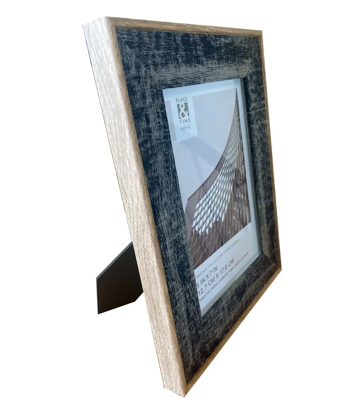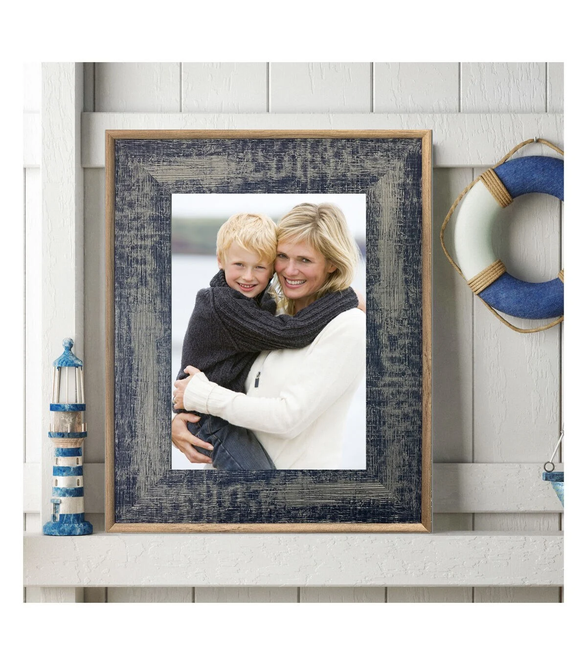 Textural elements shine in our Rowan tabletop frame. Featuring a distressed navy finish and natural colored outer piping, this frame adds visual interest to any space. The glass face ensures that your treasured photos and art are protected. Delivers ready to hang or display on your mantle or table with the included easel.