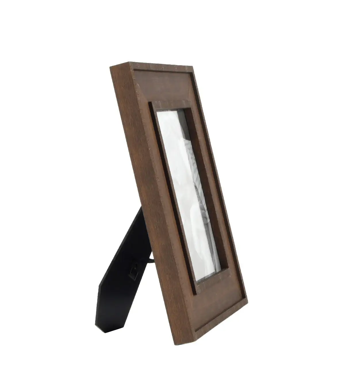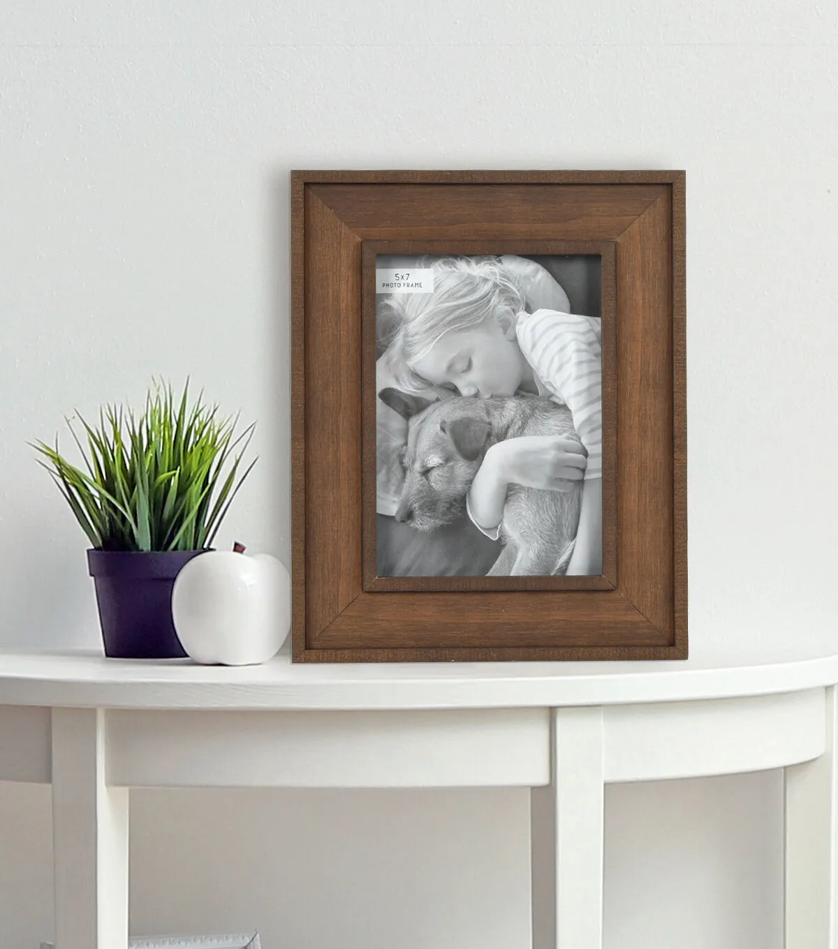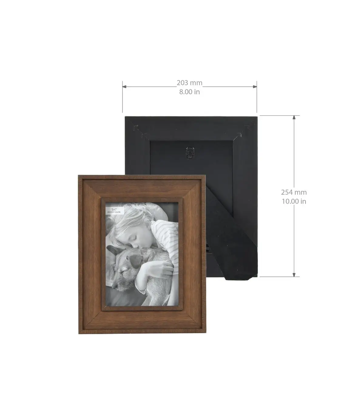 Complement your cherished memories with chic, rustic charm when you select this Reclaimed 5x7 Two-Tone Molded Wood picture frame. Made from real wood and finished in a distressed, medium brown tone with a contrasting darker brown trim, this lovely frame boasts timeless style. Whether you display this rustic frame in a hallway, entryway, or bedroom it's sure to add a stylish accent to your space. Simple backloading design makes it easy to insert a favorite photo while the high-quality, clear glass protects your photographs or prints. Use the two-way easel on the back to set it on a tabletop, desk, or mantel, or use the included metal hanger to mount it on the wall.