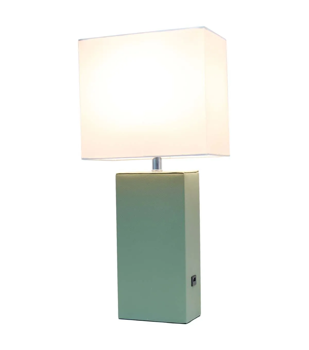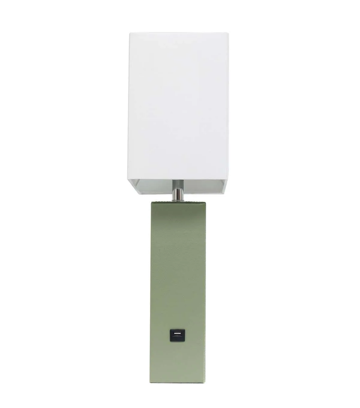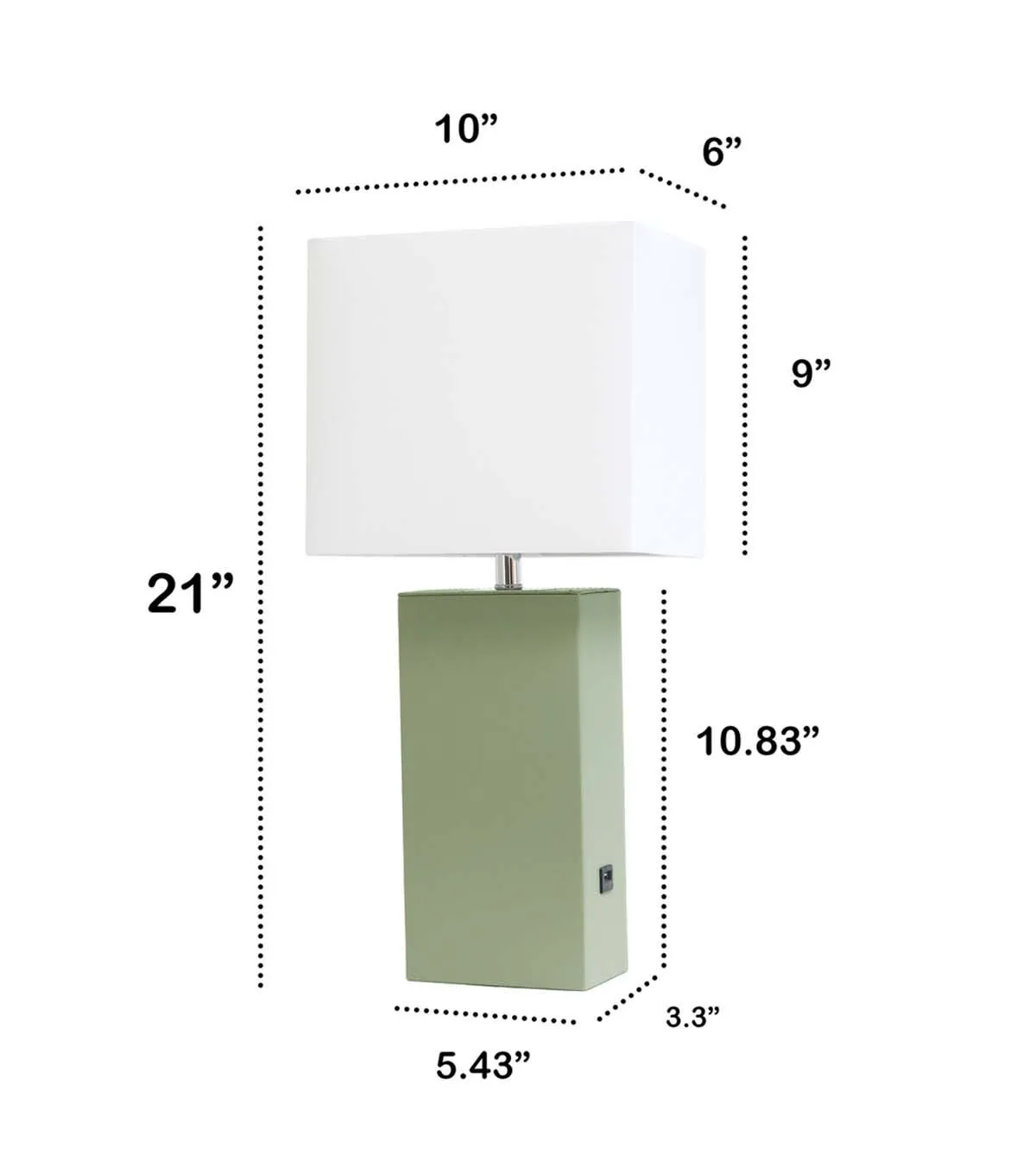 Lalia Home Lexington 21' Leather Base Modern Home Décor Bedside Table Lamp with USB Charging Port for Living Room, Bedroom, Entryway, Foyer, or Office with White Rectangular Fabric Shade, Sage Green