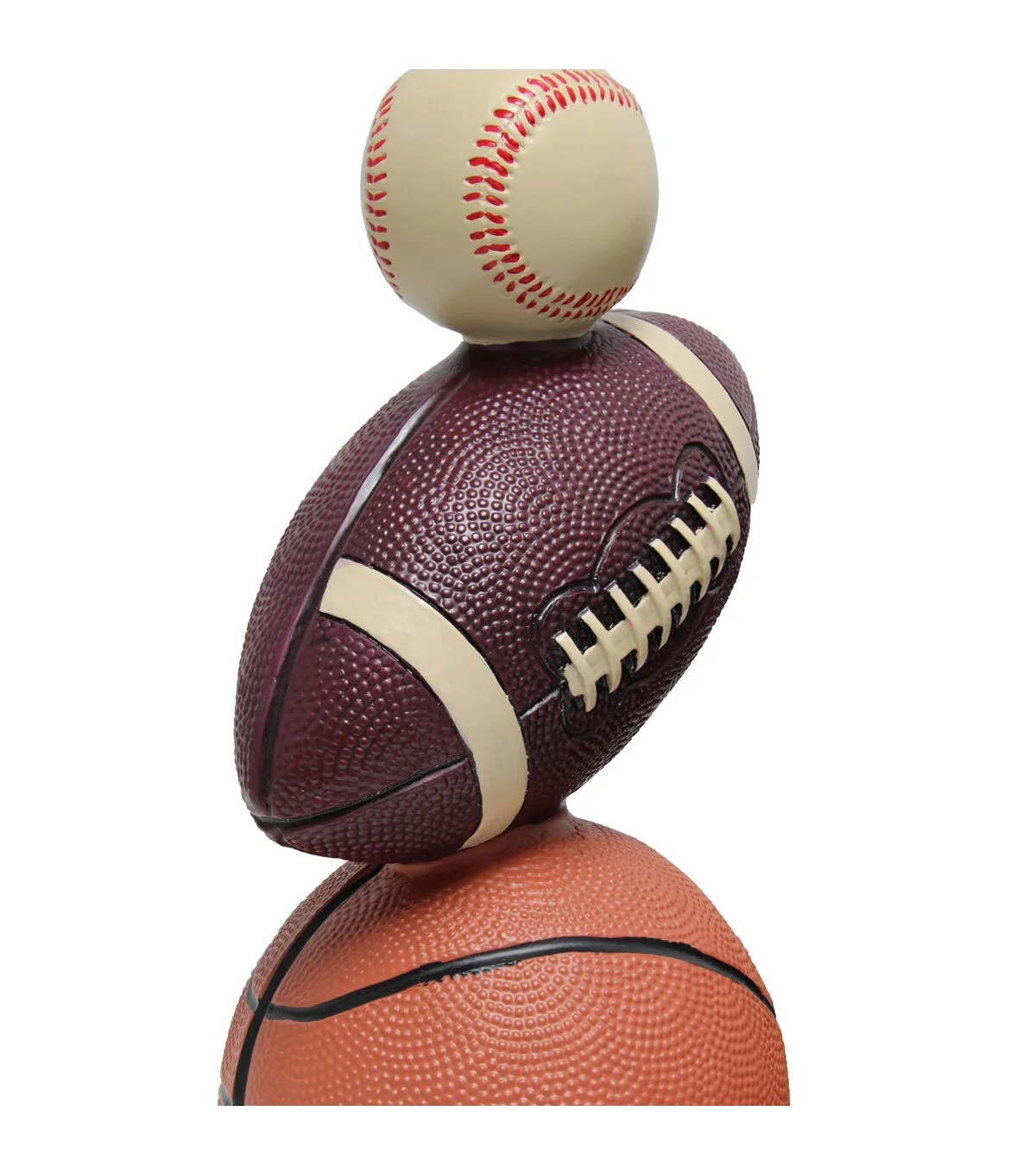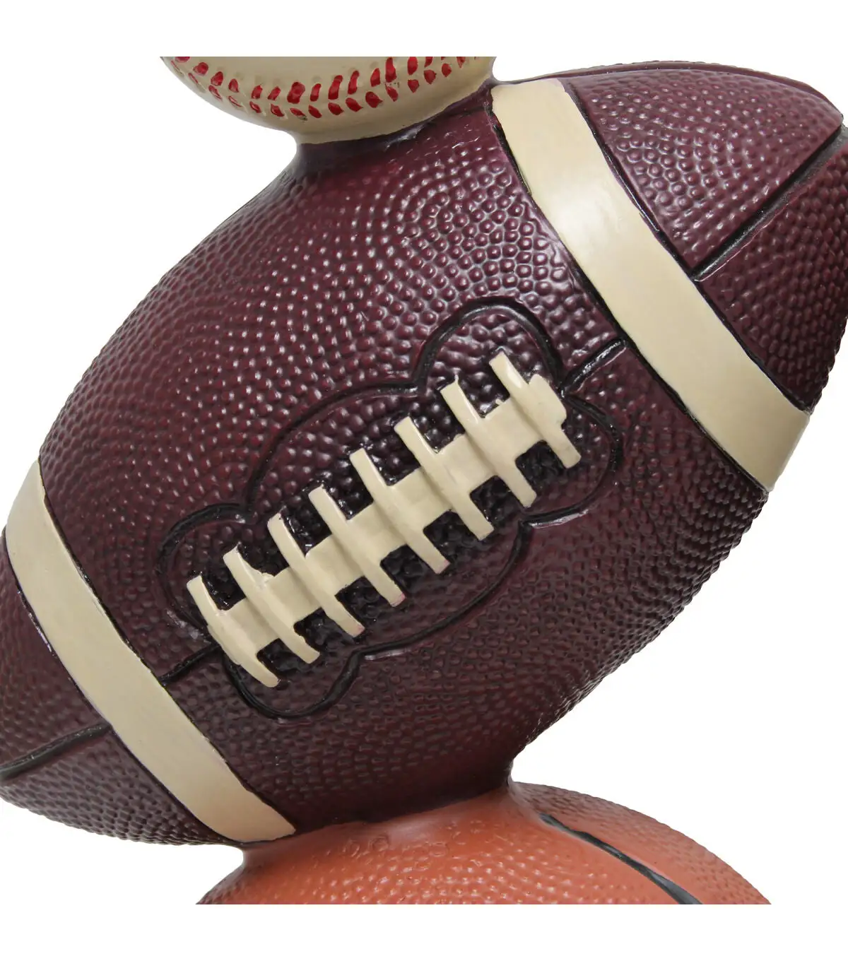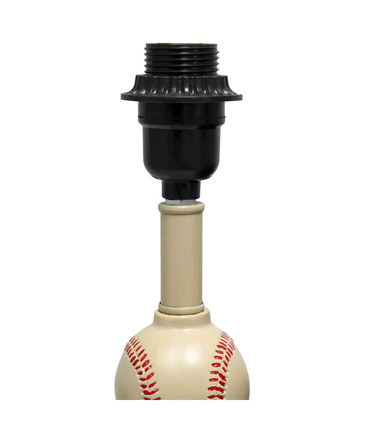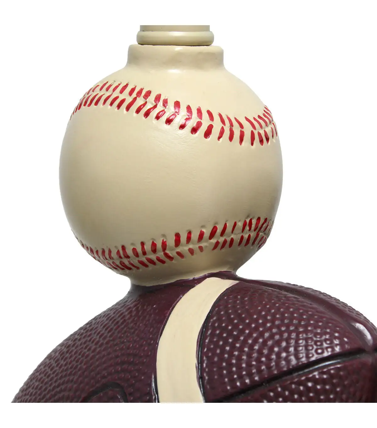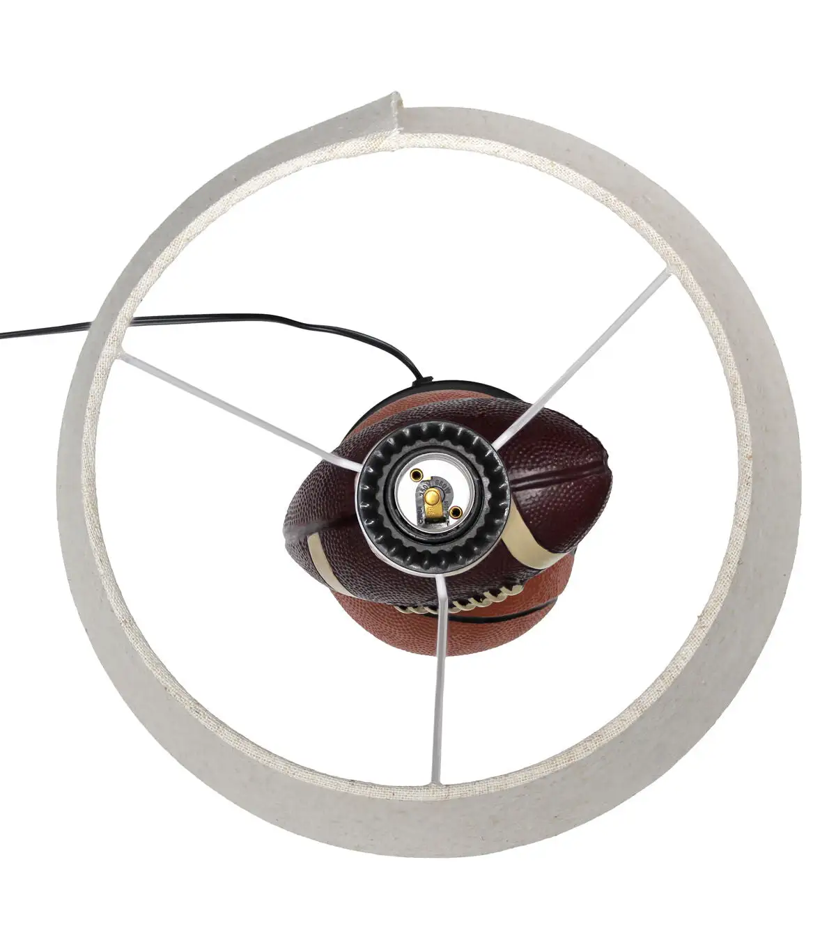 Calling all athletic admirers! Whether you're shopping for an adult or child, this is a perfect table lamp for all sports loving fans. A polyresin base with a mix of football, basketball and a baseball, sits beneath a tapered drum fabric shade in light beige, designed to match the sports team of your choice!