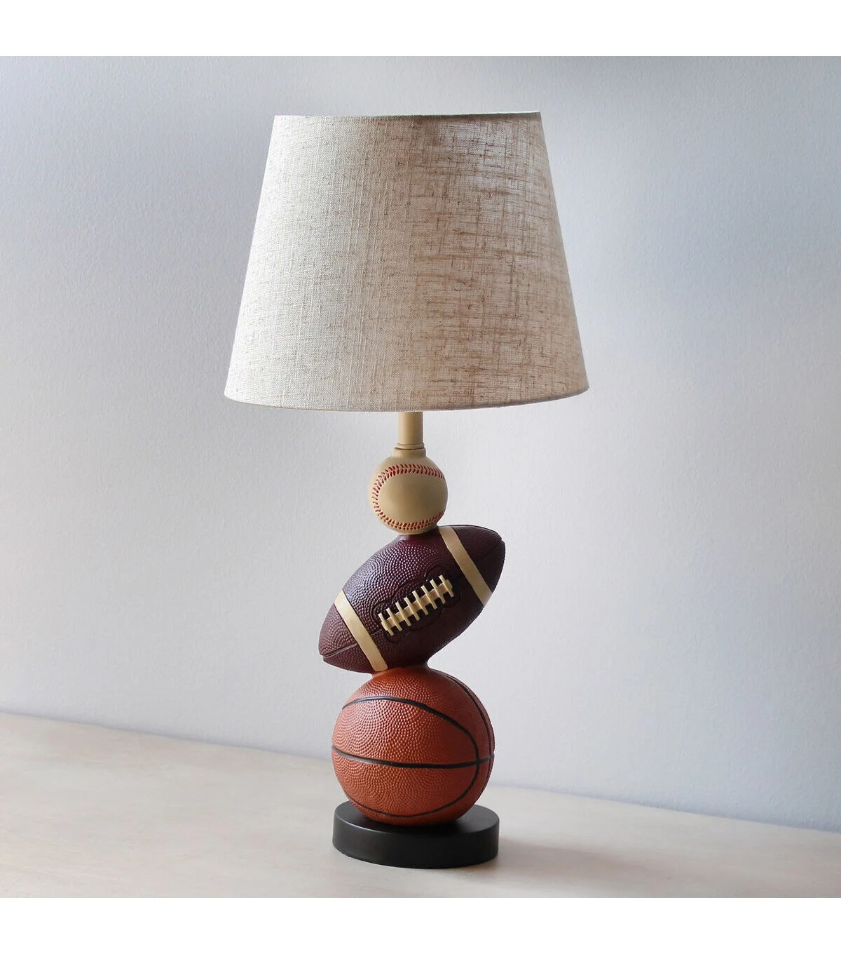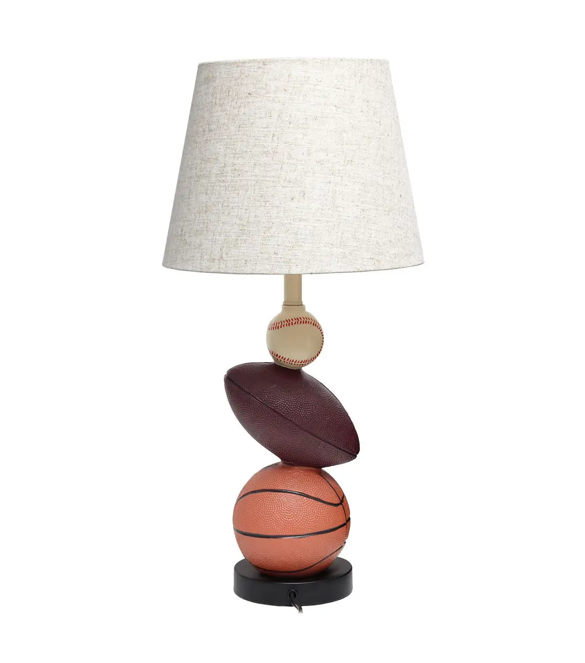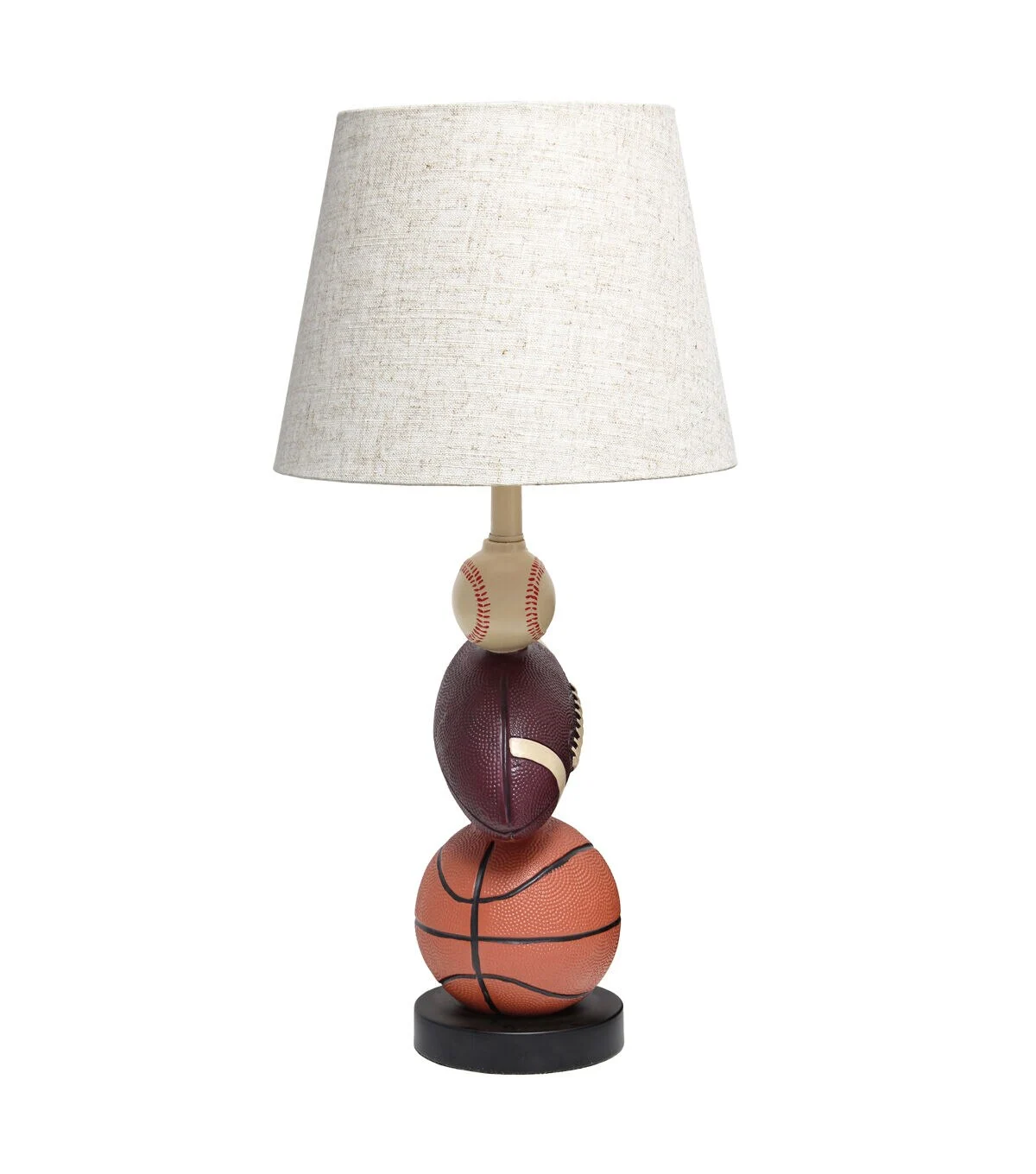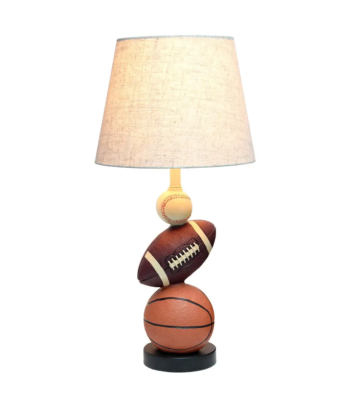 - FUN SPORTS STYLED LAMP: A neutral lamp to accommodate all sports teams' décor, memorabilia spaces, man cave rooms, and more! This lamp features a football, basketball, and baseball shaped base with a matching white fabric shade.