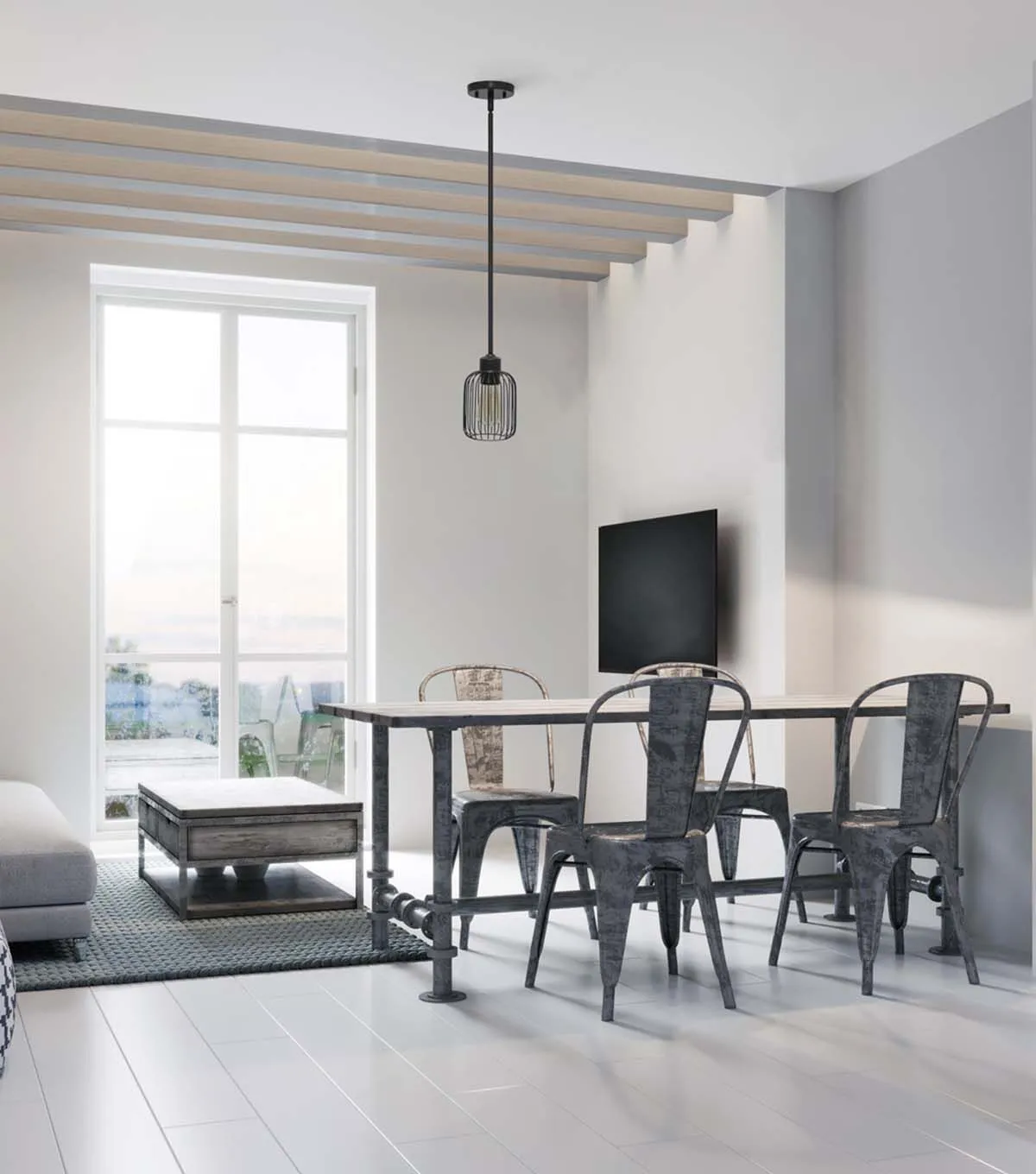 This industrial styled 1 light mini pendant is designed to compliment most décor types, while illuminating your space in style. This cage like fixture in all black brings an industrial influence mixed with a bit of a farmhouse style that allows ample amount of lighting to extend into your space. This lamp is ideal for hallways, entryways, bedrooms, and kitchens!