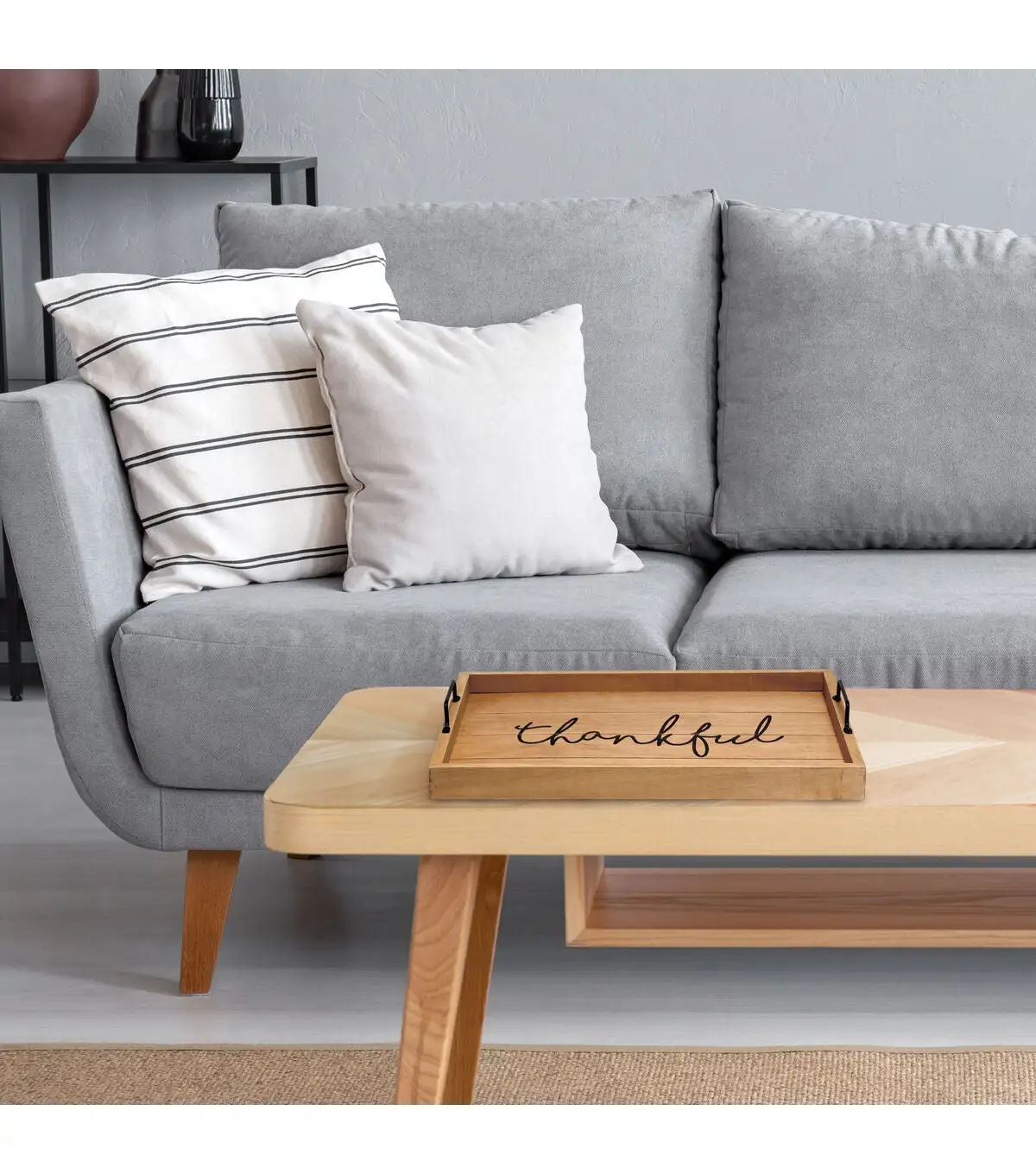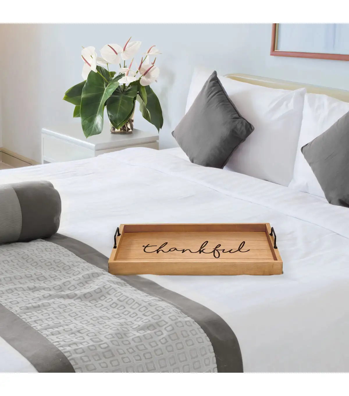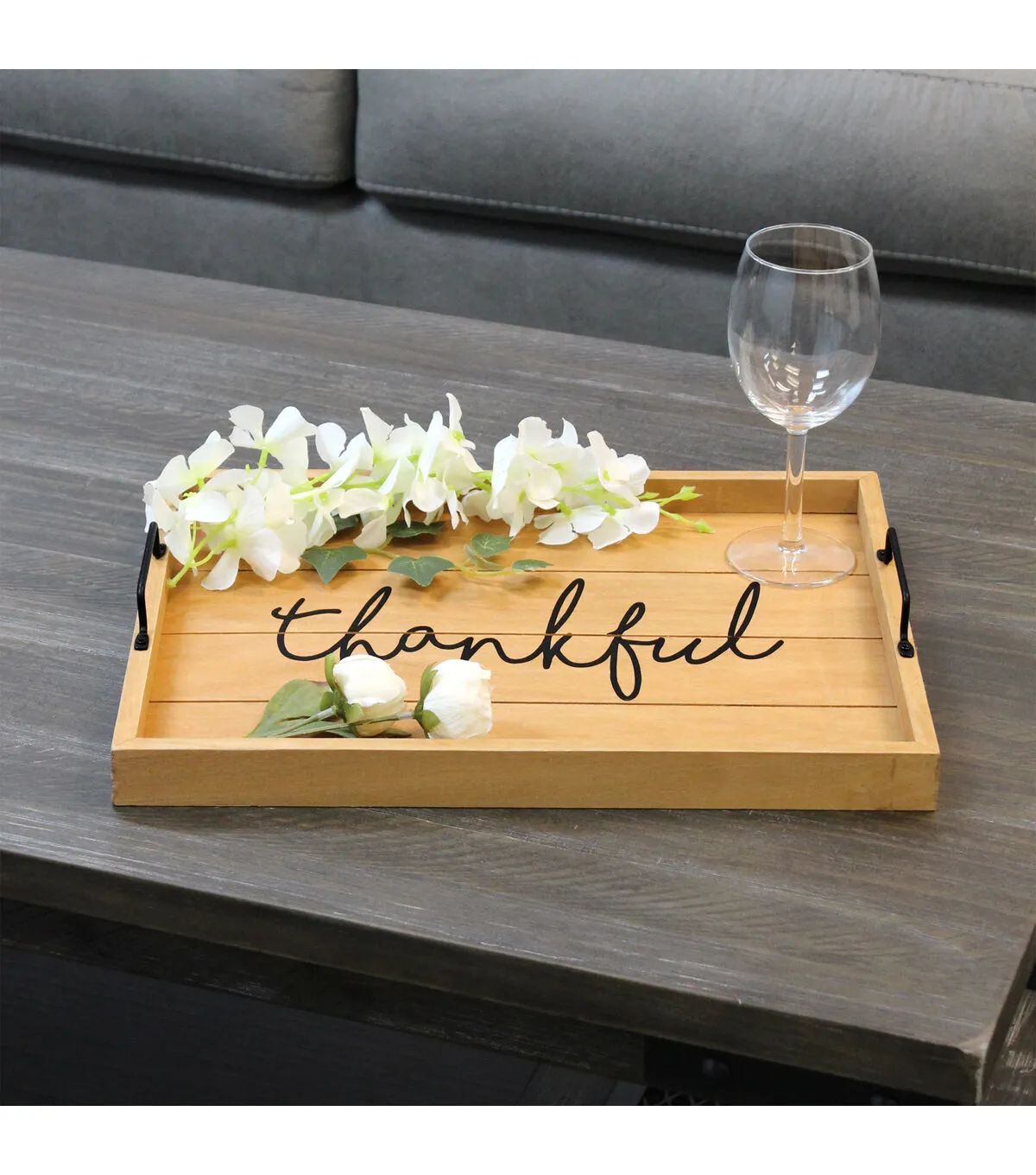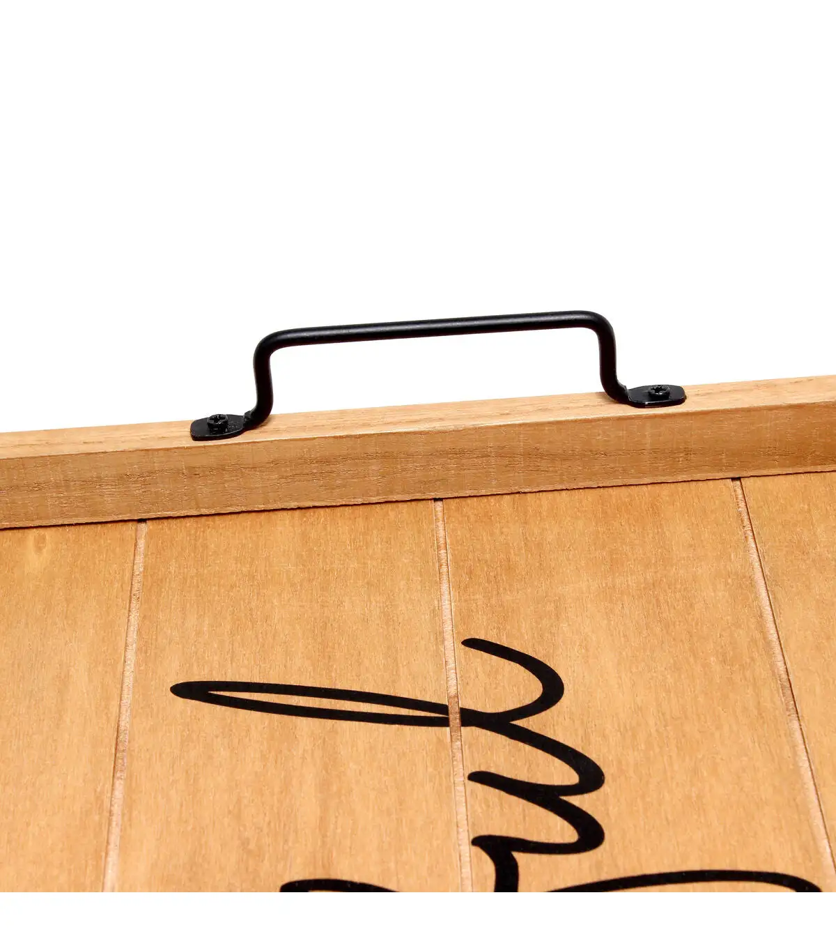 Freshen up your home with this natural wooden tray! Accented with black metal handles and black text this tray is on trend to give your home that cozy farmhouse feel. Use to serve breakfast in bed, food and drinks at a party or makes for an excellent centerpiece for your dining table, kitchen counter, coffee table or ottoman.