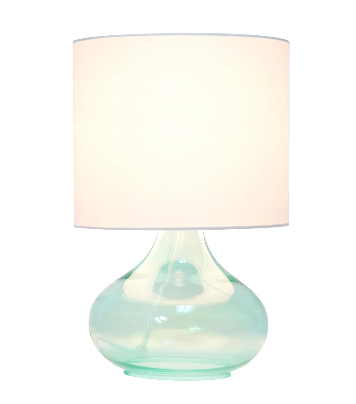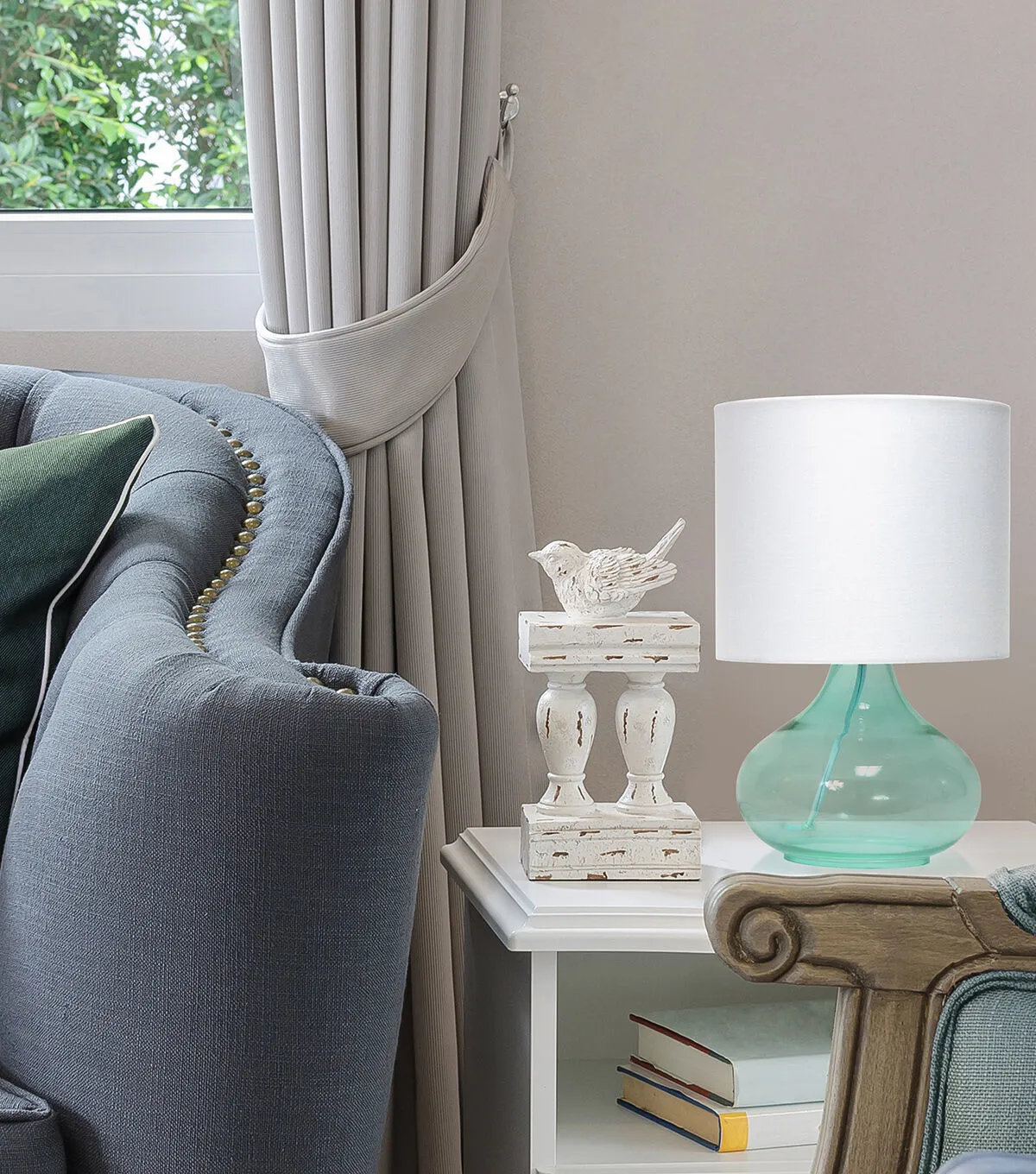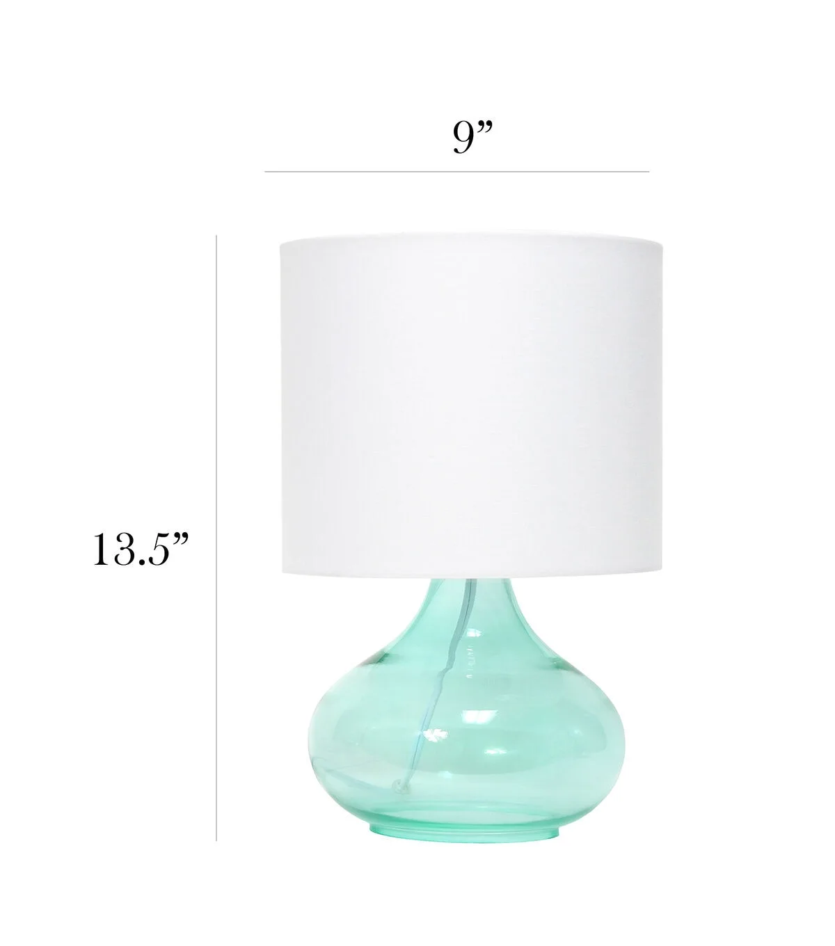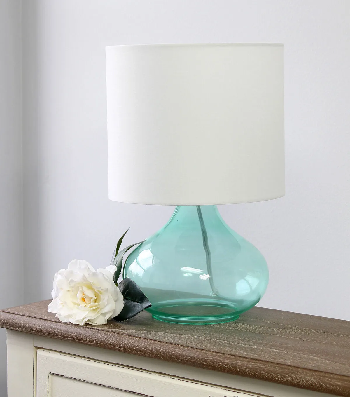 Illuminate your living space with this simple yet stylish glass table lamp. The aqua glass raindrop shaped base and white fabric drum shade is the perfect blend of charm to give your home a contemporary and modern upgrade. Perfect for living rooms, bedrooms, kids and teens, college dorms, apartments, nurseries, or offices.