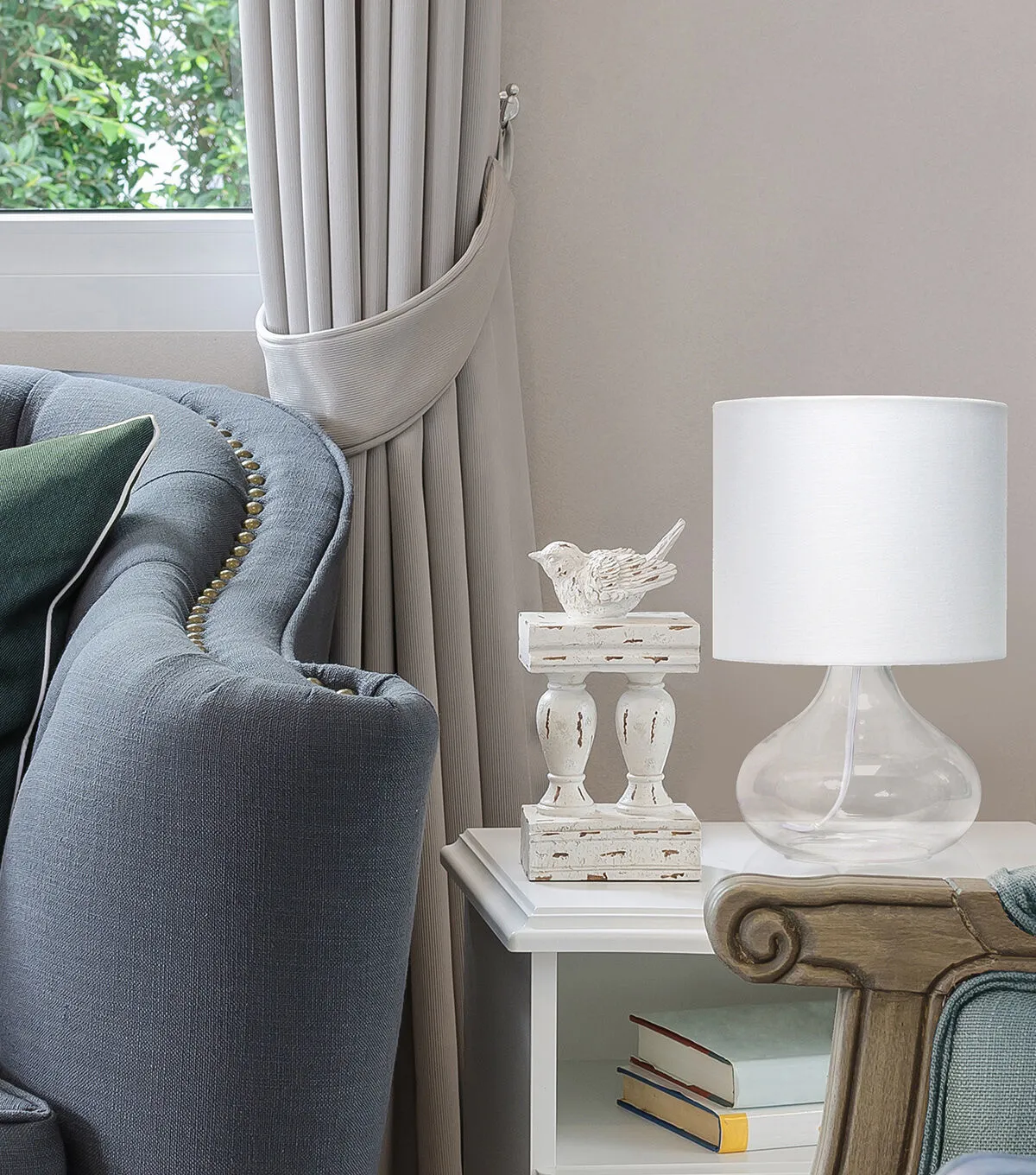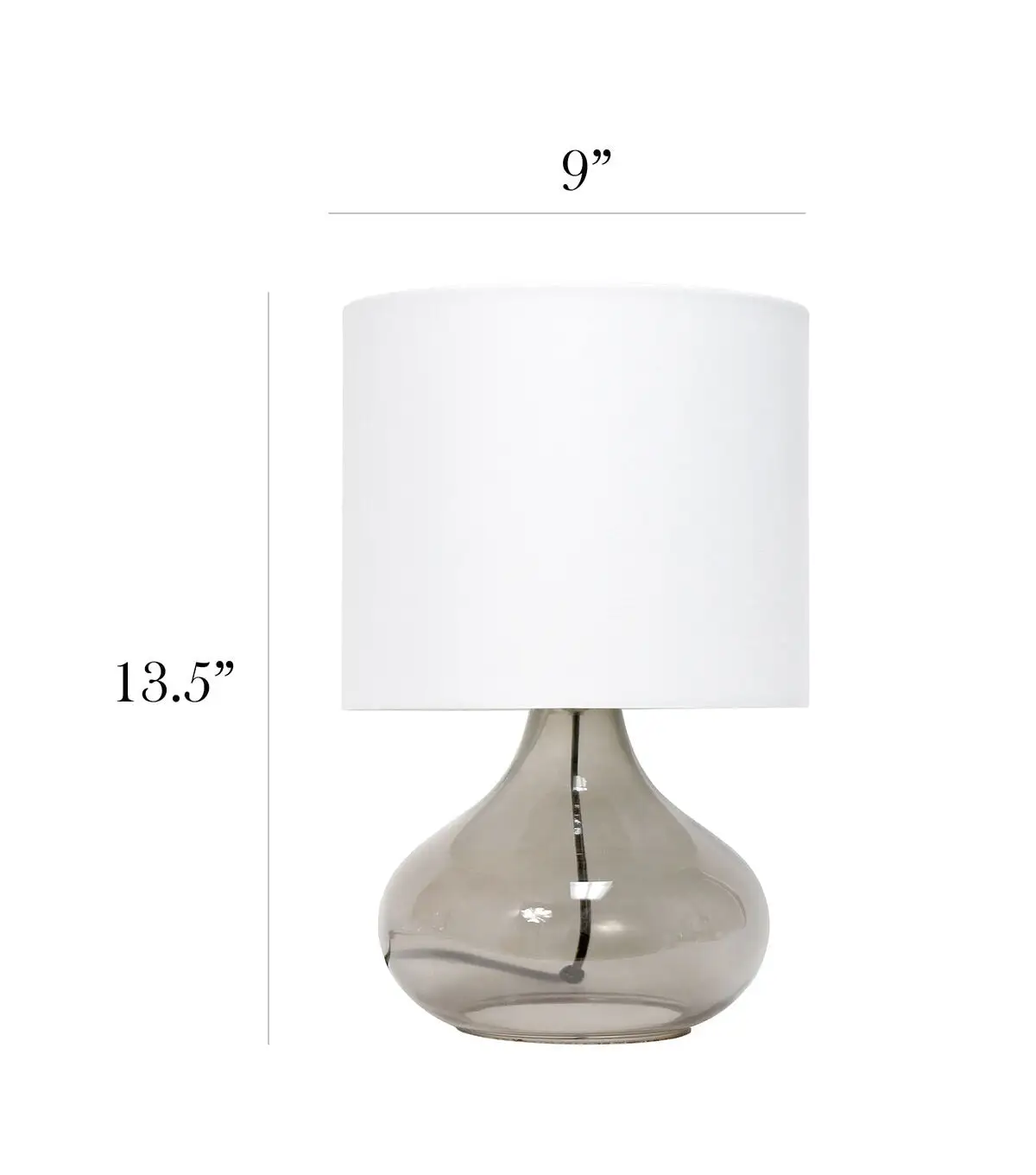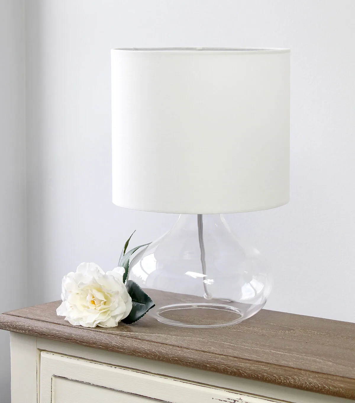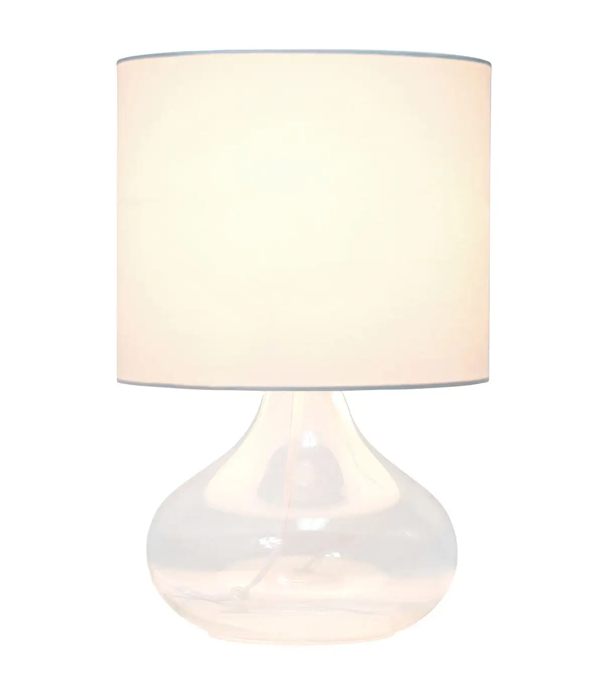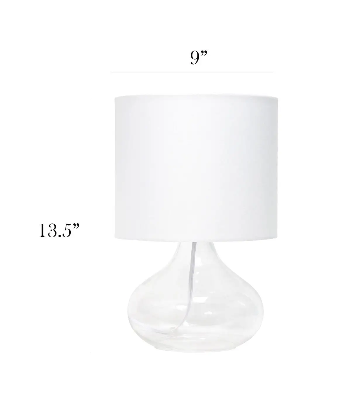 Illuminate your living space with this simple yet stylish glass table lamp. The aqua glass raindrop shaped base and white fabric drum shade is the perfect blend of charm to give your home a contemporary and modern upgrade. Perfect for living rooms, bedrooms, kids and teens, college dorms, apartments, nurseries, or offices.