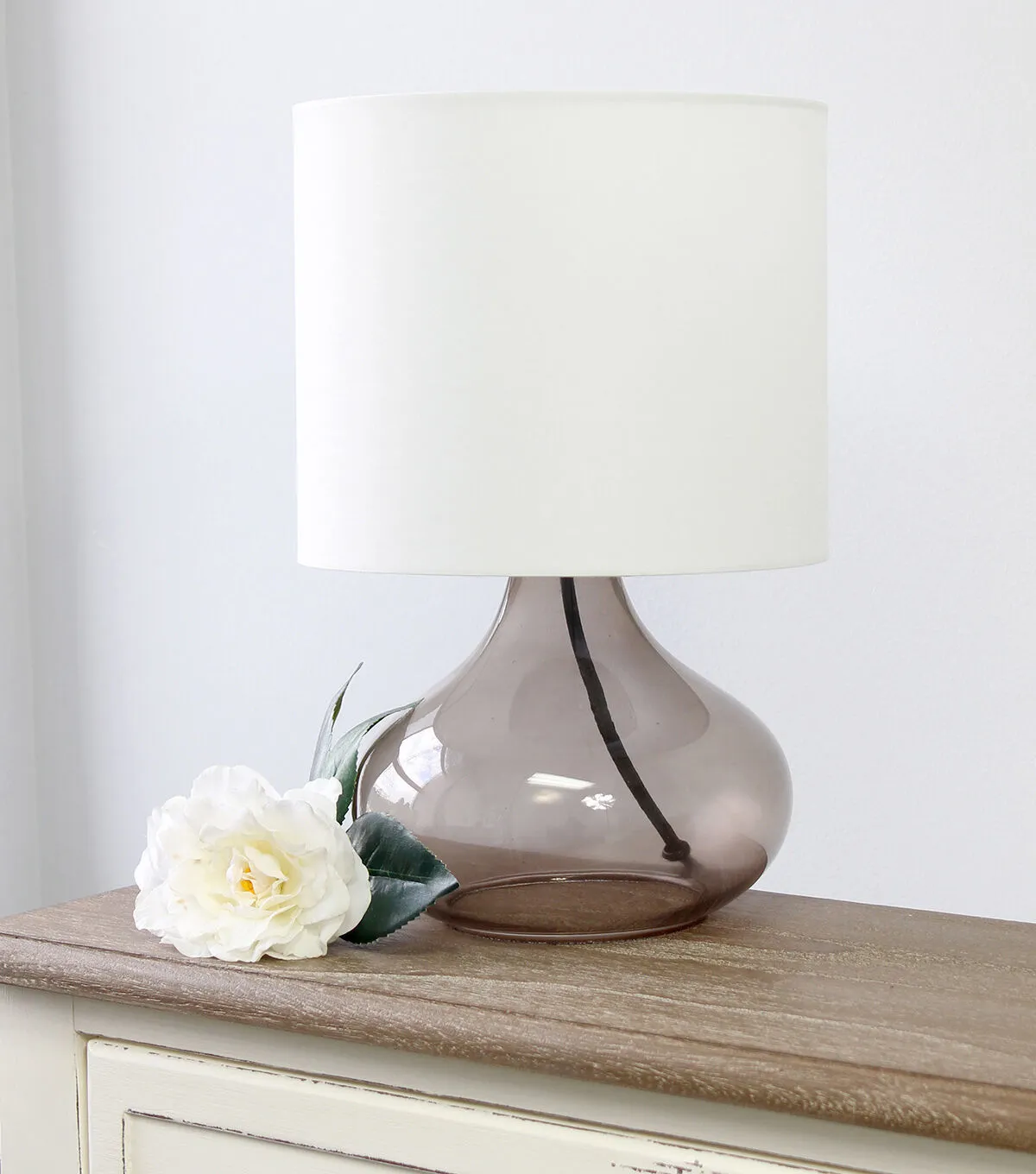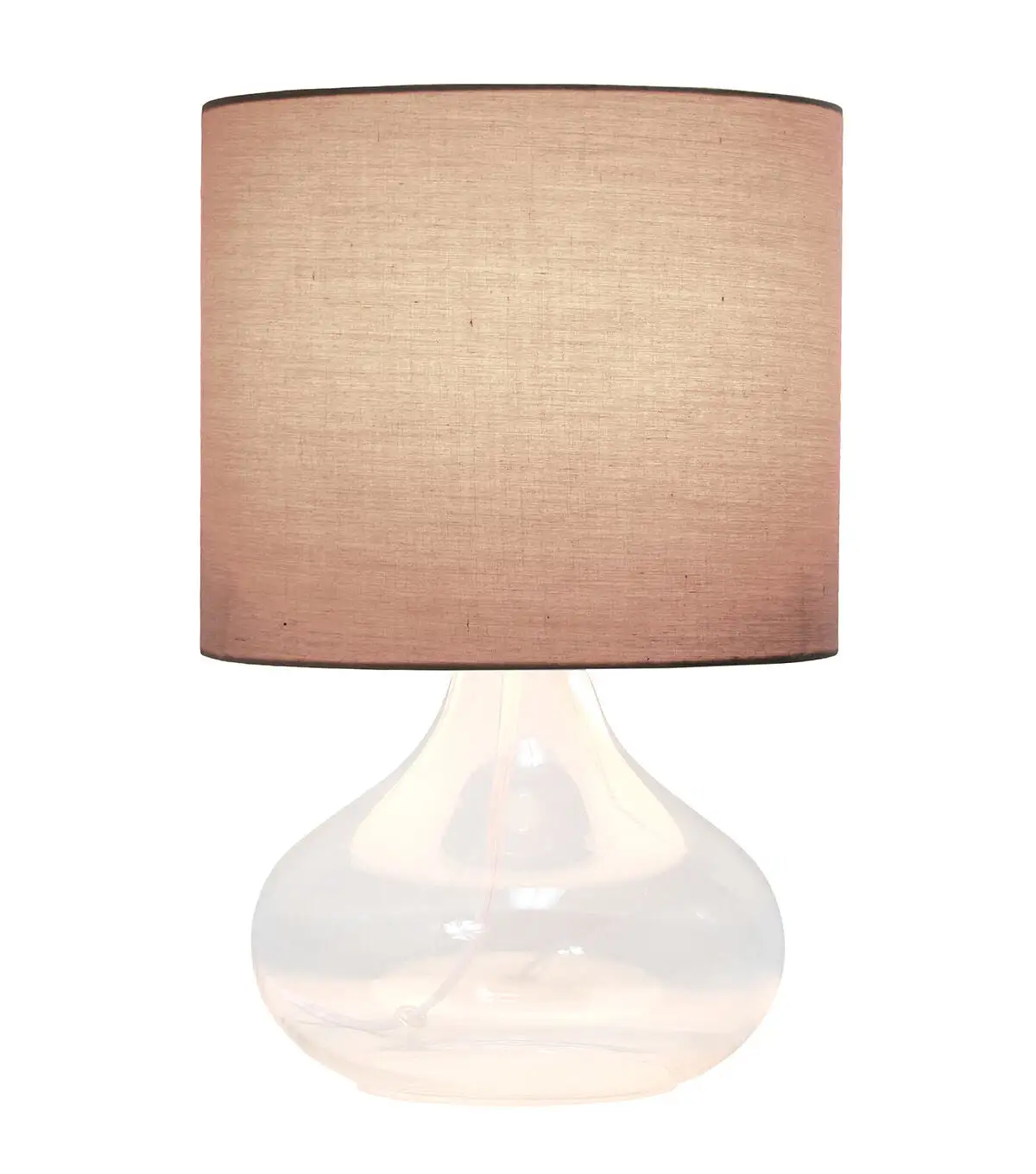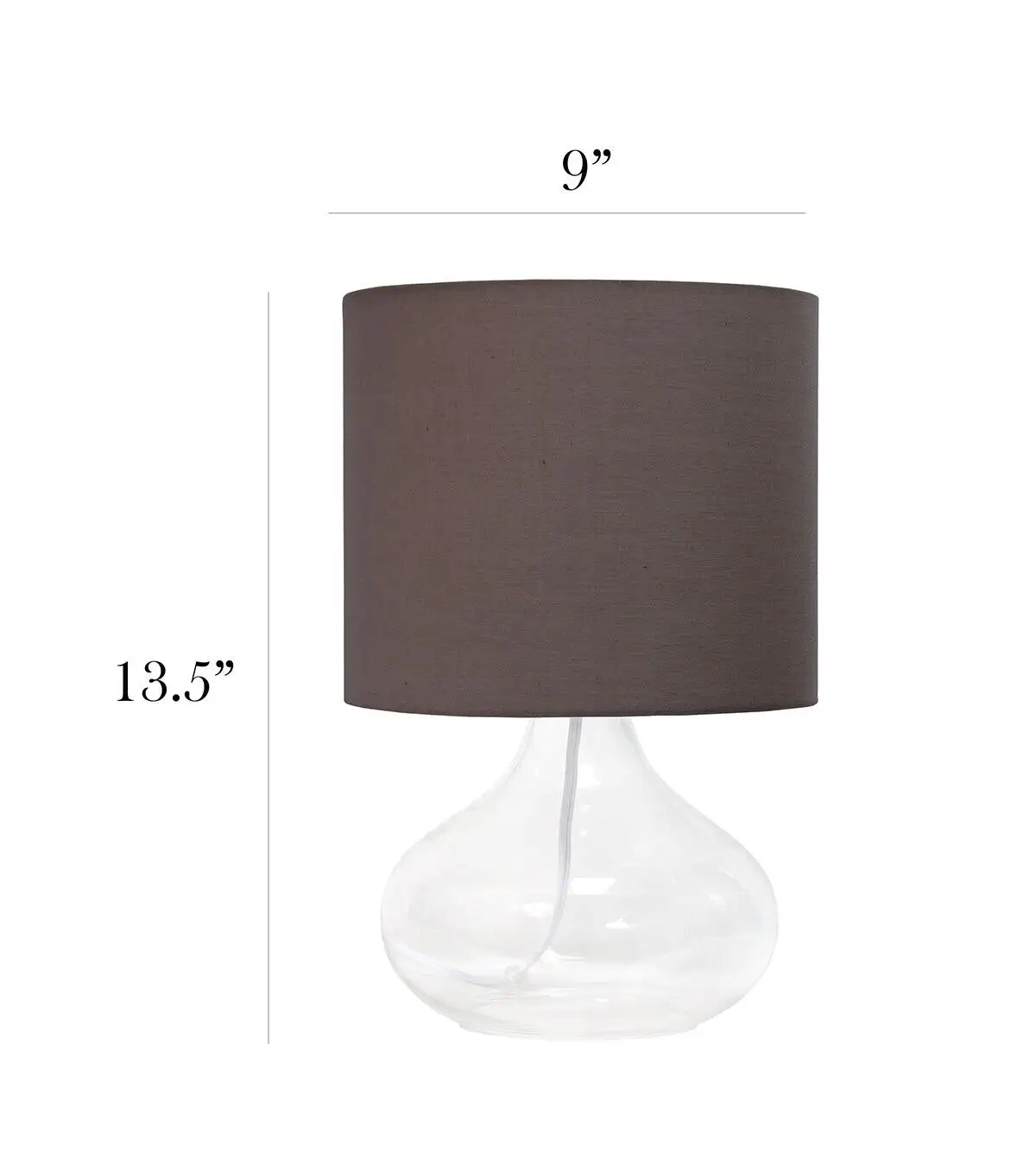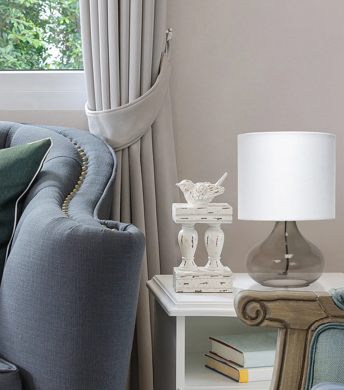 Illuminate your living space with this simple yet stylish glass table lamp. The aqua glass raindrop shaped base and white fabric drum shade is the perfect blend of charm to give your home a contemporary and modern upgrade. Perfect for living rooms, bedrooms, kids and teens, college dorms, apartments, nurseries, or offices.