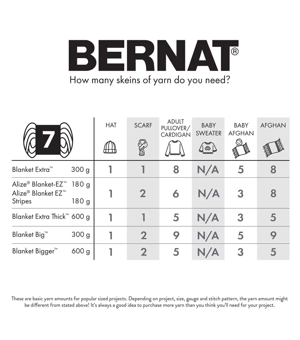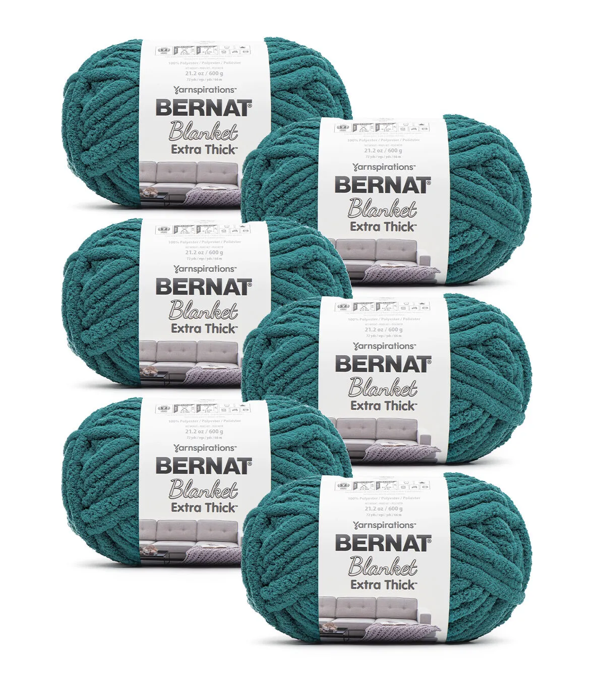 Extra Extra! Bernat Extra Thick yarn gets your project from start to finish extra fast. Your favorite chenille-style Bernat Blanket yarn now has even more to love. The jumbo weight comes in a generously sized ball so each one goes a long, long way. Use Bernat Blanket Extra Thick to stitch up washable, squishable, comfortable projects that are done before you know it.