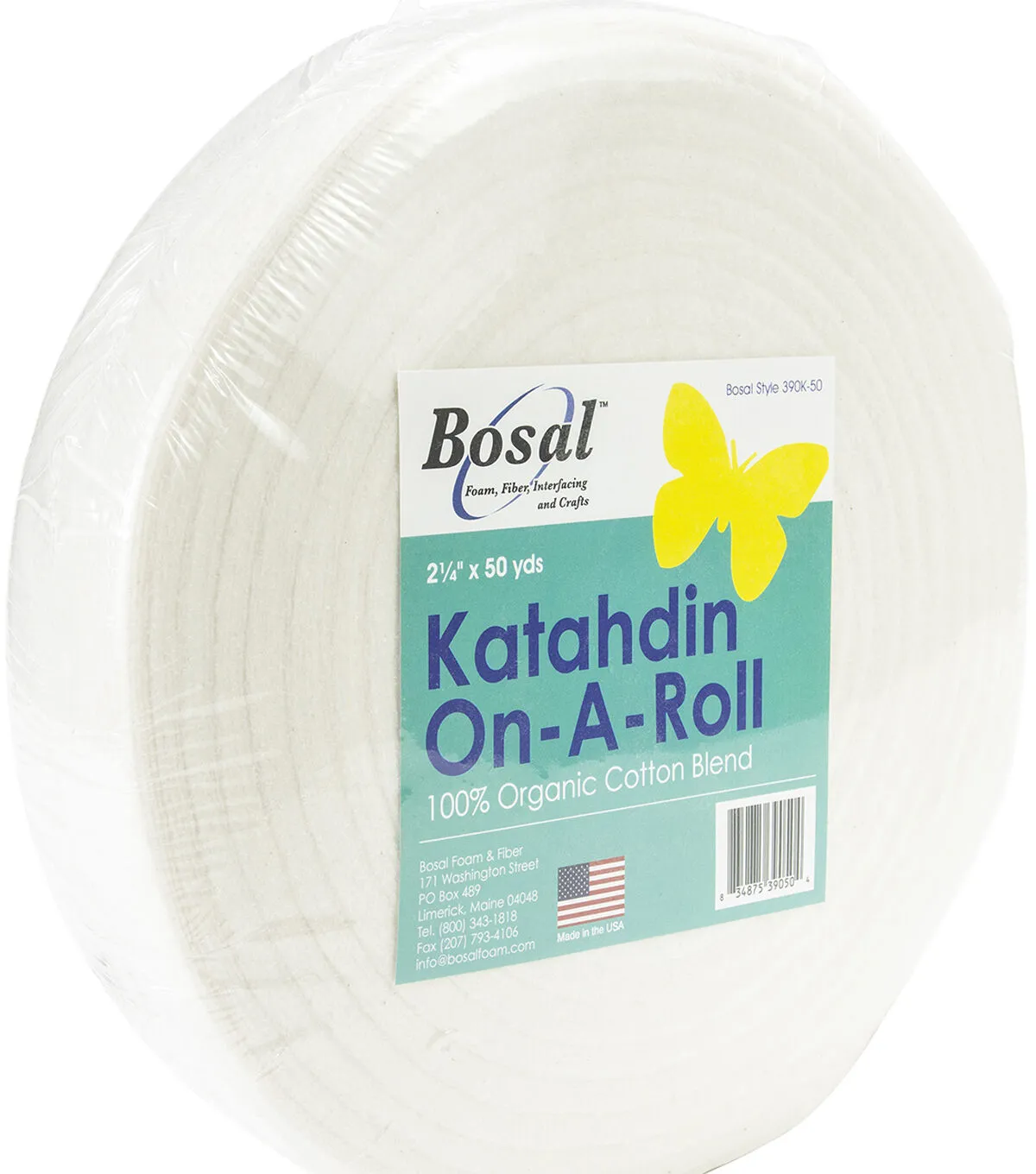 Bosal Katahdin On A Roll. A lightweight cotton batting in a convenient size for crafts. This package contains 50 yards of 2.25 inch wide 100% organic cotton batting. Made in USA.