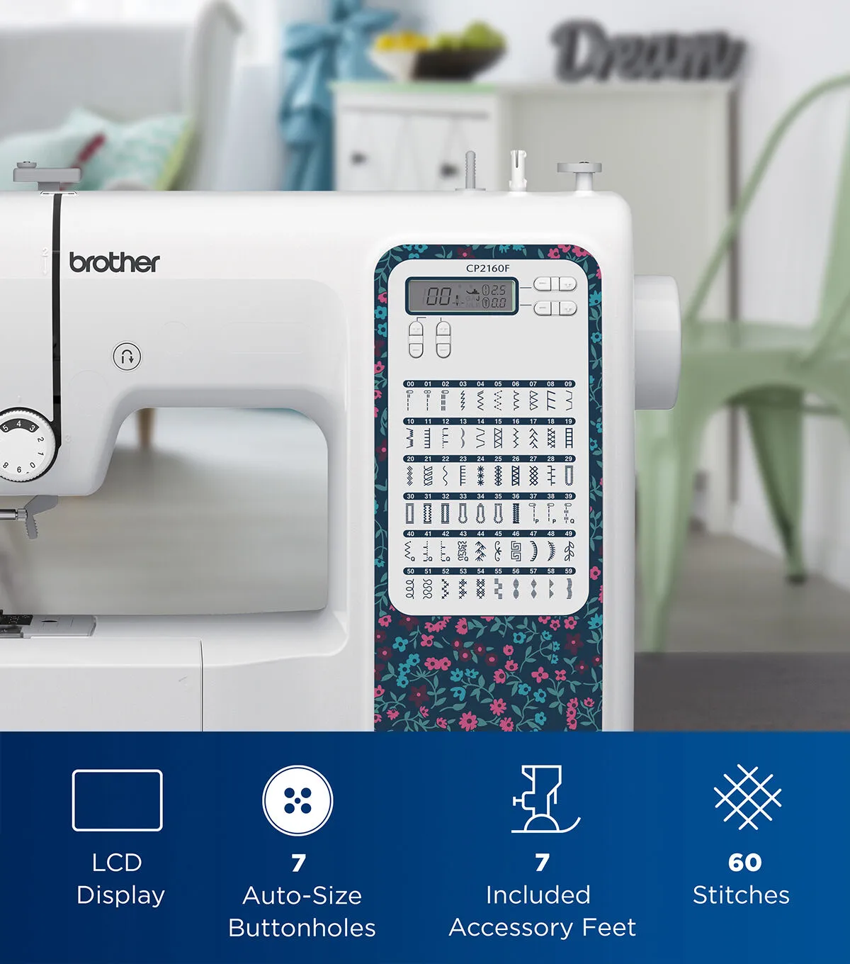 Enjoy a full range of features in a compact, durable and multi-blue floral footprint with the CP2160F computerized sewing machine. The CP2160F comes with 60 built-in stitches, seven auto-size one-step buttonholes, and selecting one of the attractive built-in stitches is as simple as pressing a button with the easy stitch selector. A sharp LCD Screen and advanced needle threading system, which makes threading easy, add to the machine's highlights. Utilize drop feed dogs and try free-motion sewing or the free arm capability to make sewing cuffs, sleeves, and skinny jeans a breeze. The CP2160F allows for virtually effortless sewing on denim, tweed, and other thick fabrics with the exceptional feed system and fixed needle bar. Also included are seven first-rate sewing feet (a Zigzag foot, a Buttonhole foot, a Zipper sewing foot, a Button sewing foot, Overcasting foot, Blind stitch foot, and a Monogramming foot) to help you achieve a variety of sewing techniques. Complete with a Quick-Set bobbin and a super bright LED-lit work area, the affordable CP2160F will have you creating DIY projects and garments in no time.