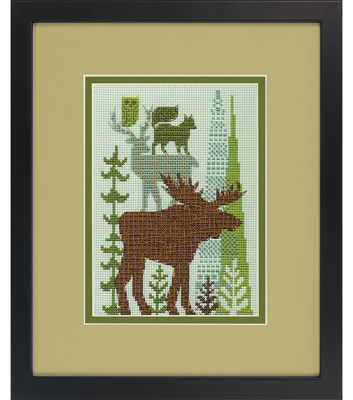 Forest Folklore by Dimensions reinterprets the classic Bremen Town musicians as denizens of the wild. This counted cross stitch design is worked in the soothing colors of nature. Finished size: 5' x 7'. Original Artwork Michael Mullan, Licensed by Wild Apple Graphics. Kit contains presorted thread, 14 count lt. green Aida, needle, and instructions.