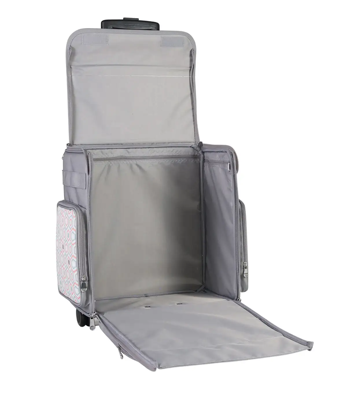The Everything Mary Collapsible Rolling Craft Bag is the ultimate storage solution for any storage need you may have. This rolling organizer cart is constructed with durable polyester and features premium zippers, piping, and an Everything Mary emblem. 17 total storage spaces are built into this scrapbook storage case for all of your tools, sewing notions, or other supplies. The main compartment on this rolling craft organizer is perfect for scrapbooking IRIS boxes, paper, crafts, containers, and so much more! This scrapbook rolling tote features a telescoping locking handle and a durable wheelset for secure craft storage. The Everything Mary Collapsible Rolling Craft Bag was made with crafters in mind.
