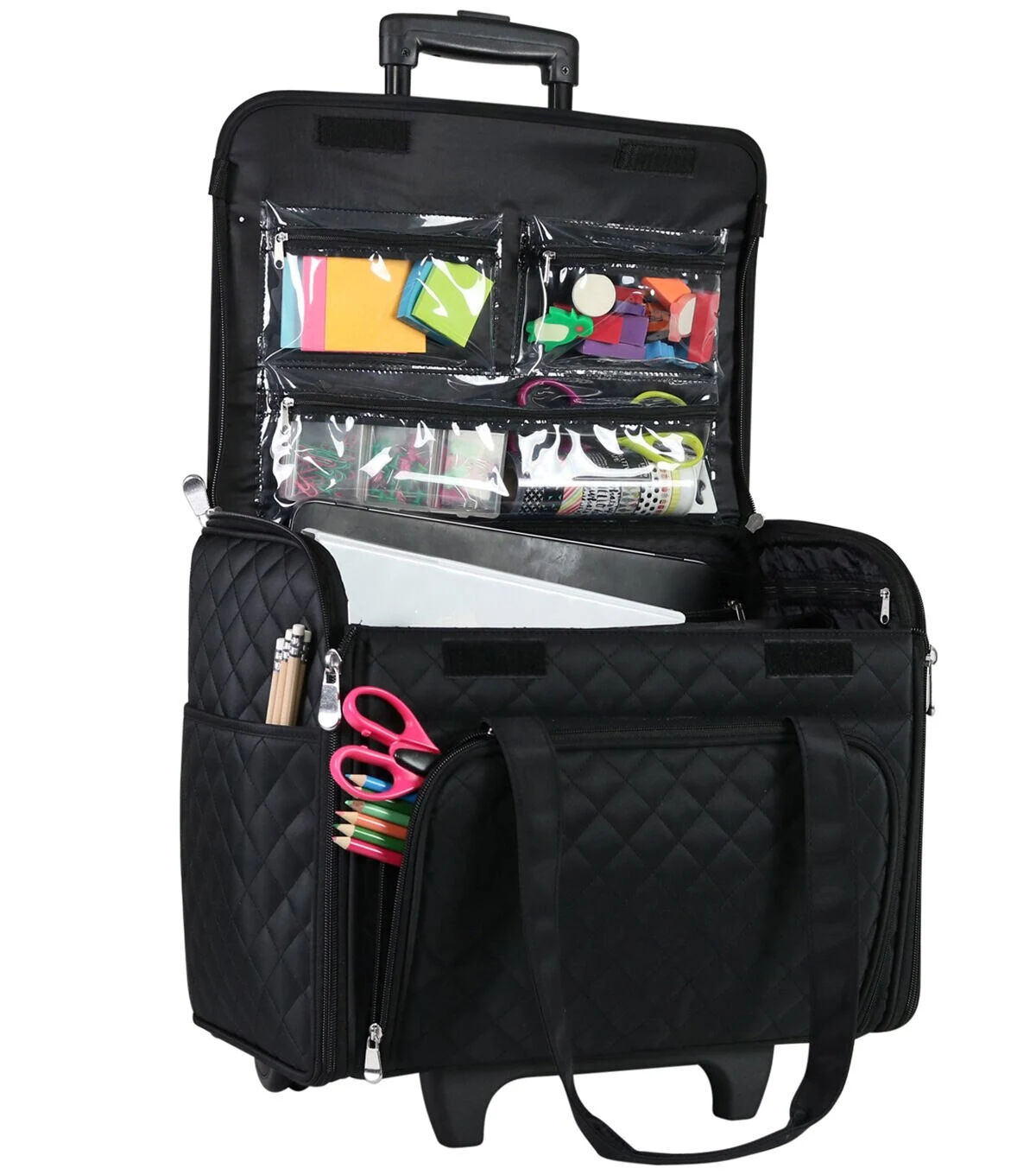 - Portable Rolling Work Bag - Sturdy wheels, telescoping handle, & durable zippers make it easy to carry all of your essentials