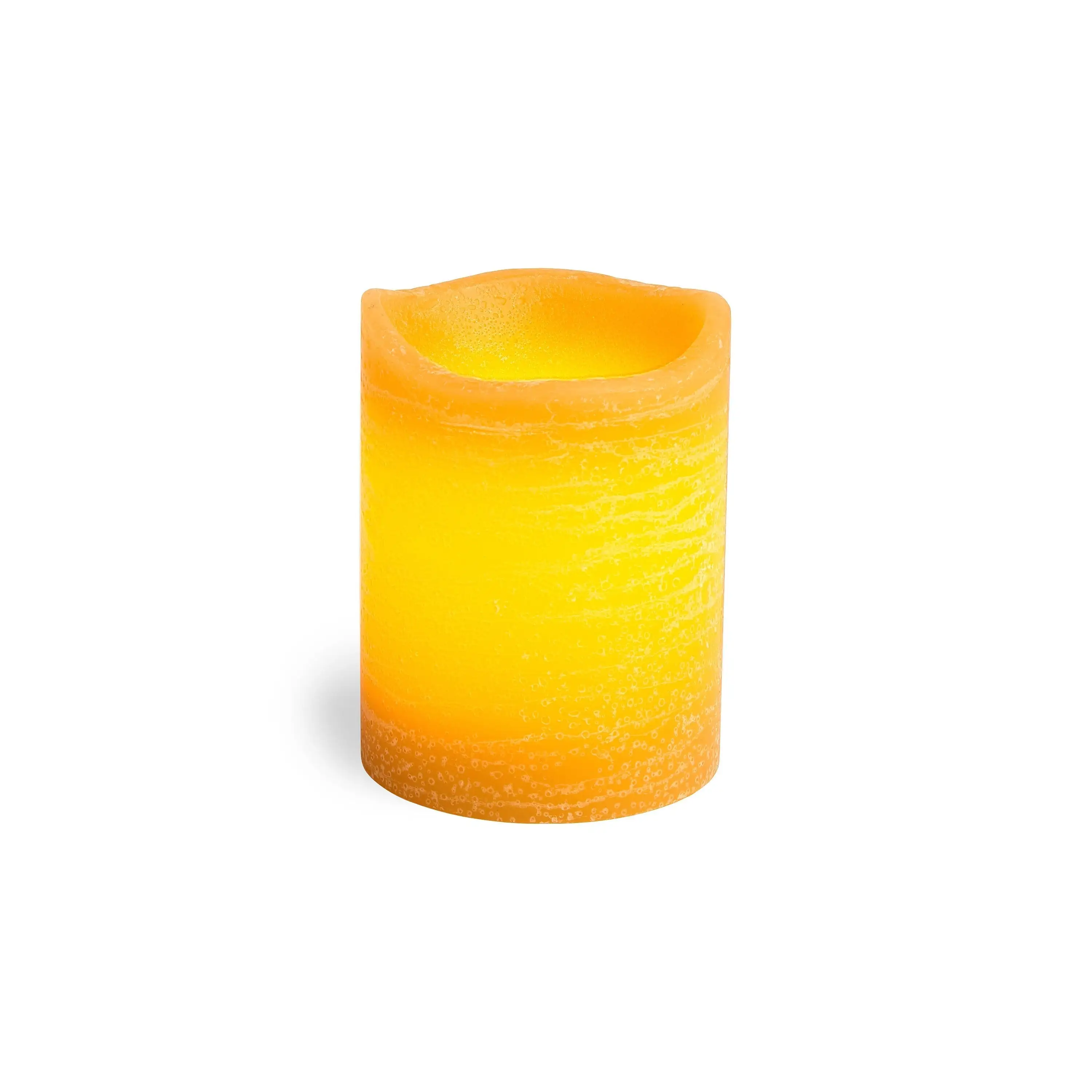 The inviting scent of cinnamon chai and the welcoming glow of an amber LED combine in this flameless pillar candle. A rustic design adds texture and a melted top gives a true candle experience. Features an on andoff switch and a 5 hour timer that lets you customize your illumination. Runs on 2 AA batteries sold separately. Honey finish.