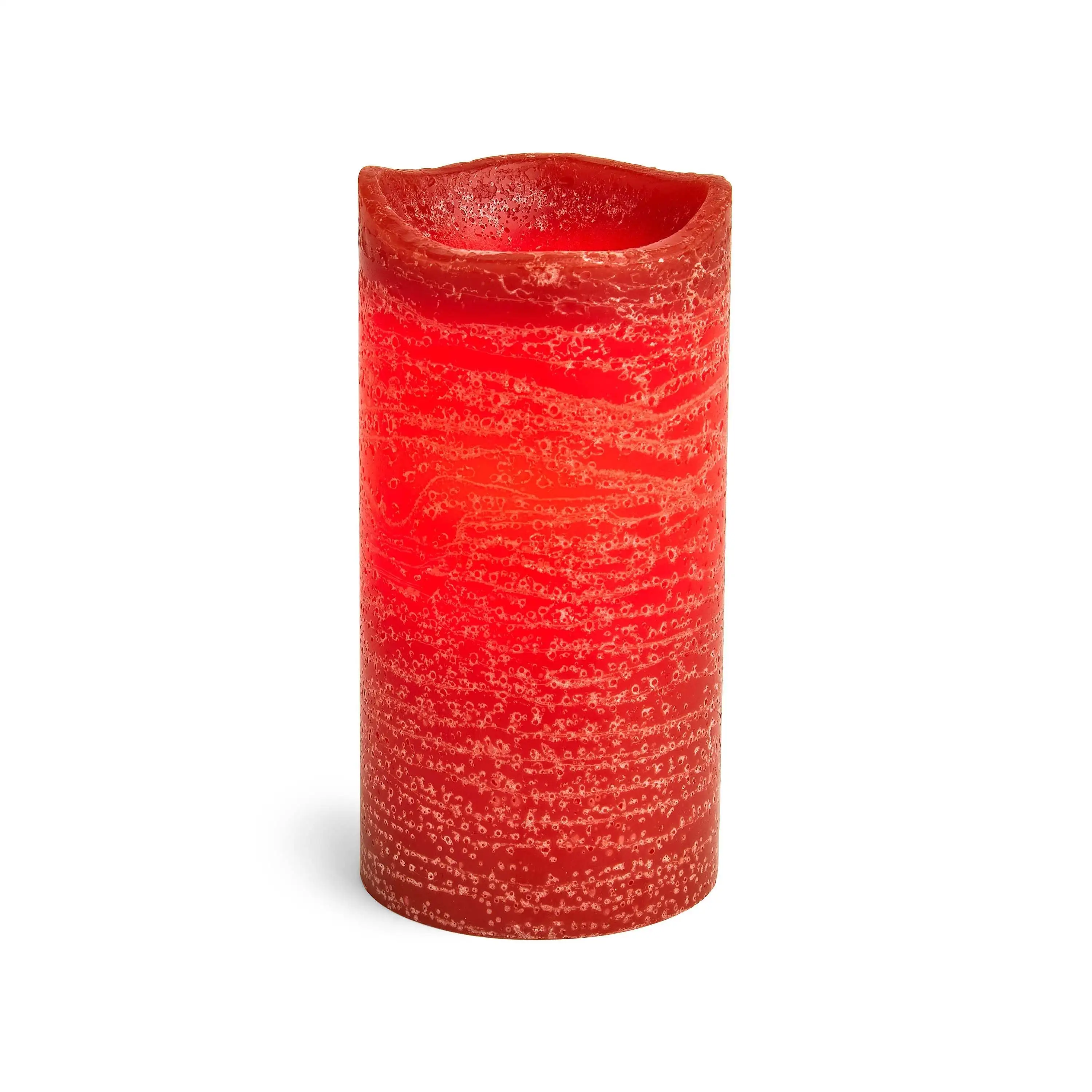 The welcoming scent of pomegranate and the warm glow of an amber LED combine in this flameless pillar candle. A rustic design adds texture and a melted top gives a true candle experience. Features an on and off switch and a 5 hour timer that lets you customize your illumination. Runs on 2 AA batteries sold separately. Currant finish.
