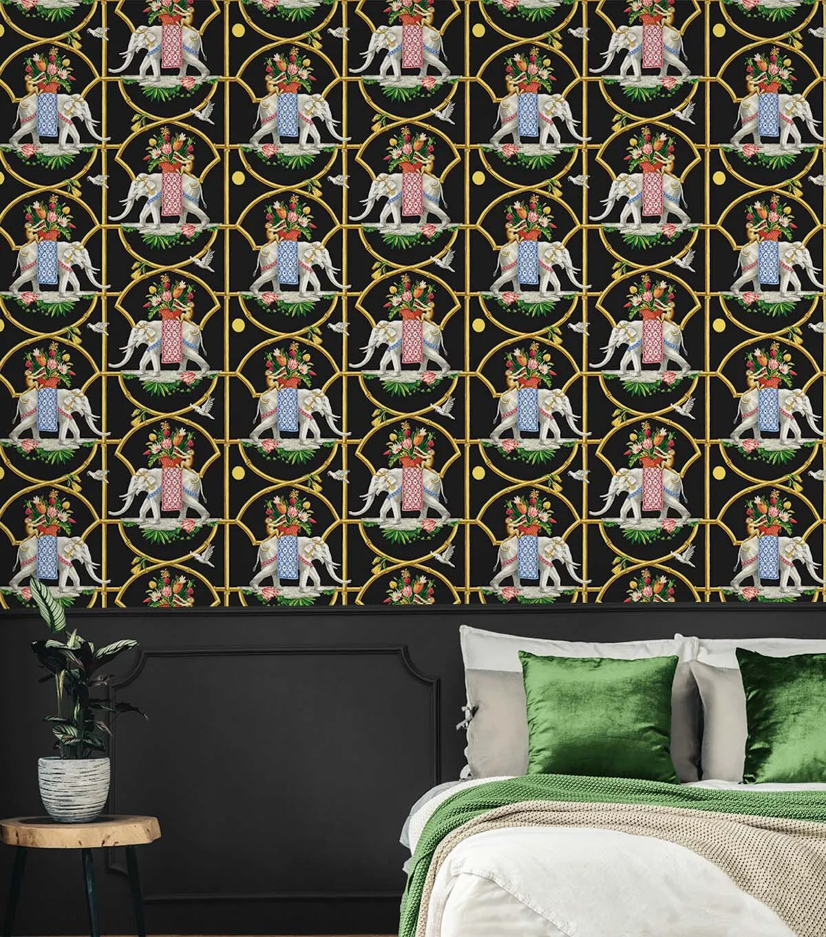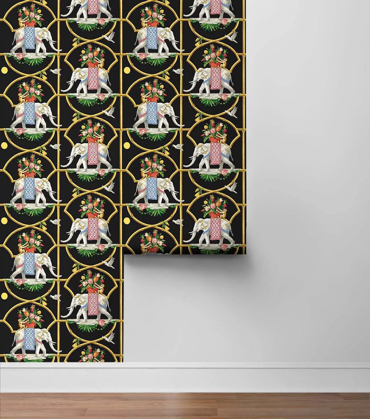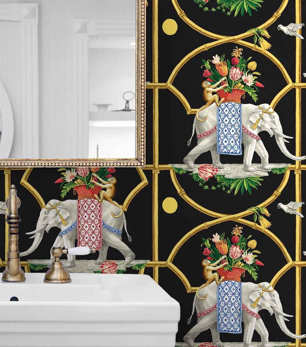 Bamboo lattices frame the scene as majestic elephants enjoy a delightful stroll with their flower filled baskets as simian and avian join their journey. A classic Harrison Howard pattern featuring a unique take on a geometric chinoiserie.