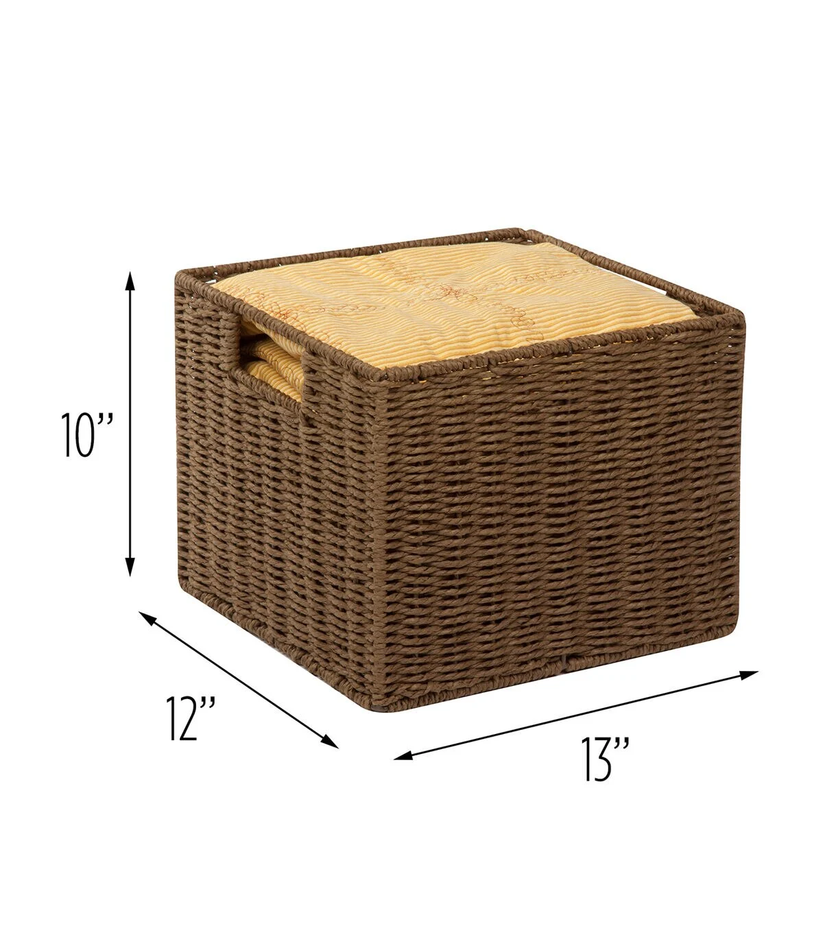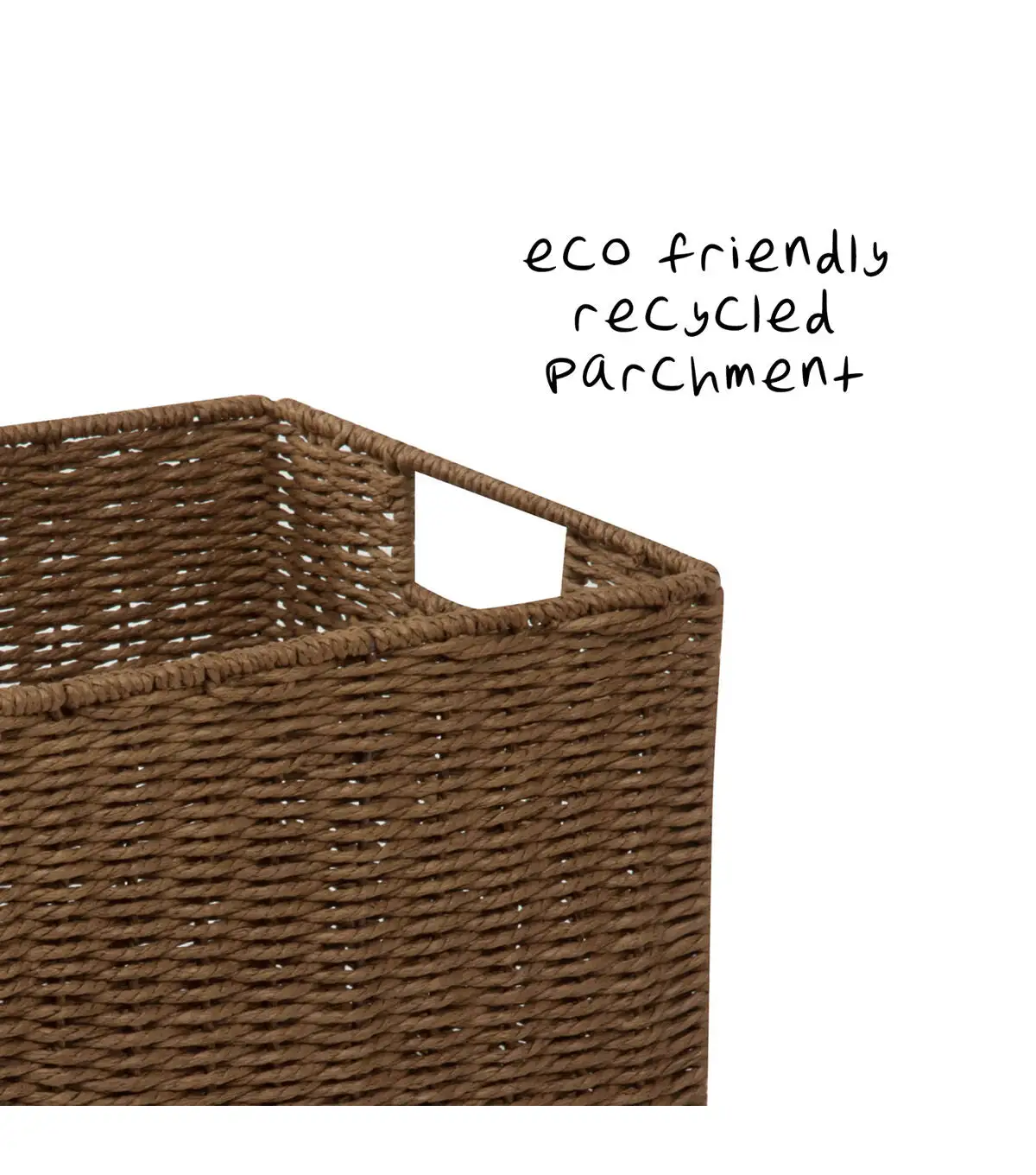 Get clutter in order with this storage basket with liner. Ideal from the kitchen to the bathroom to your home office, this crate works in any room in your home and its easy-grip handles help you get it there. You can feel good carrying it with its recycled and re-purposed parchment, and the tan liner adds an earthy tone to your aesthetic.
