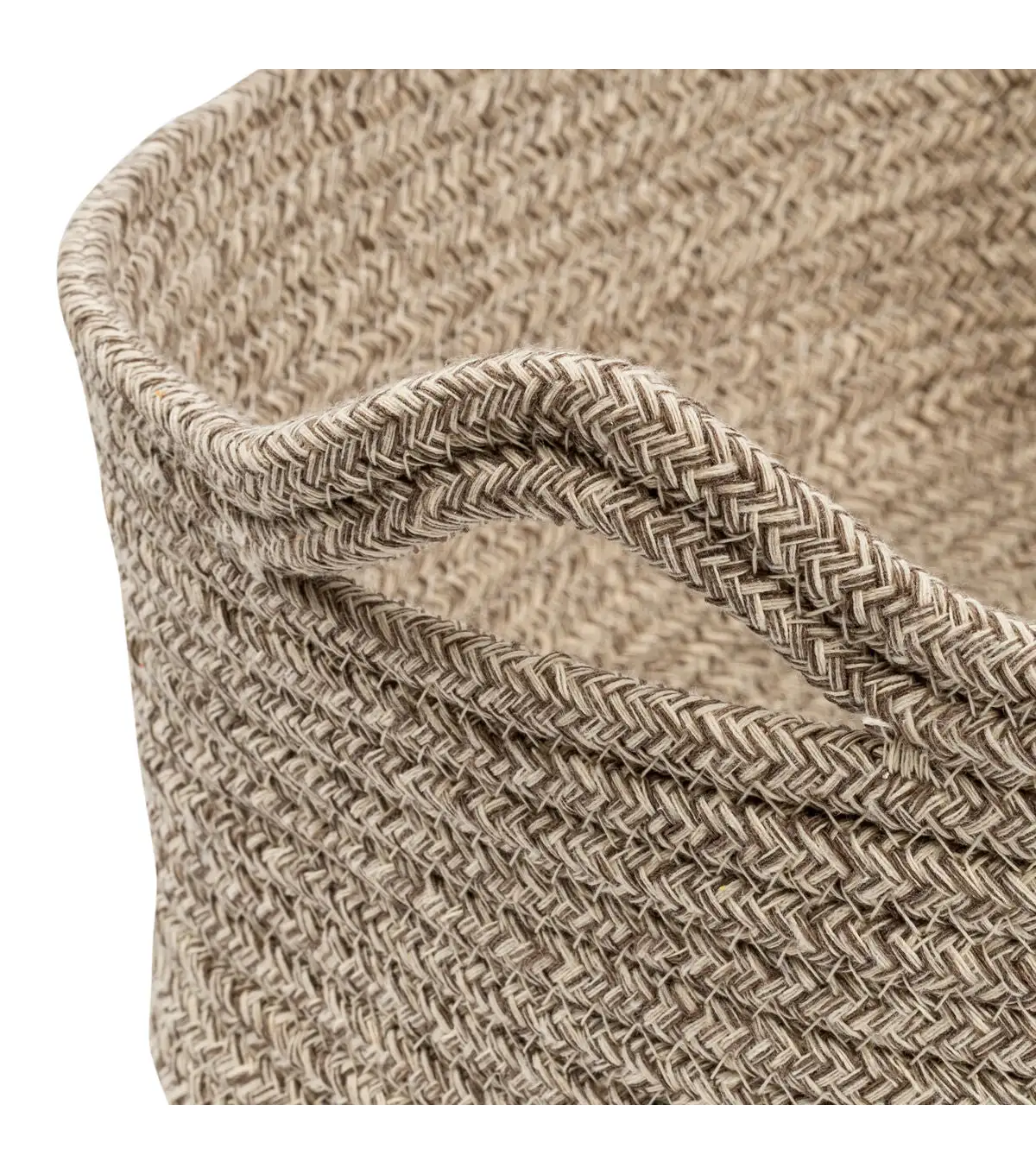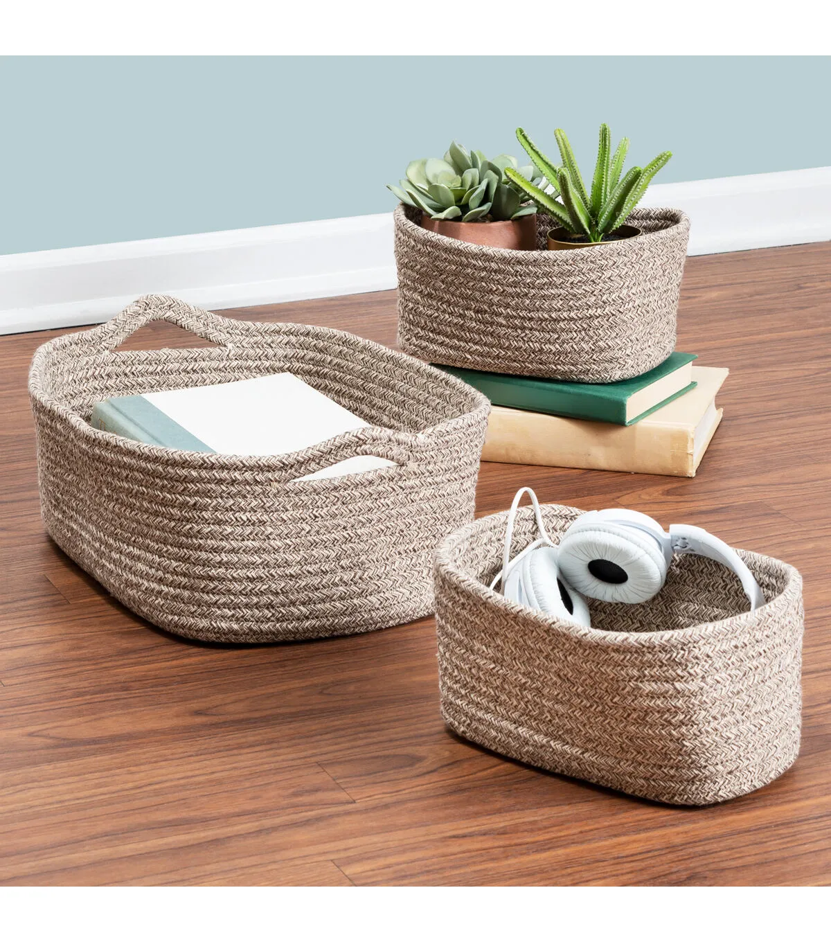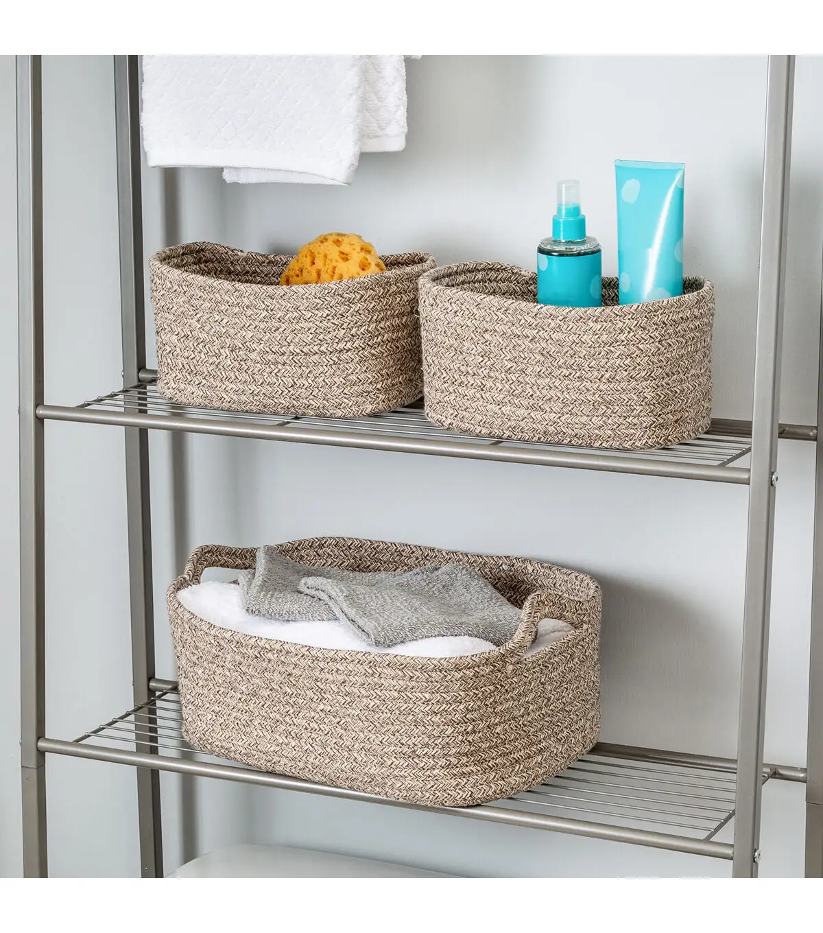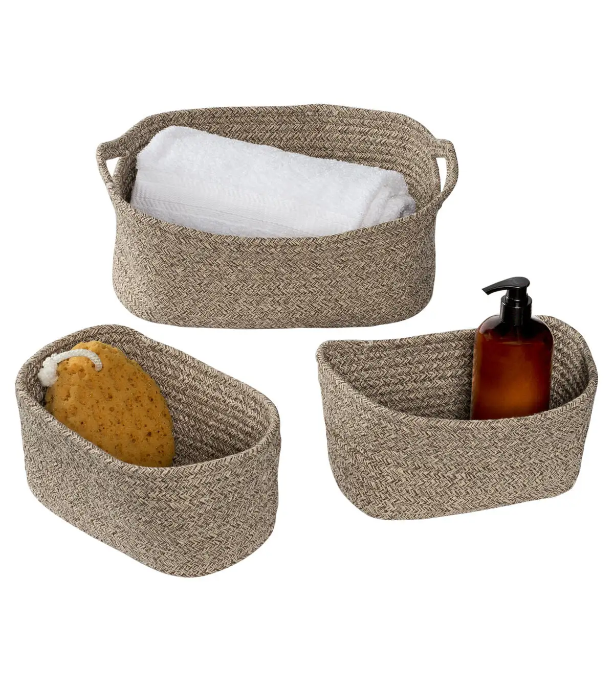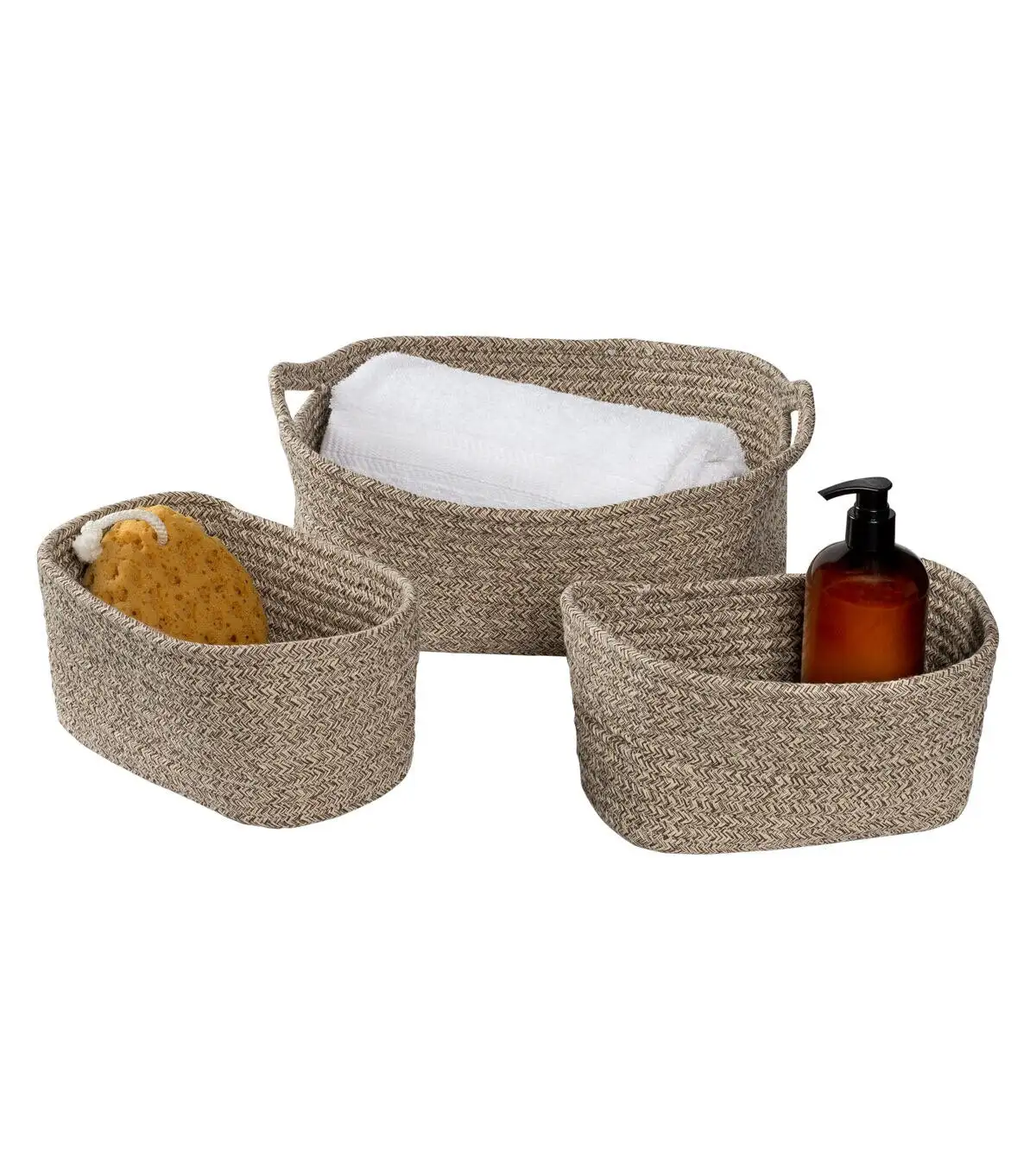 Bathroom storage made easy with these 3 nested baskets made of marled cotton cording. Ideal for small accessory bathroom storage, the two smaller baskets and one large basket are great for hair accessories, makeup and more. Easy-carry handles provide easy transport of your items and the soft aesthetic will ease right into your bathroom space.