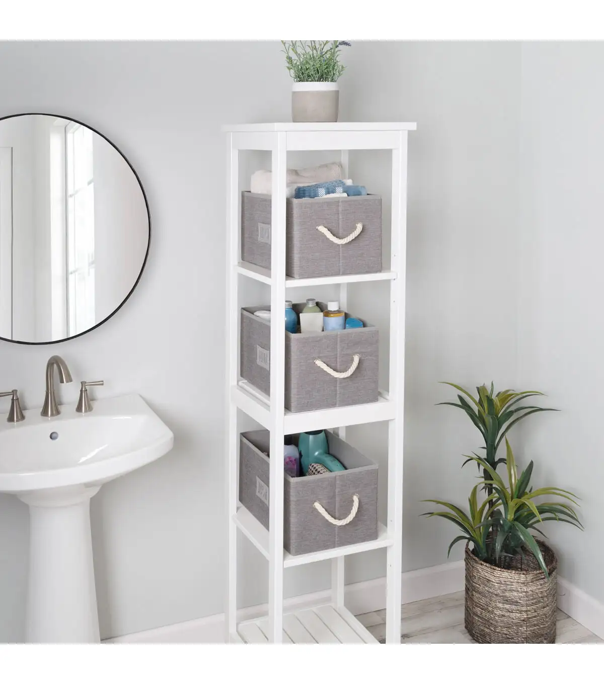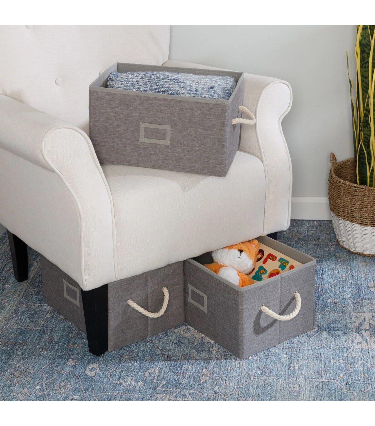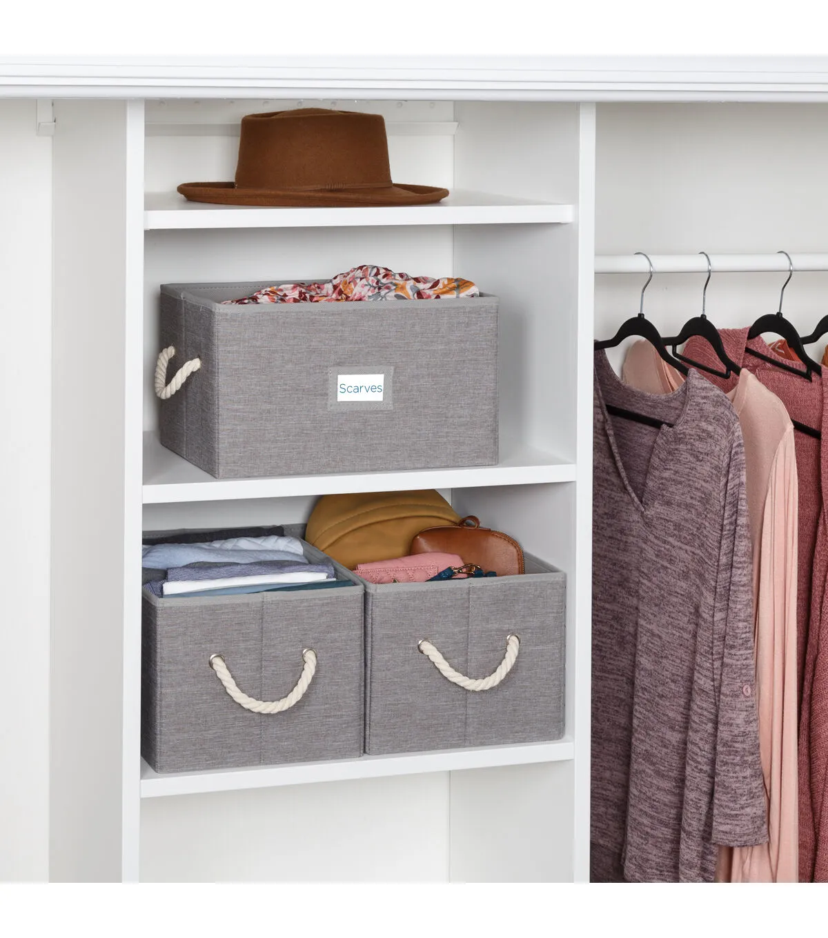 These versatile, large storage bins are perfect for storing clothing, bags, bathing supplies, towels, cleaning supplies, magazines, etc. While large, they are also the perfect size to store on shelves and/or in closets, but also look good and can be left out in the bedroom, bathroom or laundry room. Strong, durable fabric holds up to heavy loads and cotton rope handles allow for easy carrying of bins from room to room.
