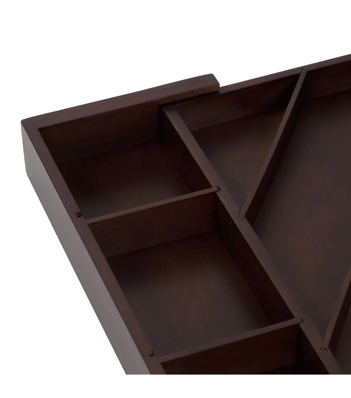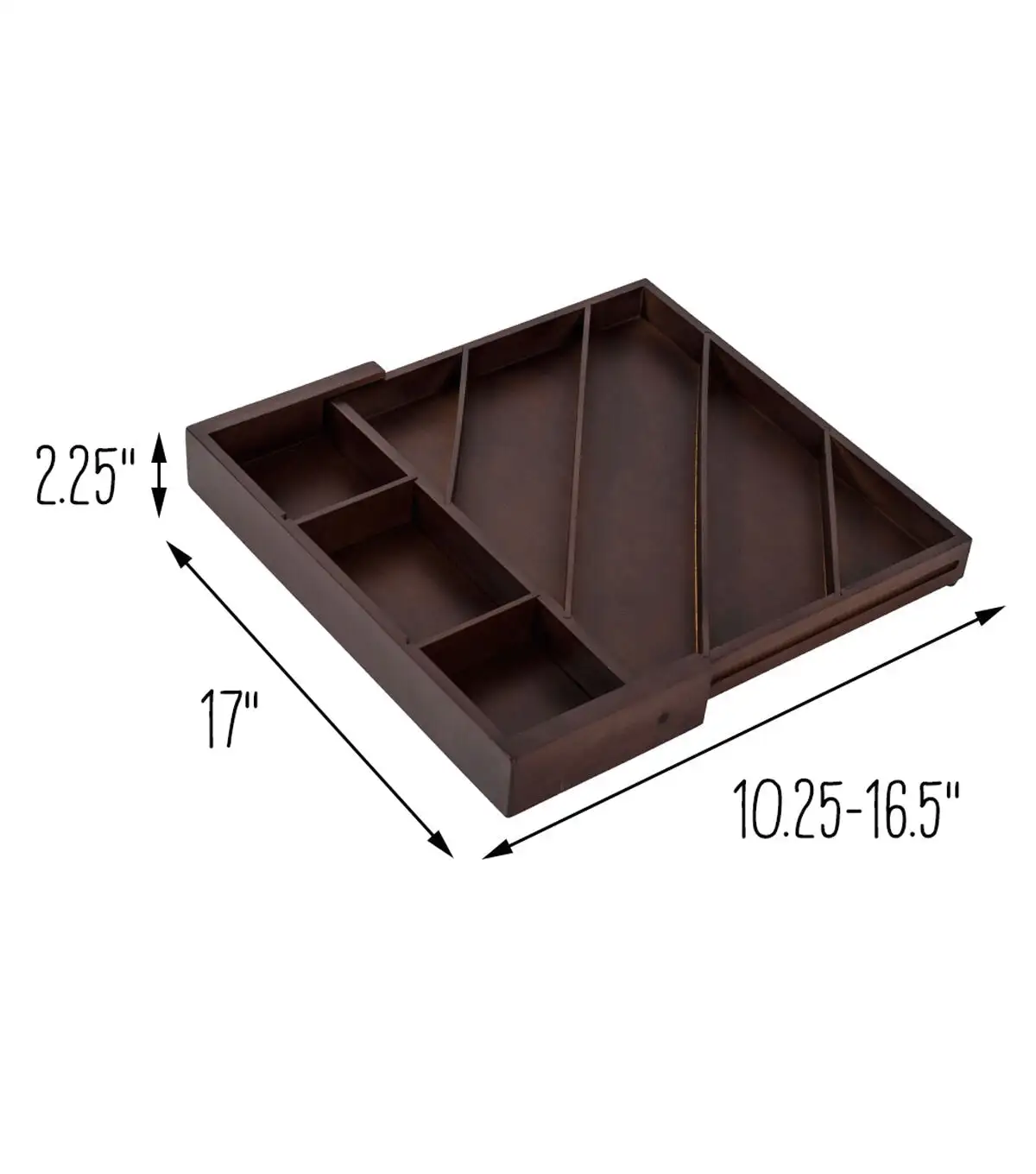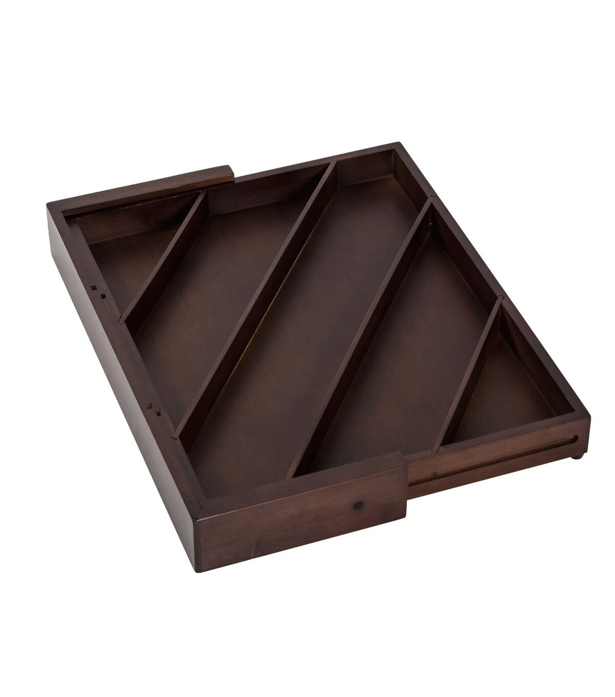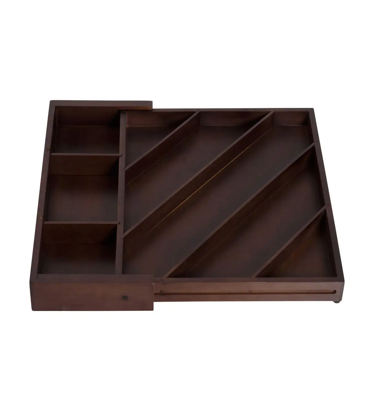 With this expandable bamboo drawer organizer, it only takes a few minutes to take your kitchen drawers from disastrous to disciplined—and keep them that way! Simply empty a drawer, expand your divider to the right size, and pop it in! Instead of one open and unorganized space, you now have anywhere from 5 to 8 compartments to organize everything from utensils to kitchen gadgets. The diagonal design of this adjustable drawer tray makes the most out of every inch of drawer space. At the same time, the two removable dividers on the side compartment allow you to tailor the organizer to your own needs. The strong bamboo build holds up to metal clambering, making it a particularly great knife drawer organizer or silverware tray. Outside the kitchen this bamboo beauty is fantastic for organizing office drawers, bathroom vanity drawers, or any other slide-outs that can use a quick—and long-lasting—clean up.