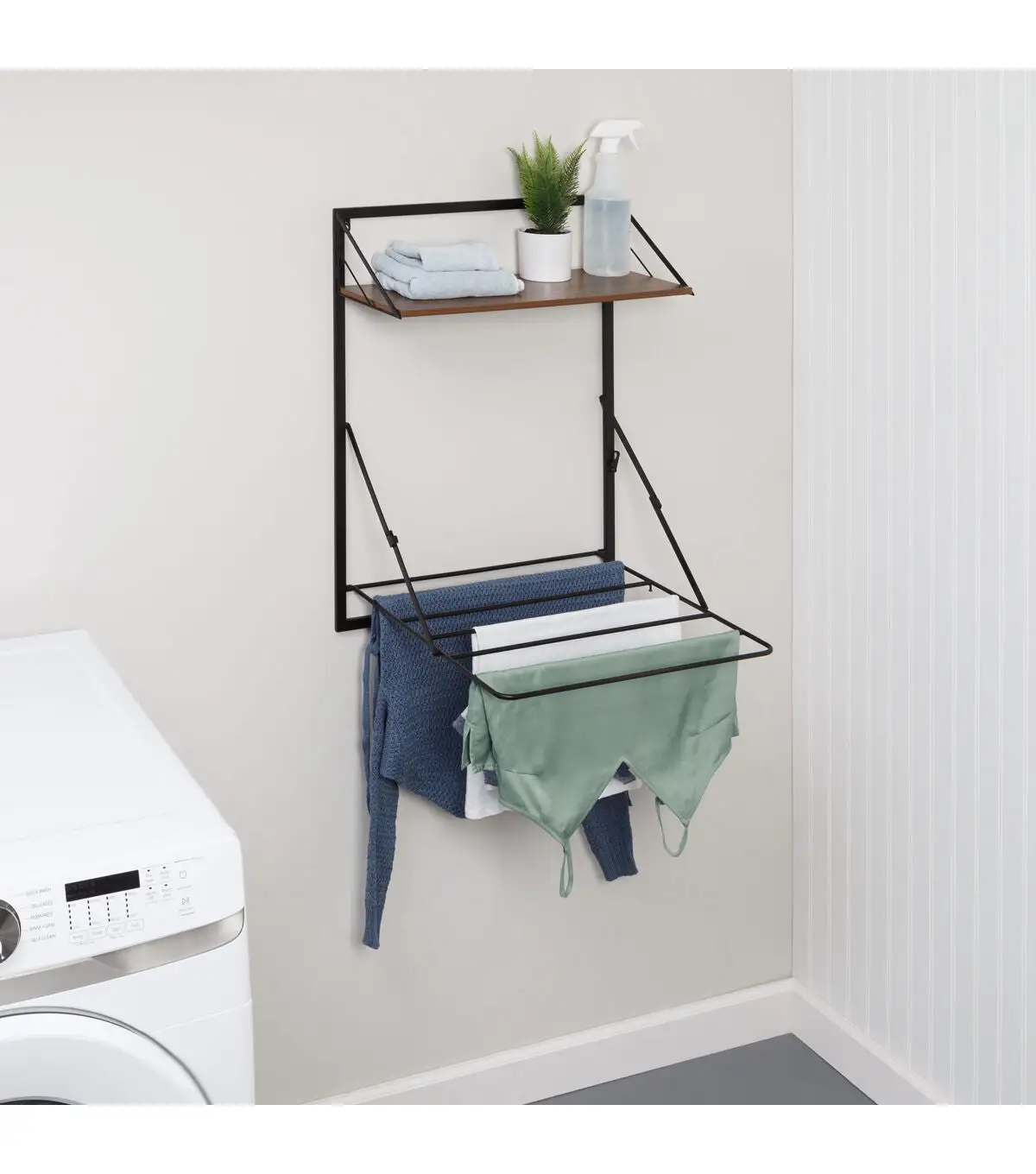 Small laundry rooms deserve versatility, drying space, and modern style—and this wall-mounted drying rack has all of the above! The design pairs a retractable drying rack for clothes with a timeless top shelf to organize laundry essentials or show off your style. While the sleek wood-shelf will always be on display, the laundry rack extends out only when you need it and saves space by folding up to the wall the rest of the time. It offers room to dry everything from delicates to sweaters. No wall space in your laundry room or bedroom? No problem! This retractable laundry room clothes rack comes with door hanging hooks that instantly convert it into an over-the-door drying rack. This design choice is not only great for saving space but also perfect for renters that can’t mount items on walls.