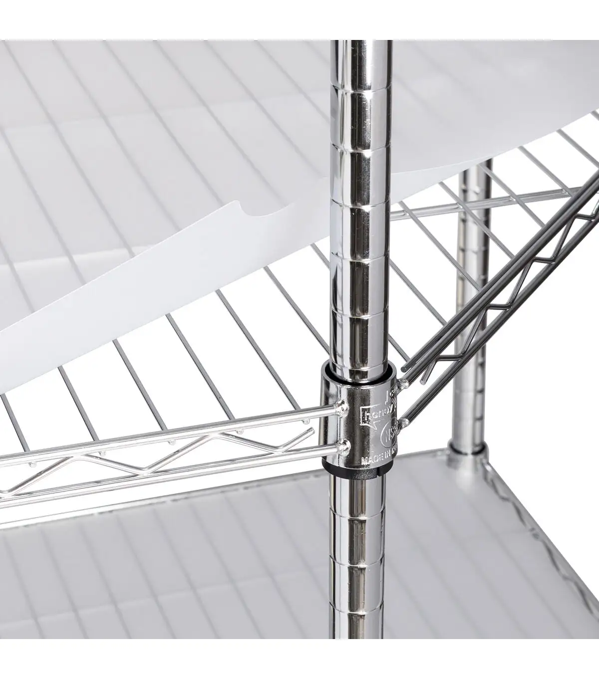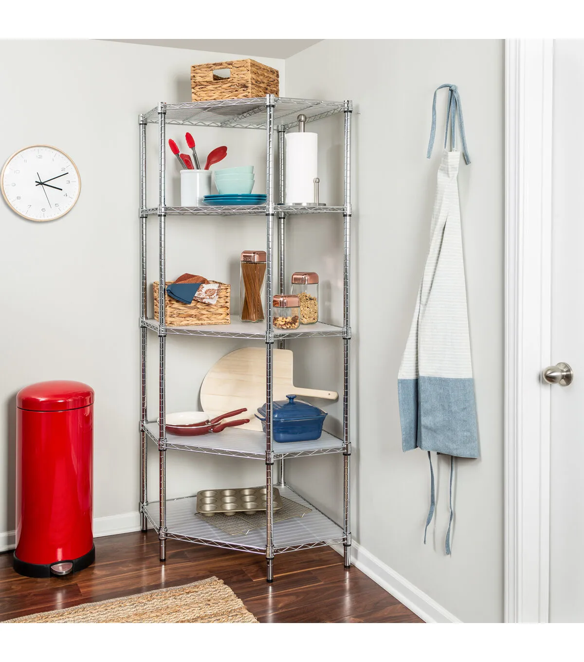 Create visible, accessible storage space instantly with Honey-Can-Do industrial shelving systems. Contemporary chrome finish and 72' steel frame make this unit the perfect blend of style and functionality. Durable enough for the mudroom, garage, or commercial kitchen; this unit is capable of withstanding up to 350lbs per shelf and its unique design makes it perfect for a corner. Adjustable shelves allow you to change the configuration as your storage needs evolve. Clear shelf liners included.