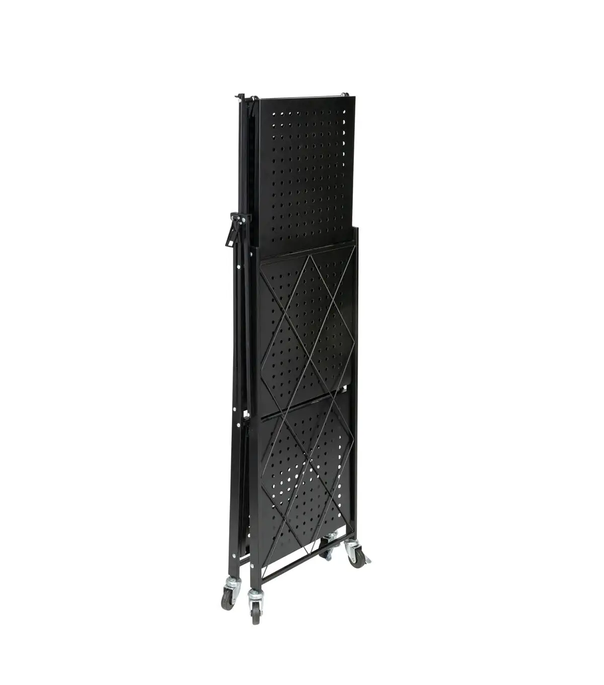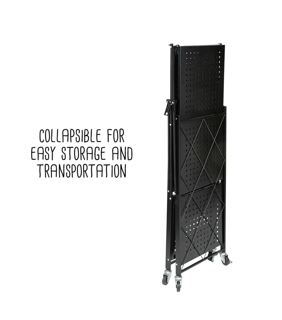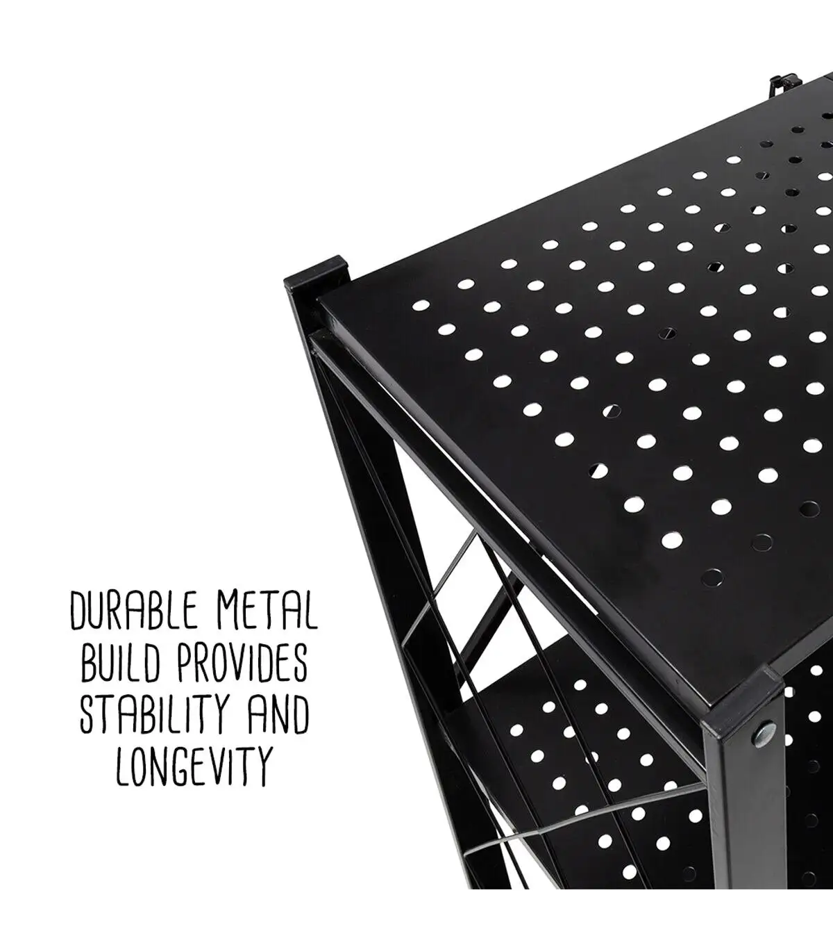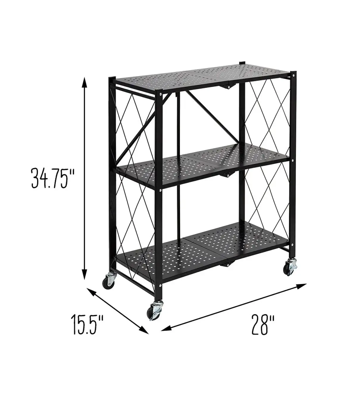 When you unfold this shelf on wheels, you are opening a world of possibilities! Its four casters make it a breeze to move around, while its 3 tiers of shelves provide ample storage space—perfect for plants, cooling baked goods, or as a pop-up bar for parties. Looking for a portable shelf for craft fairs or market booths? With its durable metal build, black finish, geometric wire detailing, and collapsible design, this is a home run. The black metal shelves won't be bothered by the sun or rain. Plus, the open geometric sides allow items to be viewed from all angles, so customers won't miss a thing.