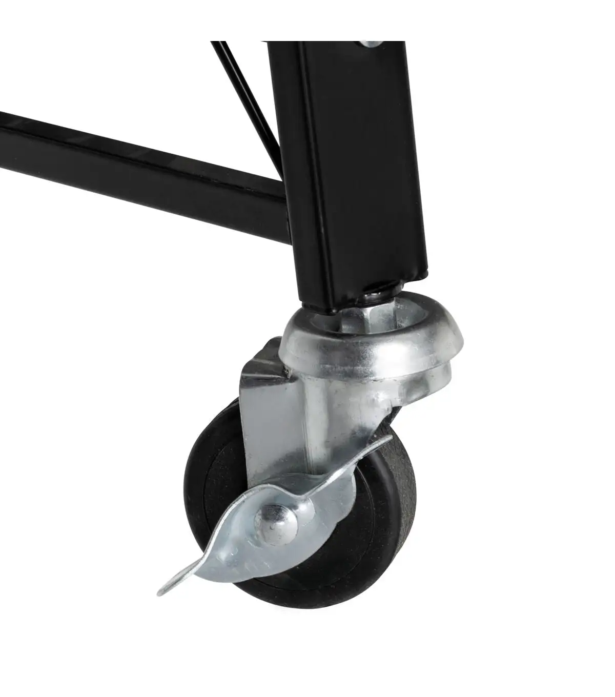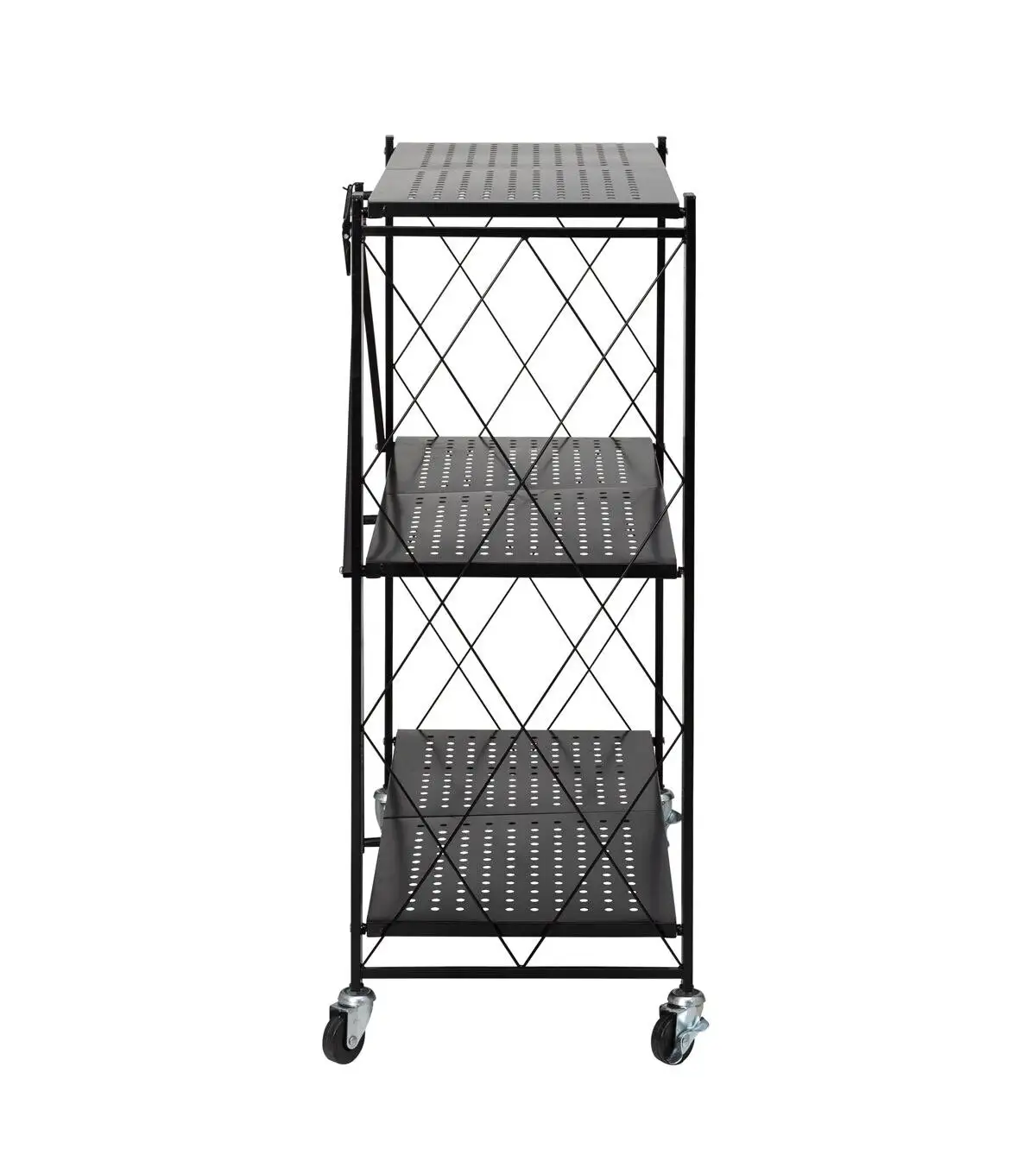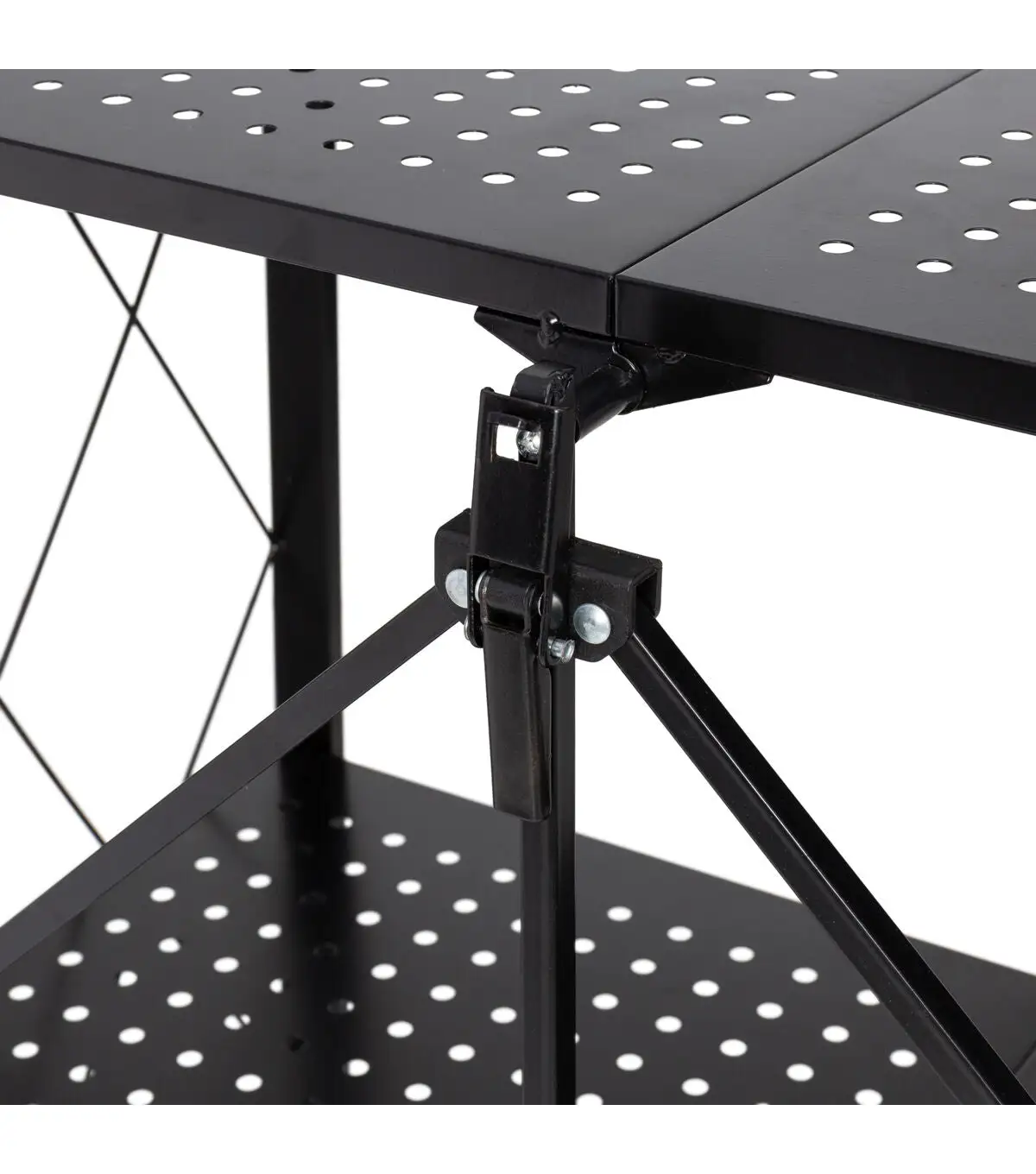 When you unfold this shelf on wheels, you are opening a world of possibilities! Its four casters make it a breeze to move around, while its 3 tiers of shelves provide ample storage space—perfect for plants, cooling baked goods, or as a pop-up bar for parties. Looking for a portable shelf for craft fairs or market booths? With its durable metal build, black finish, geometric wire detailing, and collapsible design, this is a home run. The black metal shelves won't be bothered by the sun or rain. Plus, the open geometric sides allow items to be viewed from all angles, so customers won't miss a thing.