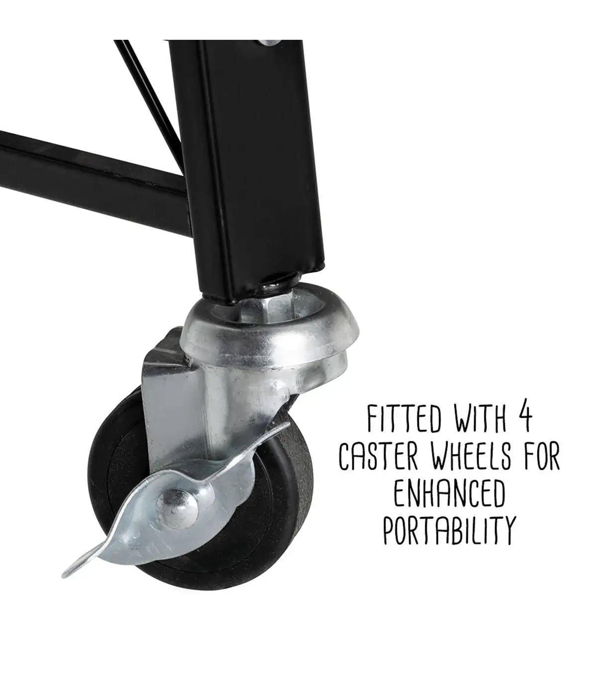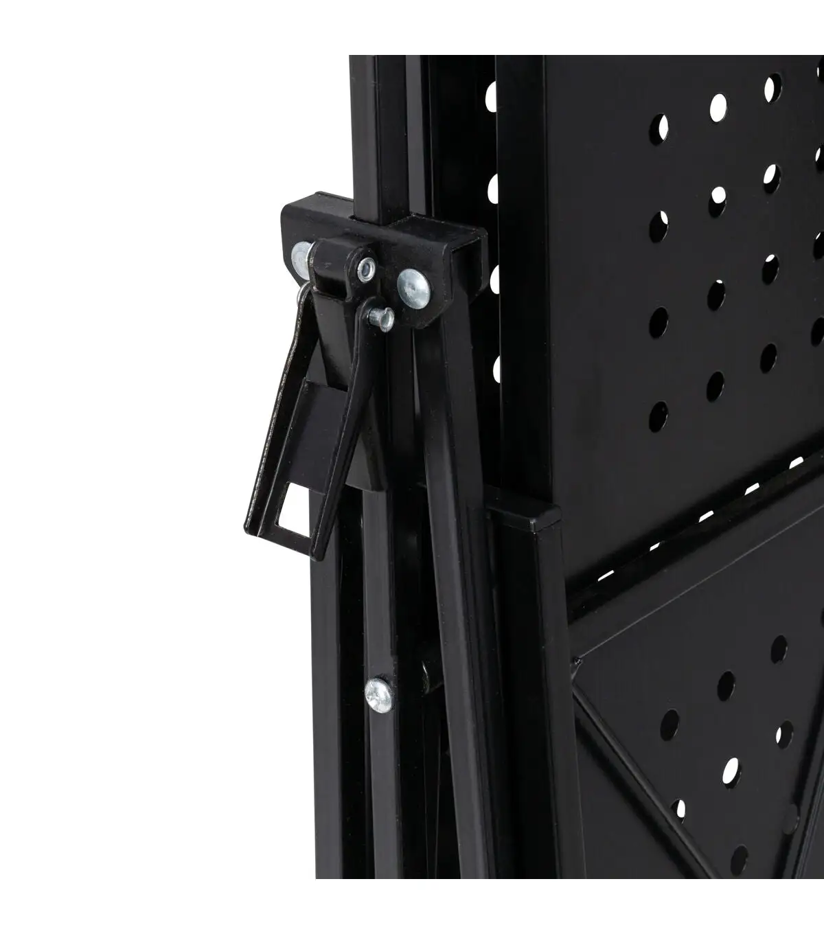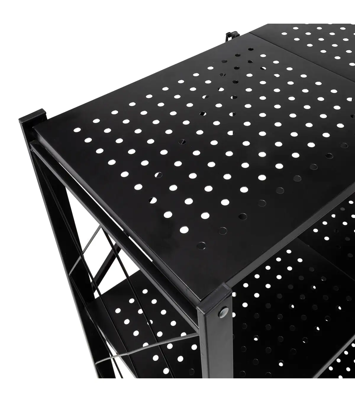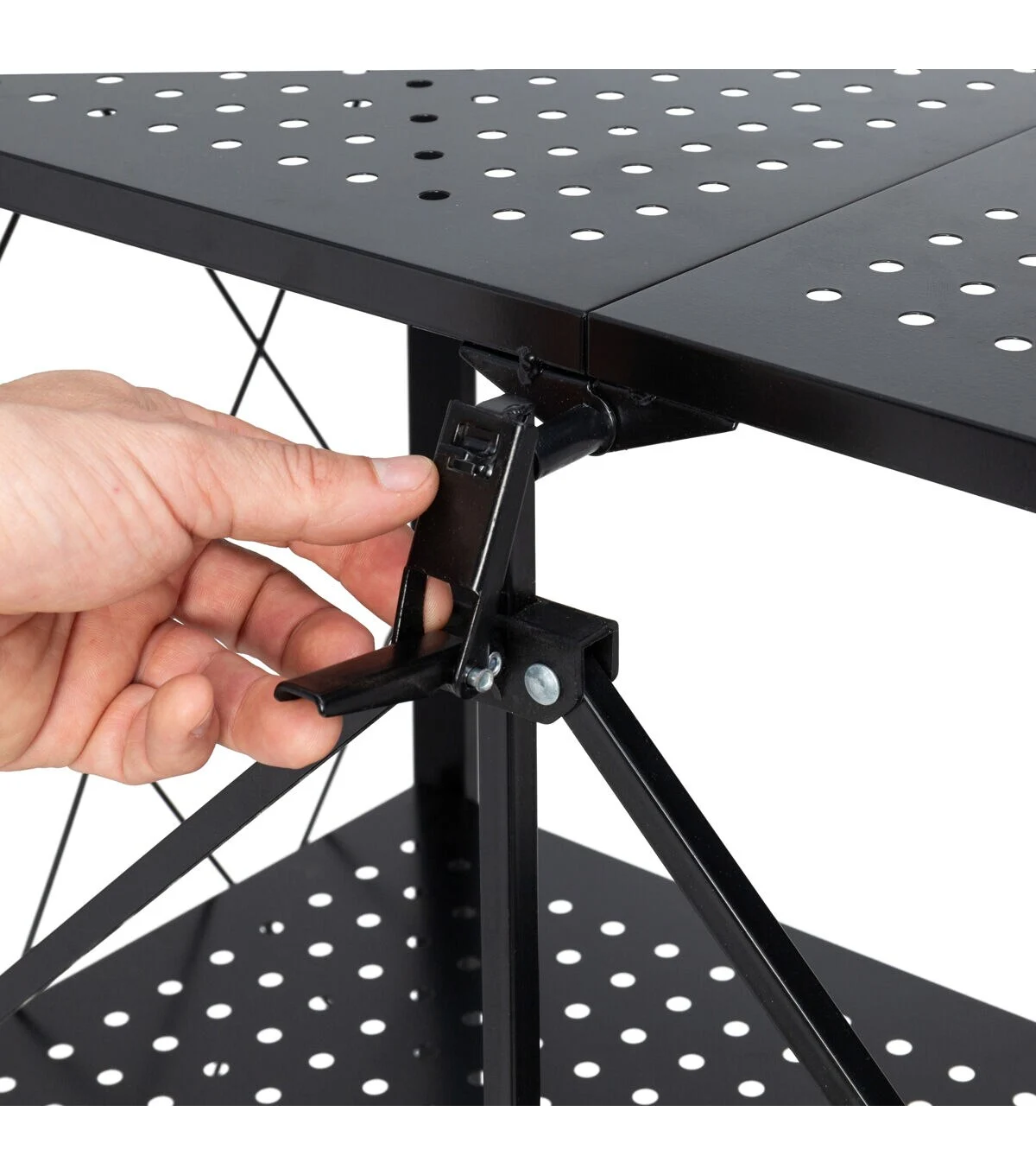 When you unfold this shelf on wheels, you are opening a world of possibilities! Its four casters make it a breeze to move around, while its 3 tiers of shelves provide ample storage space—perfect for plants, cooling baked goods, or as a pop-up bar for parties. Looking for a portable shelf for craft fairs or market booths? With its durable metal build, black finish, geometric wire detailing, and collapsible design, this is a home run. The black metal shelves won't be bothered by the sun or rain. Plus, the open geometric sides allow items to be viewed from all angles, so customers won't miss a thing.