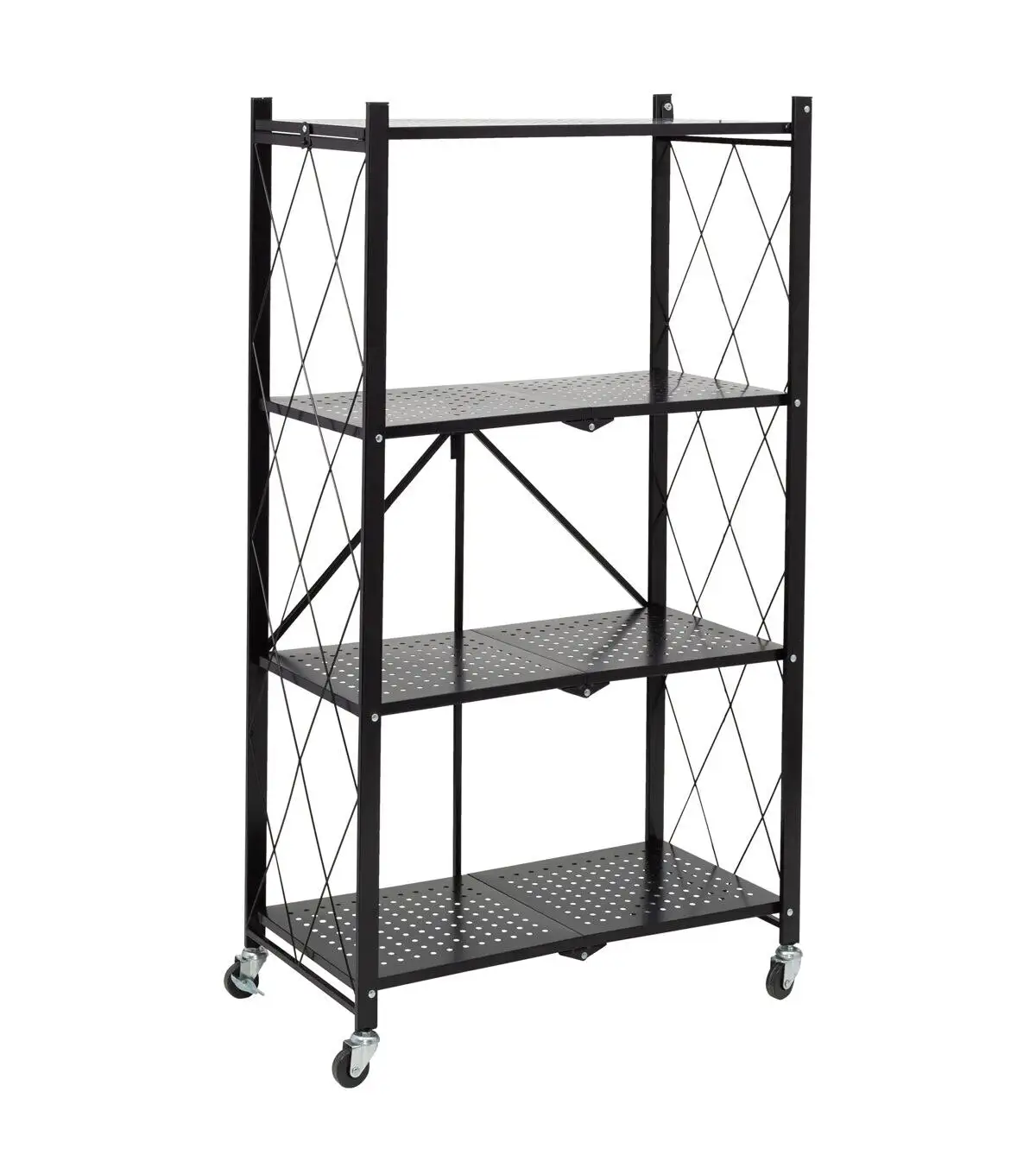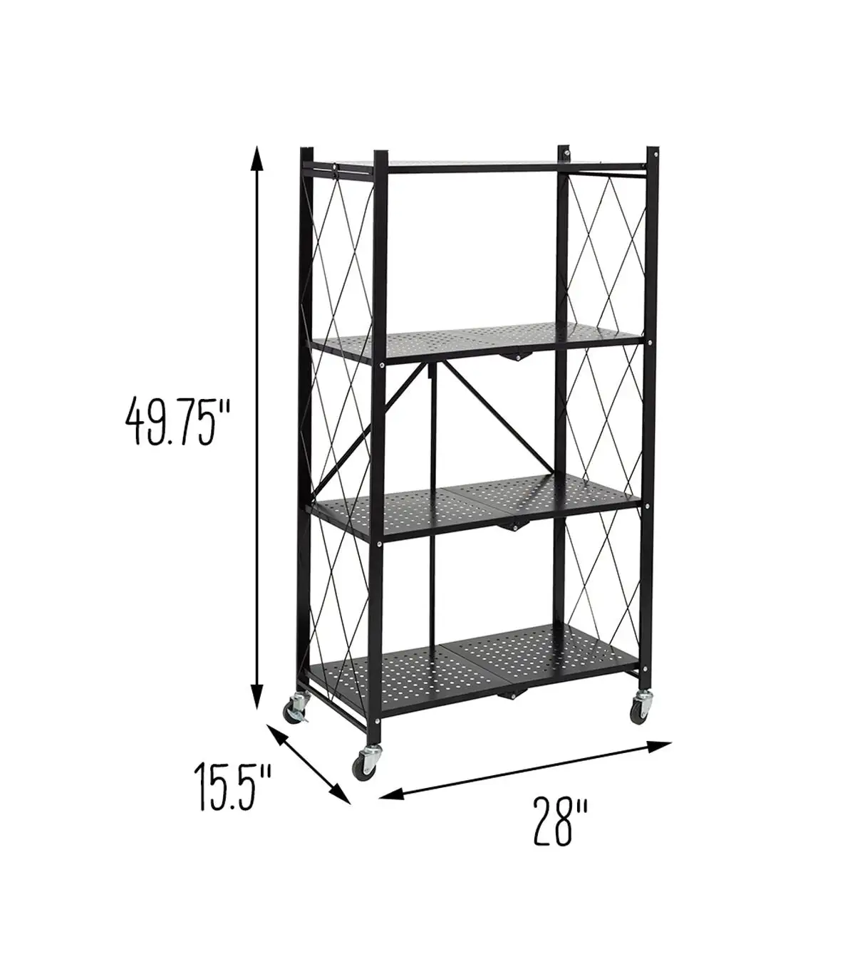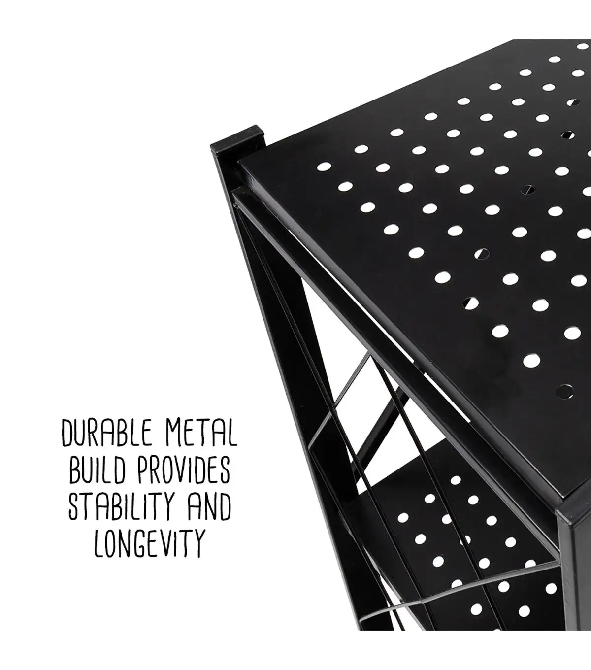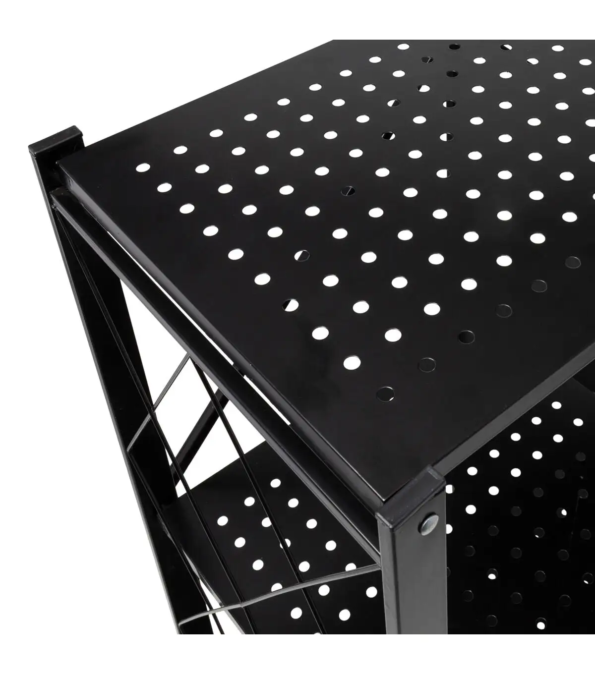 Sturdy and foldable, this collapsible shelf is overflowing with possibilities. Once you unfold this black beauty, its four caster wheels make it a breeze to move around. At the same time, its 4 tiers of shelves provide ample storage space—perfect for craft fairs, cooling baked goods, or as a pop-up bar for parties. Looking for a folding plant stand? With its durable metal build, black finish, and geometric wire detailing, your plants will feel right at home on this shelf on wheels. The perforated metal shelves allow plenty of airflow and won't warp with moisture. Plus, the open wire geometric sides allow light to nourish your plants from all angles.