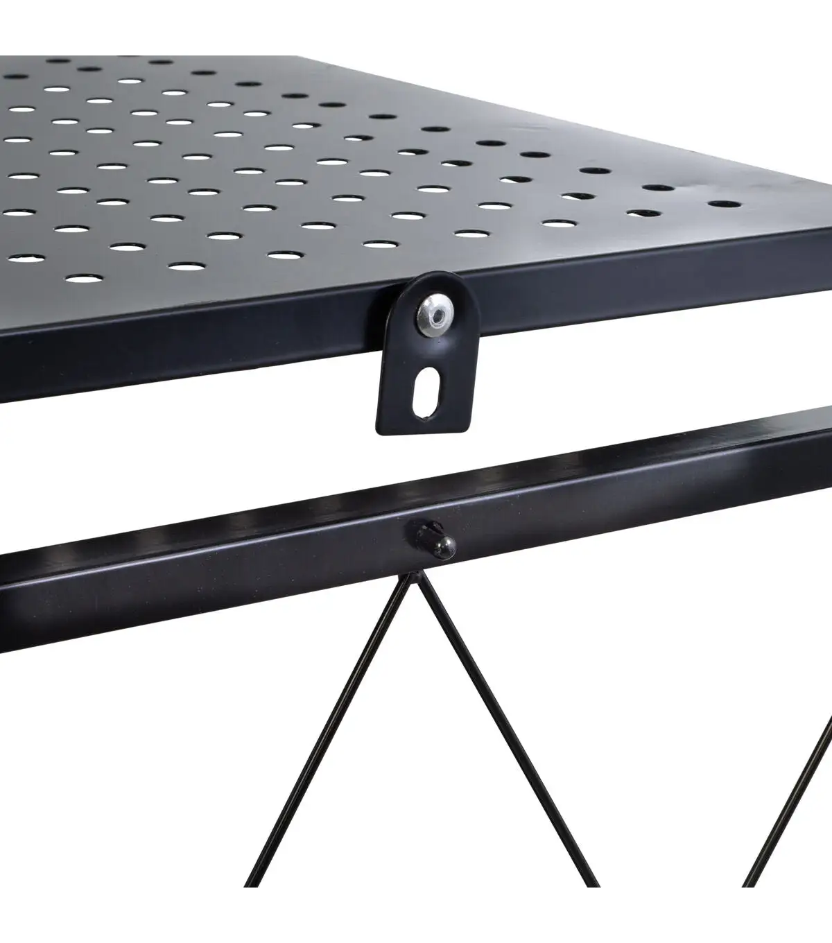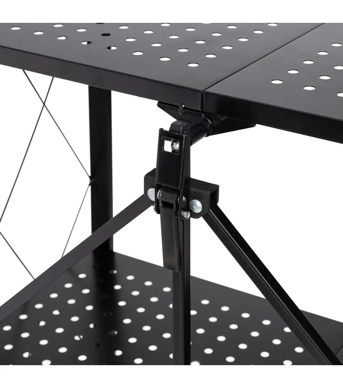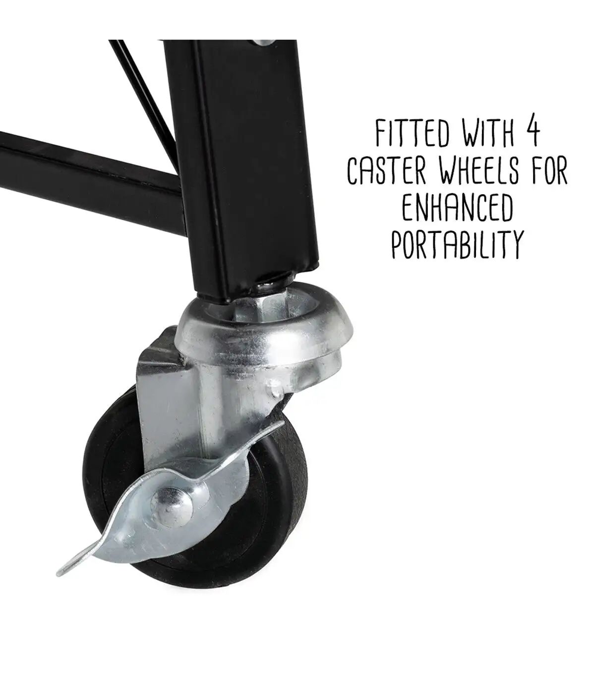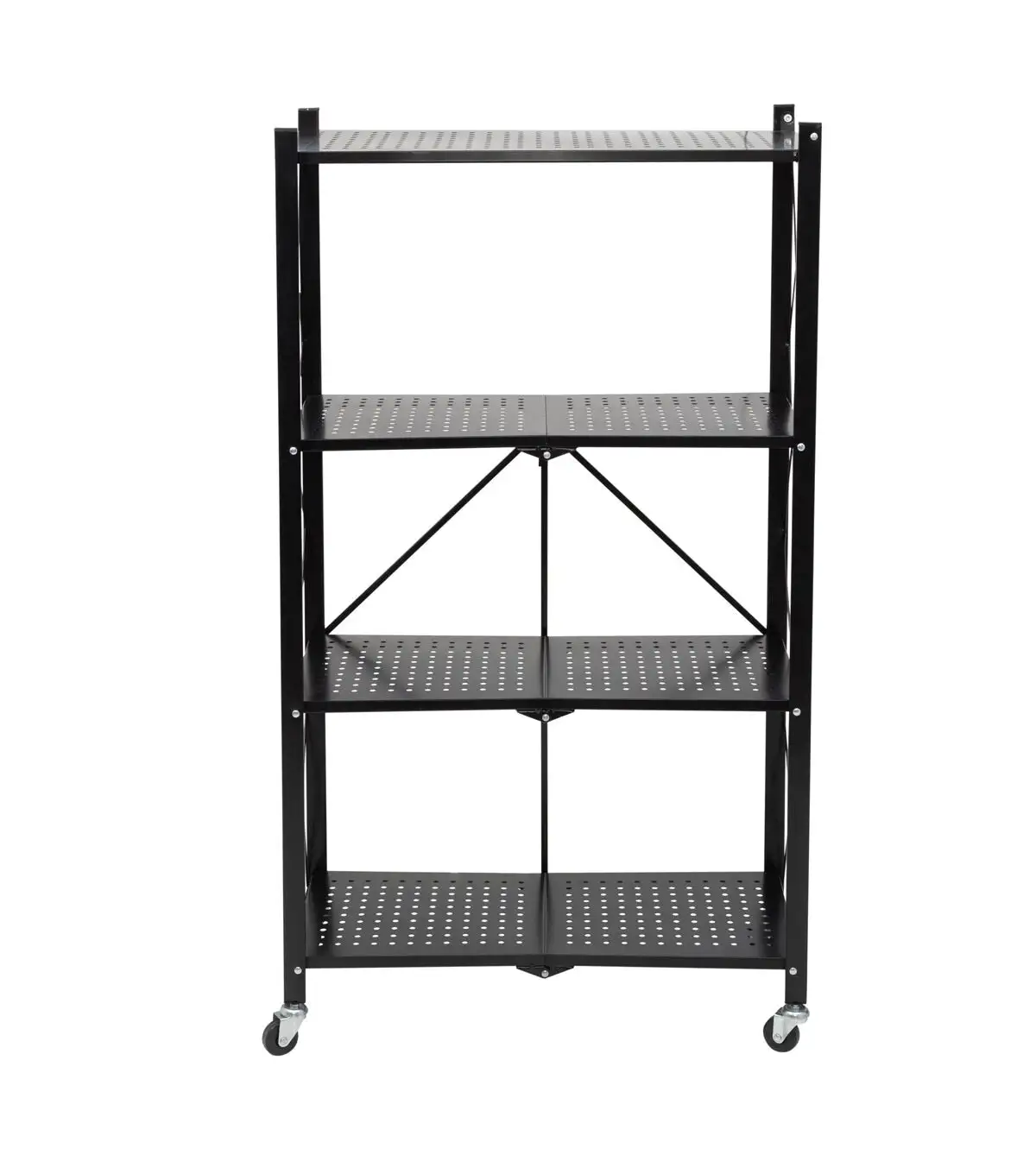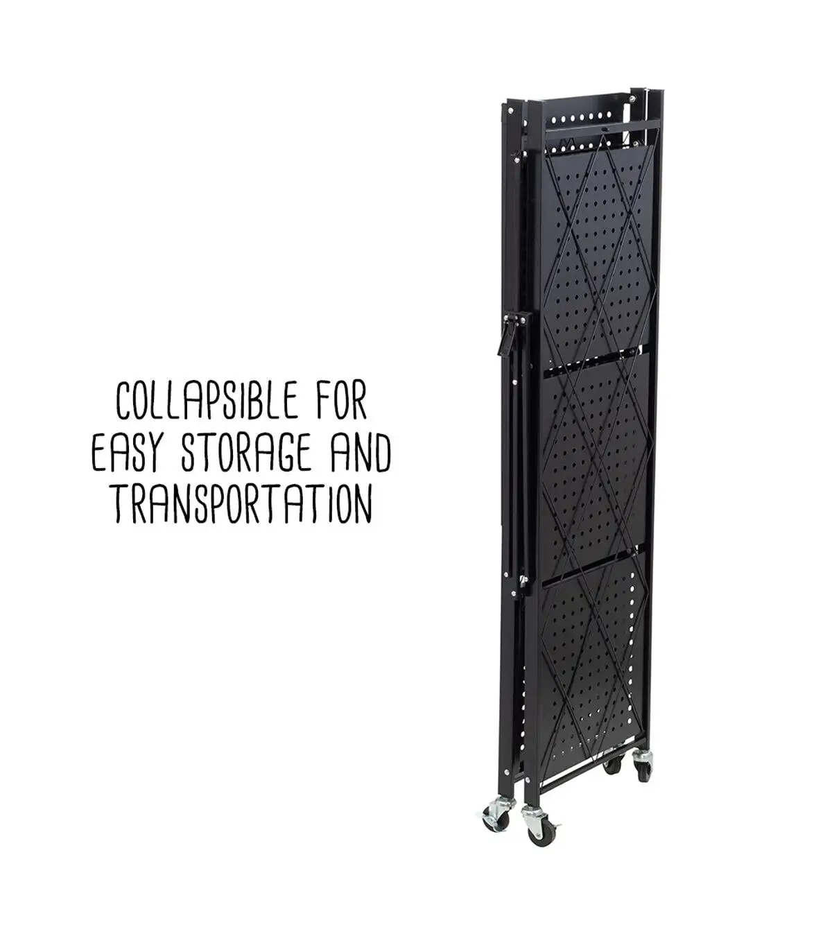 Sturdy and foldable, this collapsible shelf is overflowing with possibilities. Once you unfold this black beauty, its four caster wheels make it a breeze to move around. At the same time, its 4 tiers of shelves provide ample storage space—perfect for craft fairs, cooling baked goods, or as a pop-up bar for parties. Looking for a folding plant stand? With its durable metal build, black finish, and geometric wire detailing, your plants will feel right at home on this shelf on wheels. The perforated metal shelves allow plenty of airflow and won't warp with moisture. Plus, the open wire geometric sides allow light to nourish your plants from all angles.