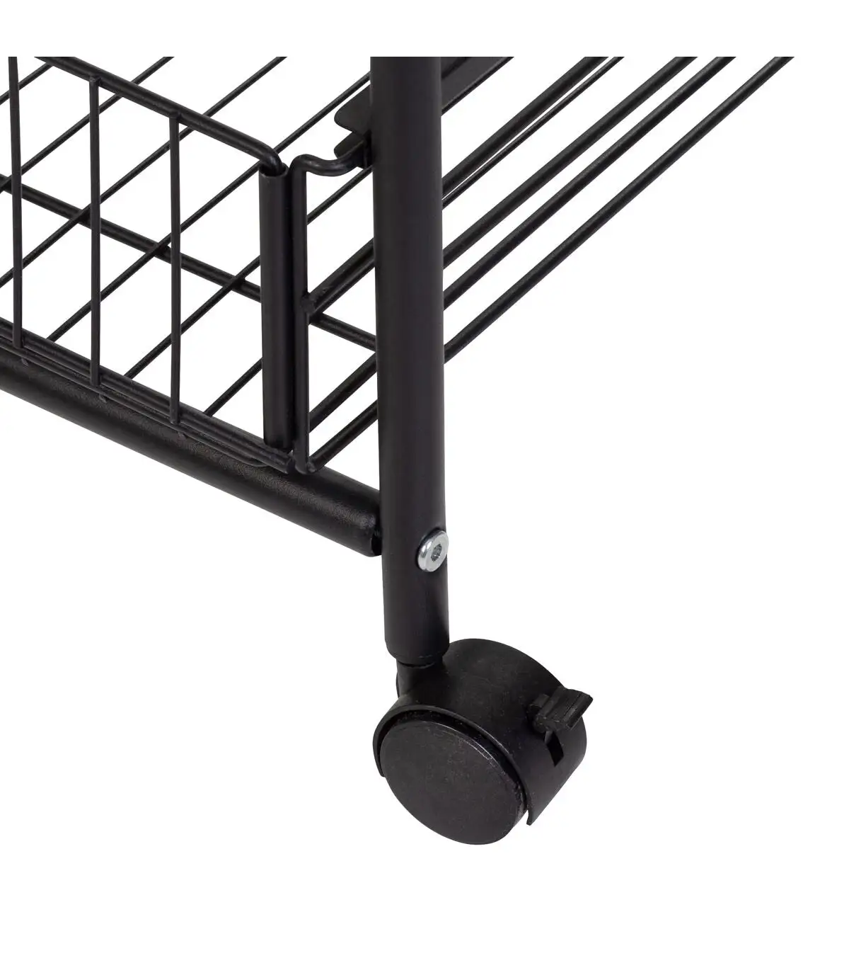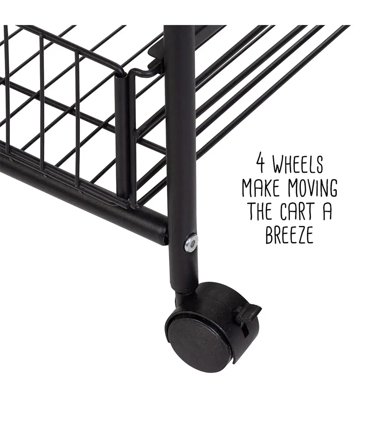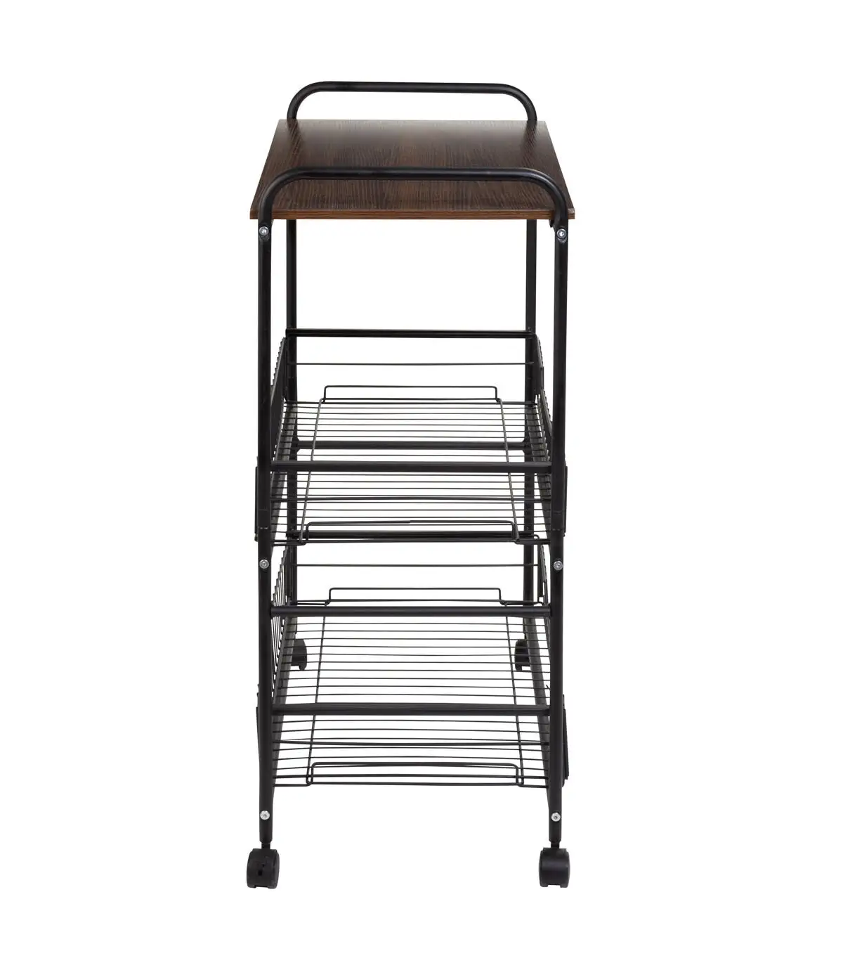 Whether used as a microwave stand or a farmhouse rolling cart, this 3-tier cart is crafted to organize your home in style! The top shelf finished in a warm natural tone can hold everything from plants to art supplies, while the pull-out baskets are ready to organize your clutter. The wire baskets will keep everything corralled while this cart is on the go. Once stationary, the open design and slide-out function allow you to see exactly what you have on hand and easily access it. Its simple wood and metal build offer a timeless feel that transcends trends, while its durability offers endless years of organization.