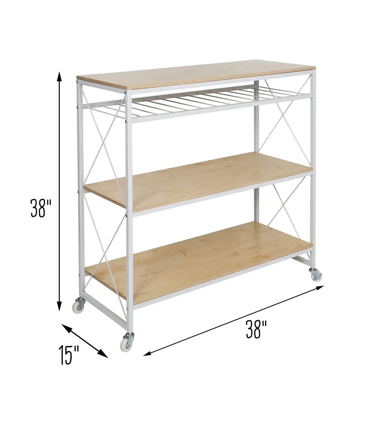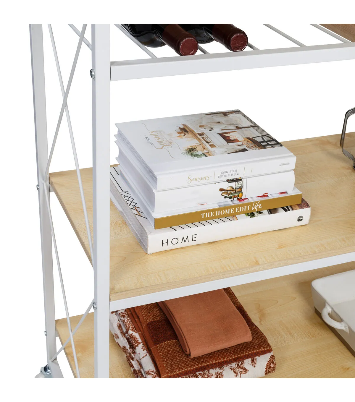 This versatile jack-of-all-trades kitchen island is perfect for keeping your kitchen organized. Store kitchen tools, small appliances, accessories and more. And whether entertaining or prepping, the easy-gliding wheels allow you to move the island around to its most ideal location and lock it in place when you get it there. A wide wide thin shelf is ideal for storing flat kitchen acessories like cutting boards, baking sheets and serving trays, and even bottles of wine. The island's strong metal frame makes it the perfect kitchen companion to stand up to everyday use.