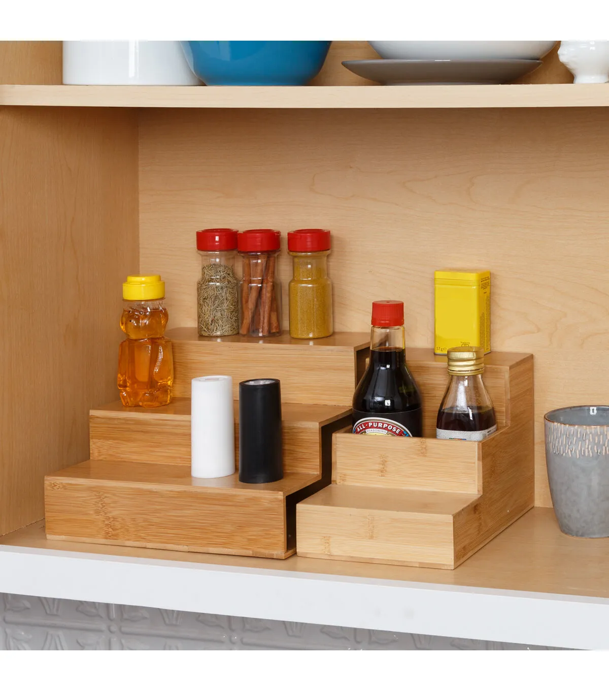 - Bamboo expandable spice rack with natural finish