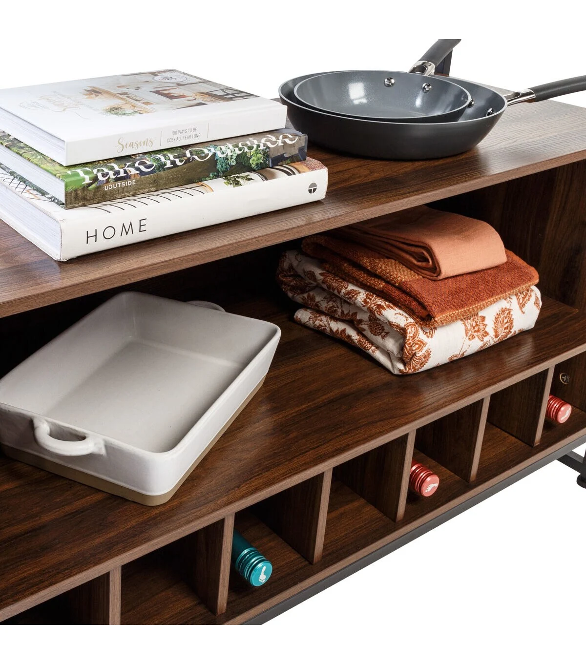 The perfect kitchen companion, this bakers rack will open up countertop and cabinet space and allow you to store large and small kitchen necessities all in one place. A row of wine bottle storage at the bottom of the rack is an added feature that holds 7 bottles of wine. Thinner shelf spaces are convenient for storing baking sheets and cutting boards, while standard shelves provide ample space for a microwave or a mixer. A wire grid backing with two baskets and five 'S' hooks provides vertical storage space for holding spices or hanging spoons. This multi-funtional all-in-one bakers rack has a sturdy steel frame that will allow it to keep you company in the kitchen for years to come.