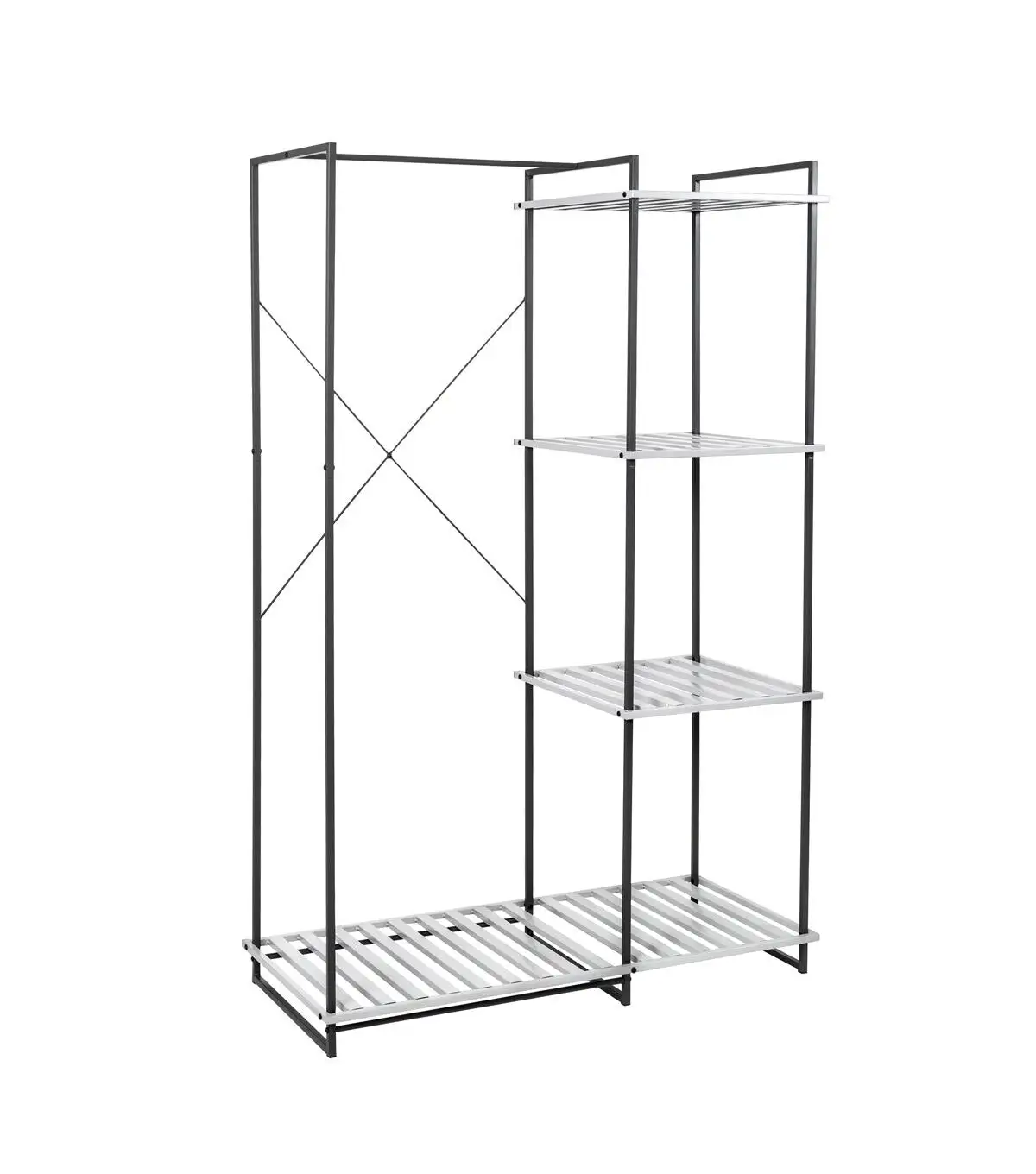 - Four slatted shelves keep go-to handbags, shoes, and accessories at hand