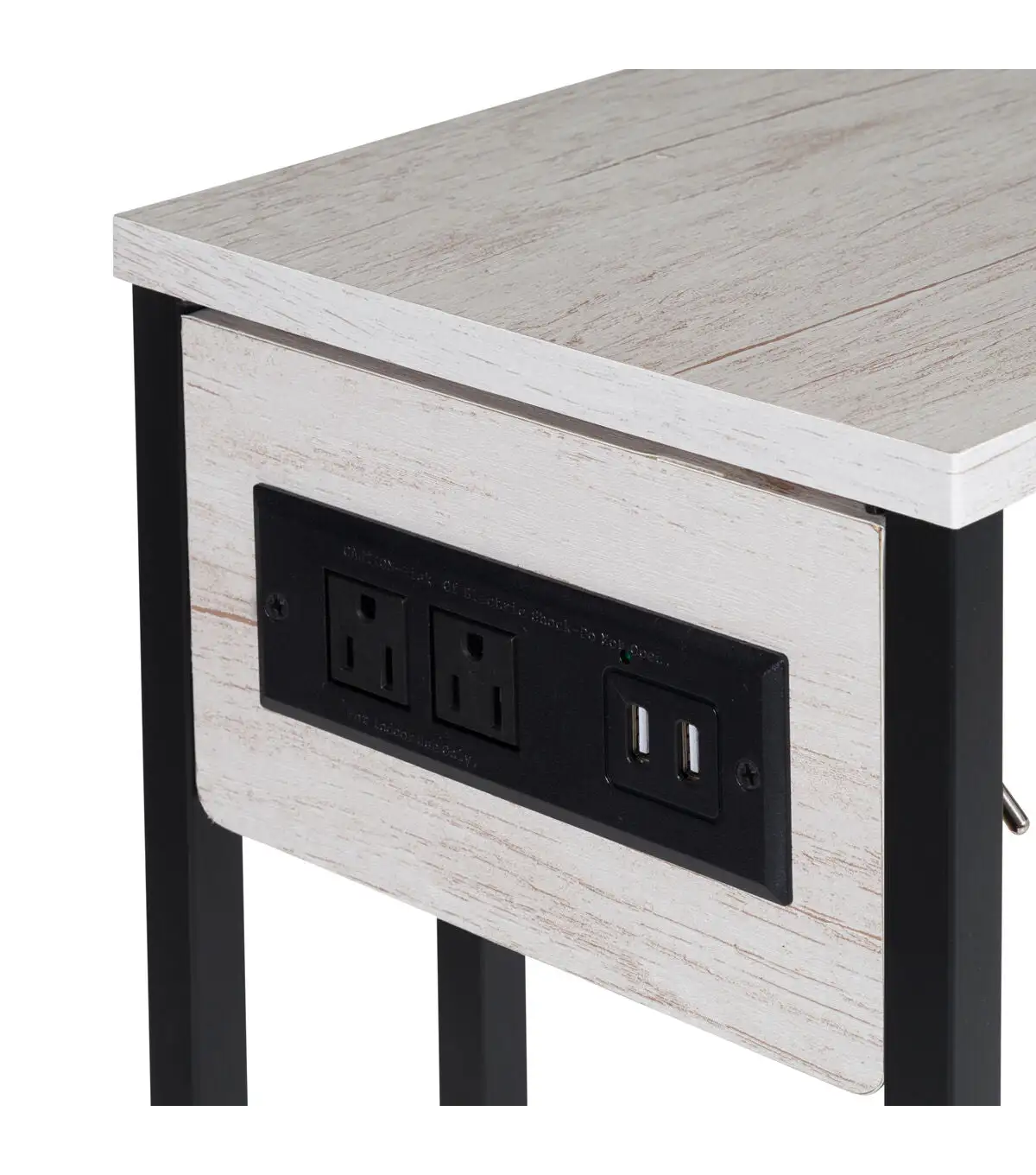 This c shaped side table is a modern Jack-of-all-trades. It not only looks stunning sitting beside a sofa with its weathered birch top and black metal legs, but it is a dream when it comes to everything from lounging to laptop work. 4 easy-glide caster wheels and a generously sized 9'10' power cord allow you to wheel this beauty wherever you need it while keeping your electronics charged and at the ready. It features a duo of hidden power outlets and USB charging ports on the back plate, ensuring that they aren't an eyesore while eliminating the need to bend down to reach wall outlets. So your laptop and electronics will always be a cinch to plug in! Whether you're using this small portable table as a laptop desk on wheels, a chic accent table, or a charging station, it takes on any task with gusto and ease.