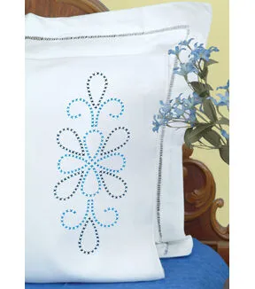 Stitch up a beautiful pair of pillowcases with this kit. The stitching design has been stamped using ink that washes away with any liquid and the fabric is a cotton/poly blend broadcloth. This package contains two standard size pillowcases, instructions for completion and care, and complete DMC floss requirements. Hoop, needle, and floss all sold separately. Design: XX Design. Made in USA.