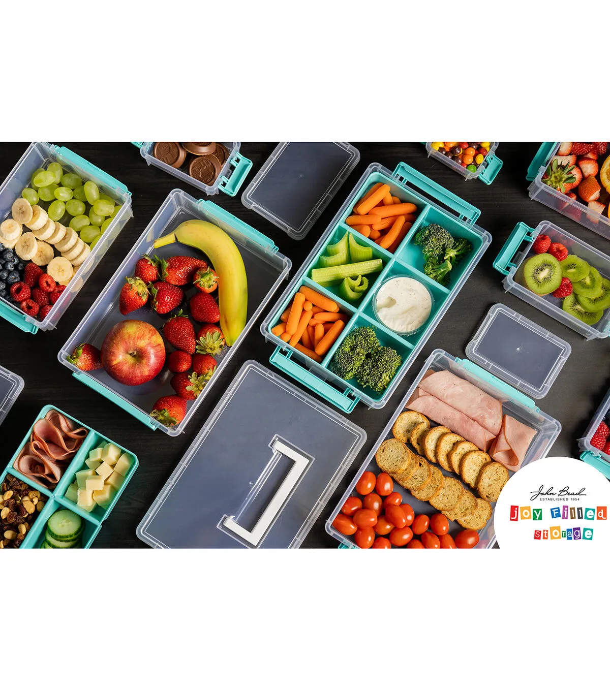 - The food grade containers can hold a large quantity, and variety of food with the separate compartments making party clean up smooth, quick, and easy. The pop of turquoise on the lids of these clear containers, as well as the aesthetically pleasing linear stacking of same sized containers will look excellent in the fridge or pantry.